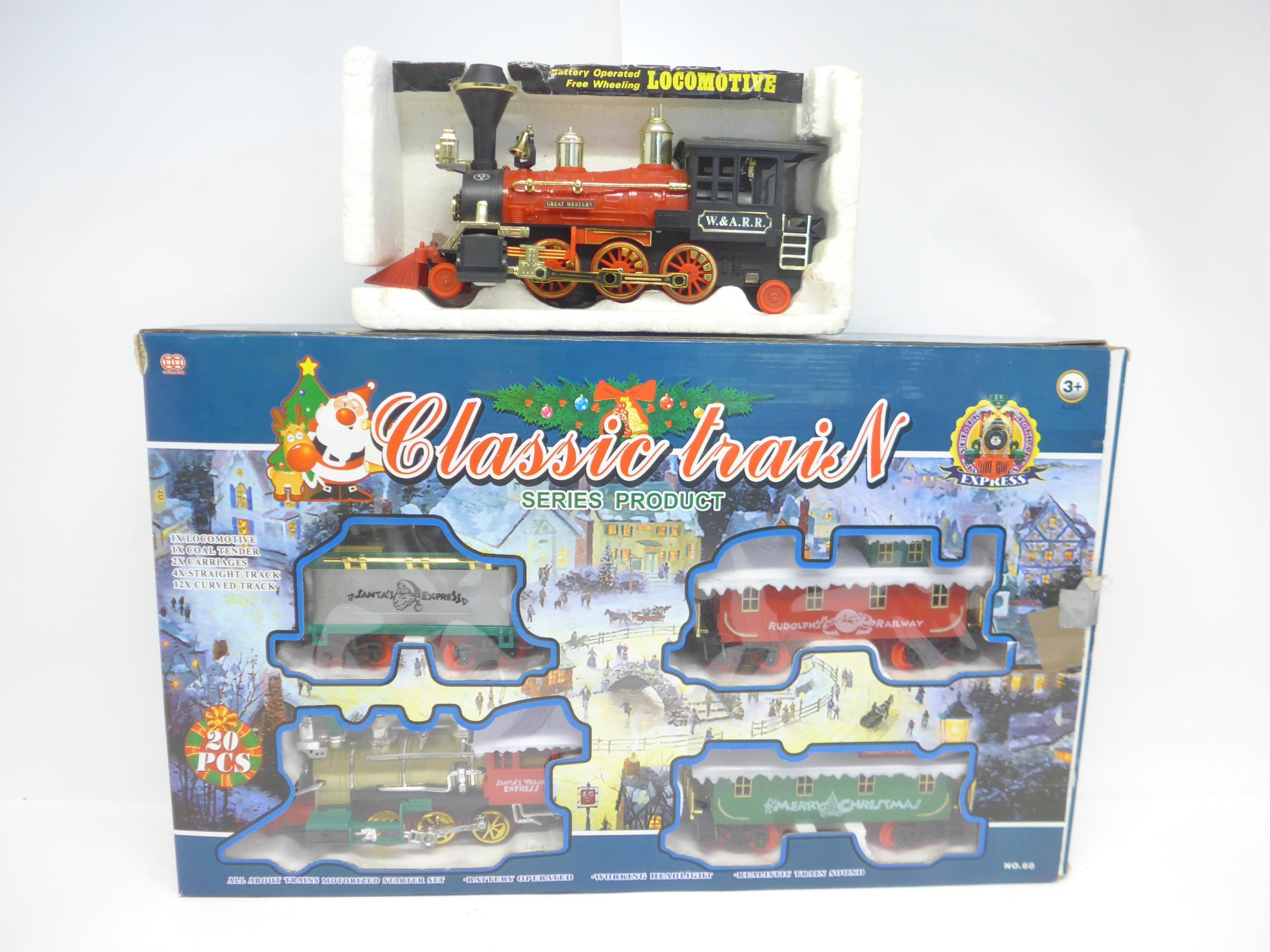 A boxed Double Coin 'Santa's Village Express' battery operated Christmas train set. Together with an Old Smokey battery operated locomotive (2)