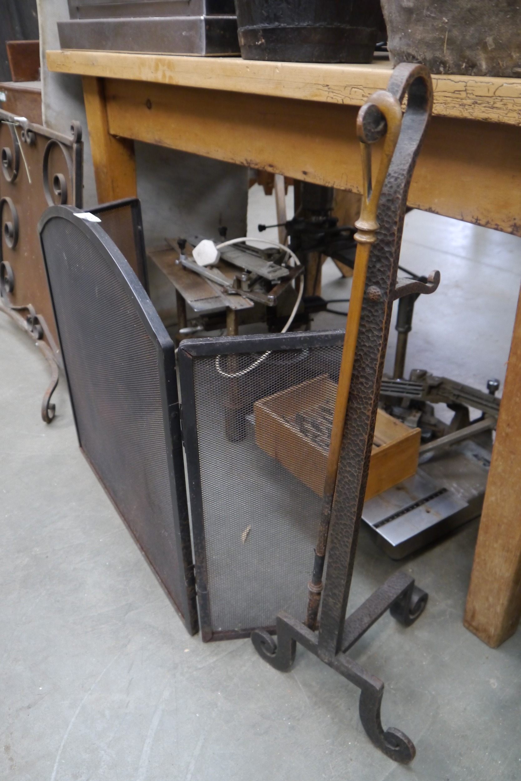 A wrought iron poker stand and a three fold fire guard