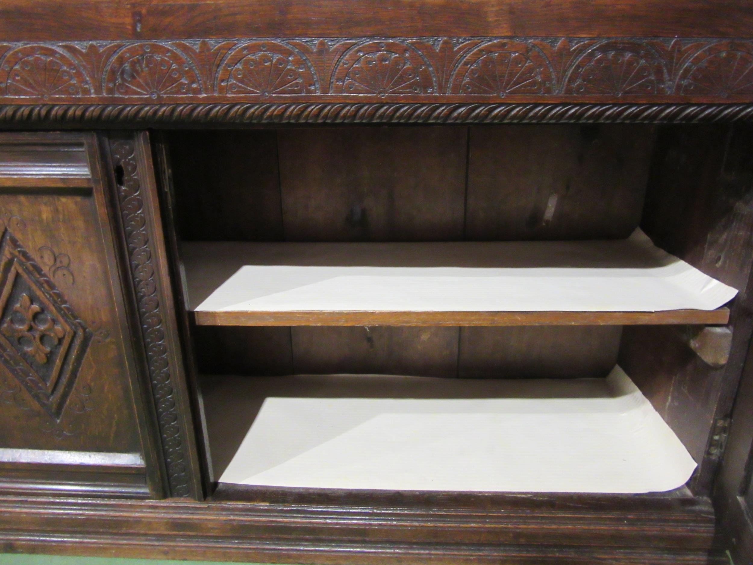 A Georgian "Bwyhyn" Welsh oak dresser of small proportions with carved decoration raised on open shelves over a rising table leaf and open shelf over a two door cupboard with key, 144cm tall x 126cm wide x 32cm deep (not including rising leaf)
