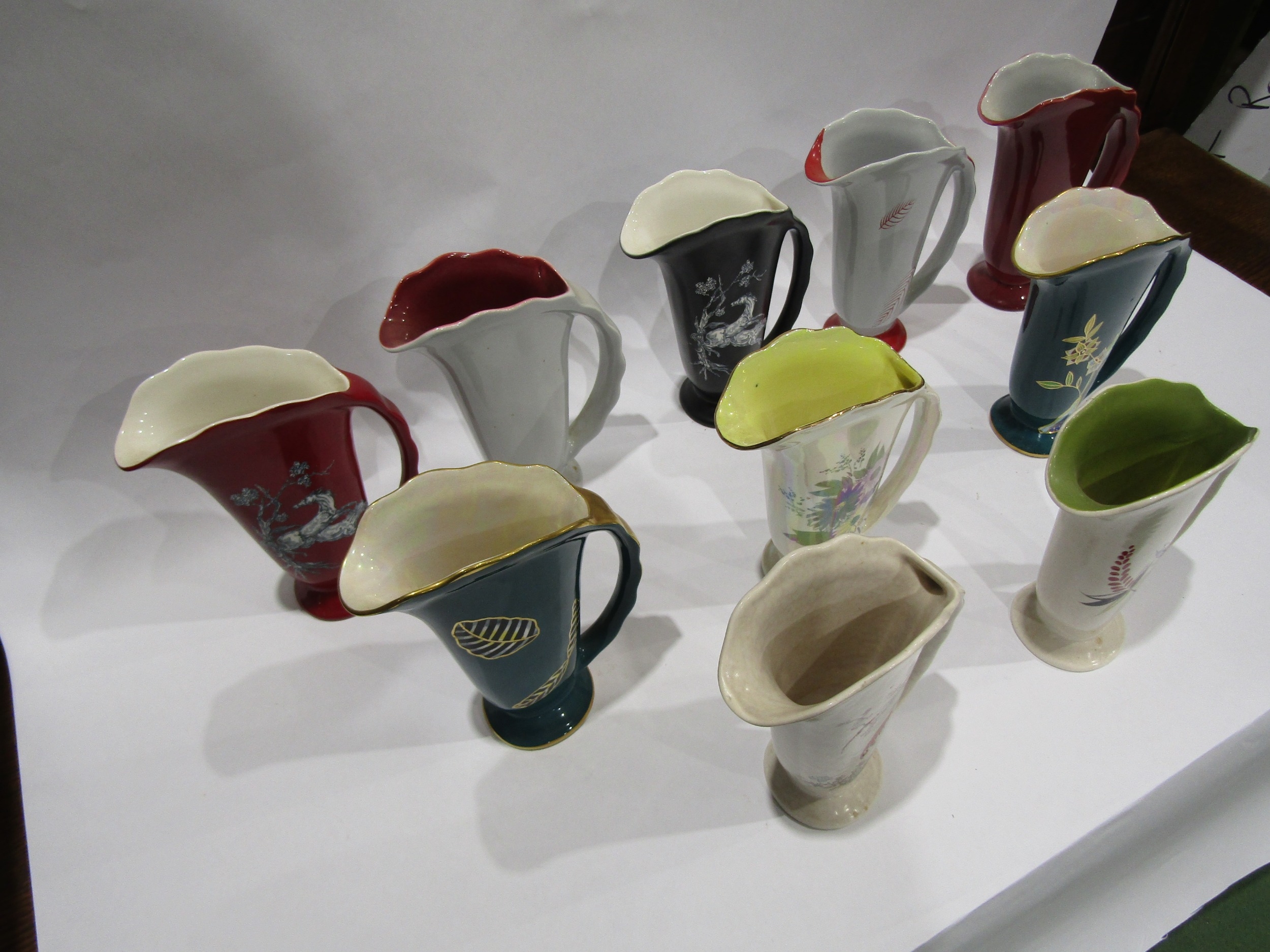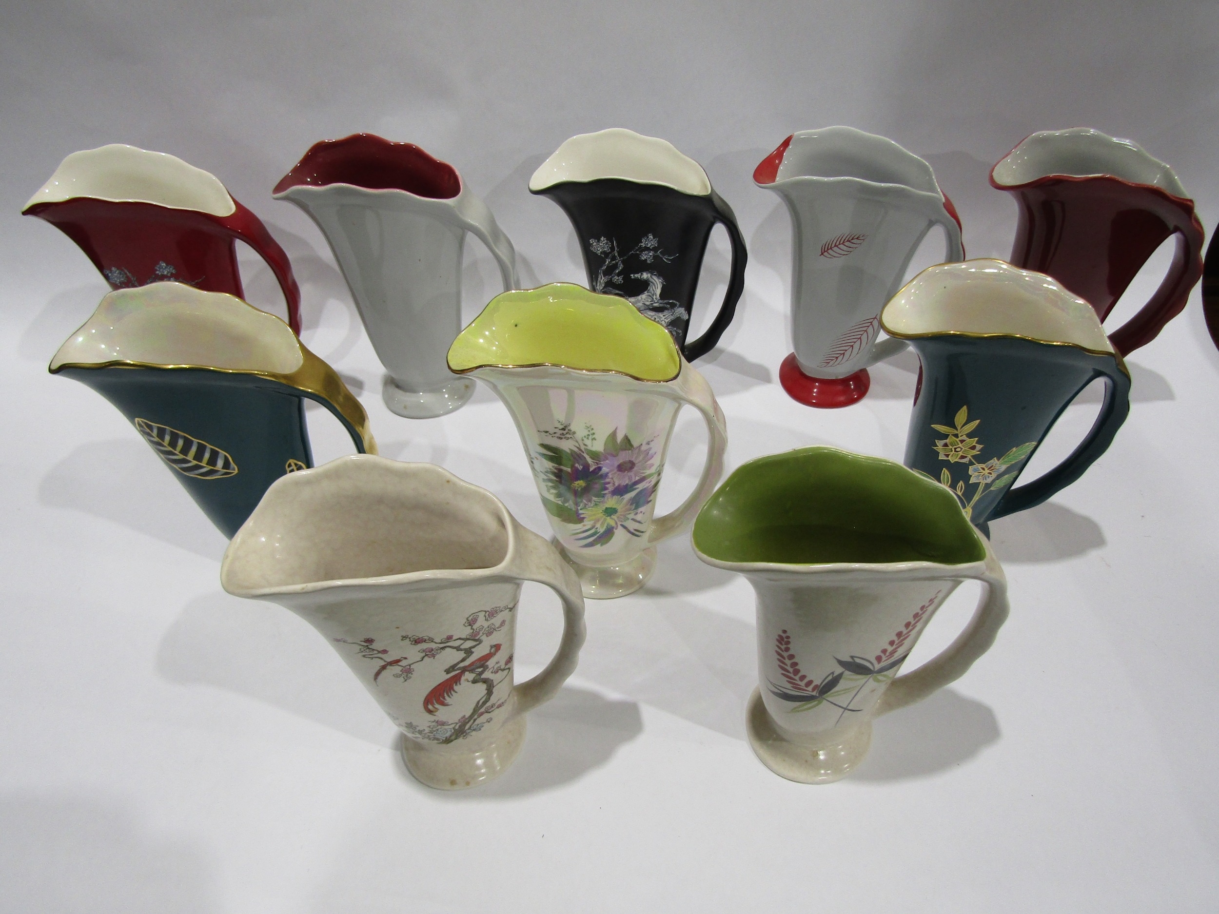 Ten Crown Devon A550 jugs, plain red, purple and yellow flowers on beige, Pegasus on red, red and black flowers on cream, plain grey, red bird, Pegasus on black metallic flowers on green, red leaves on grey and gold leaves on green (10)