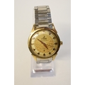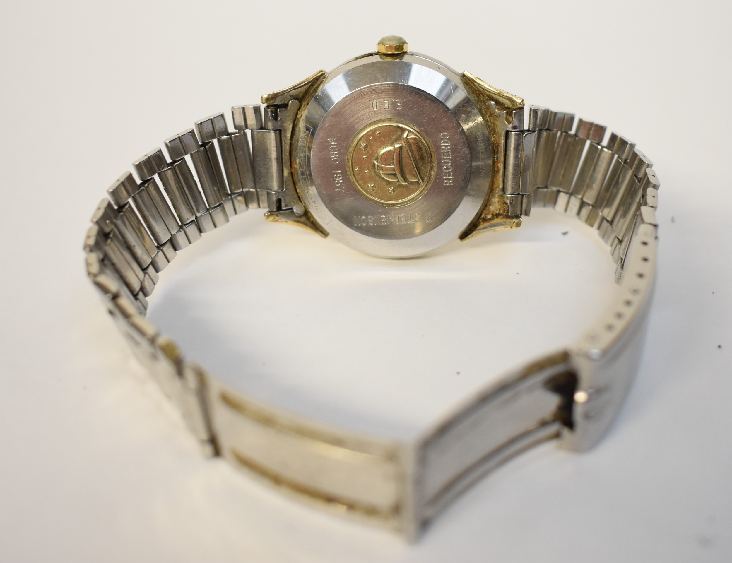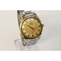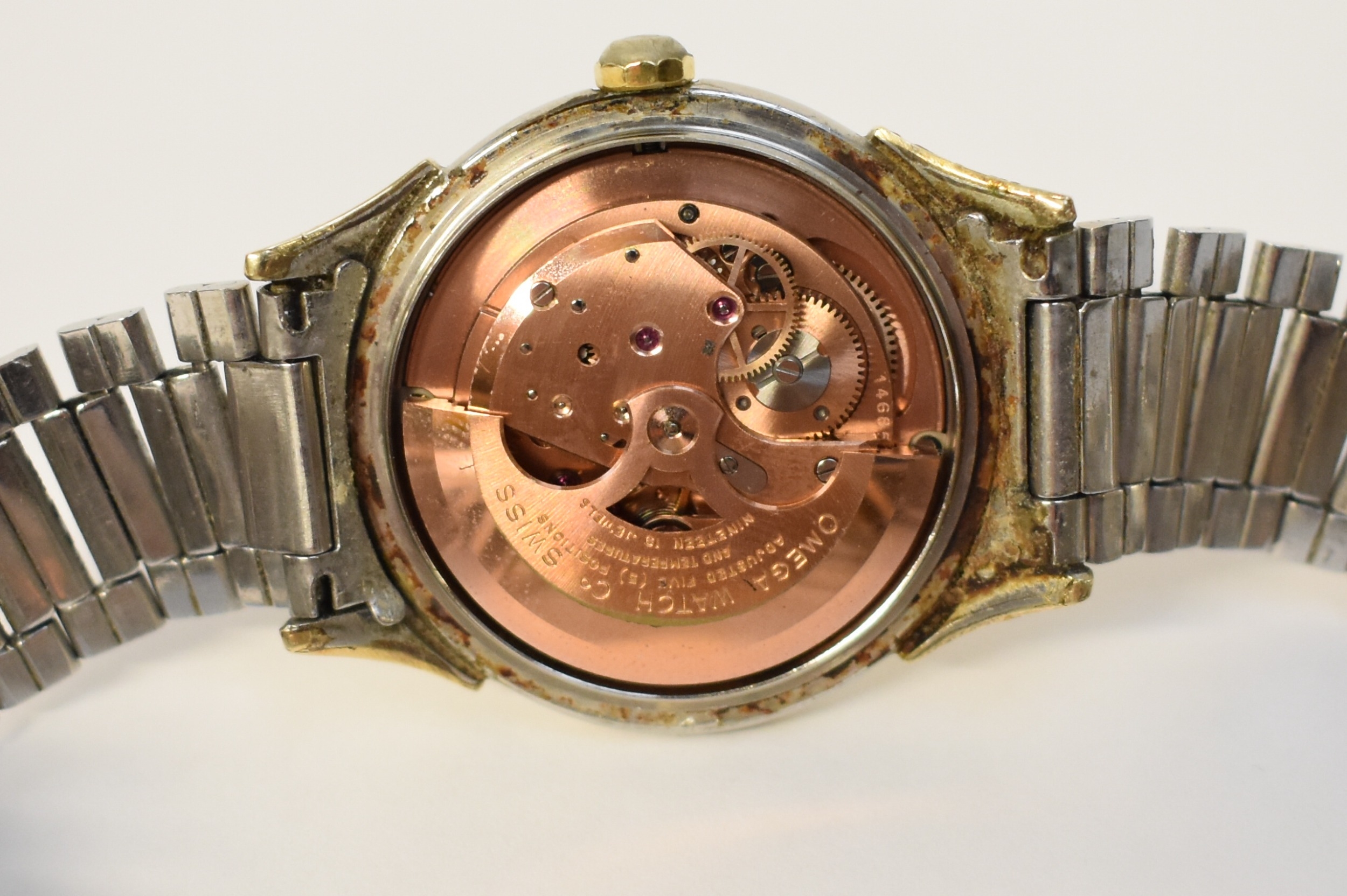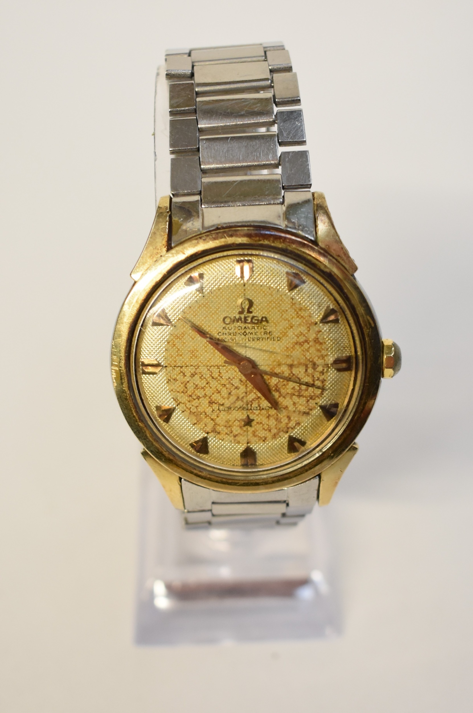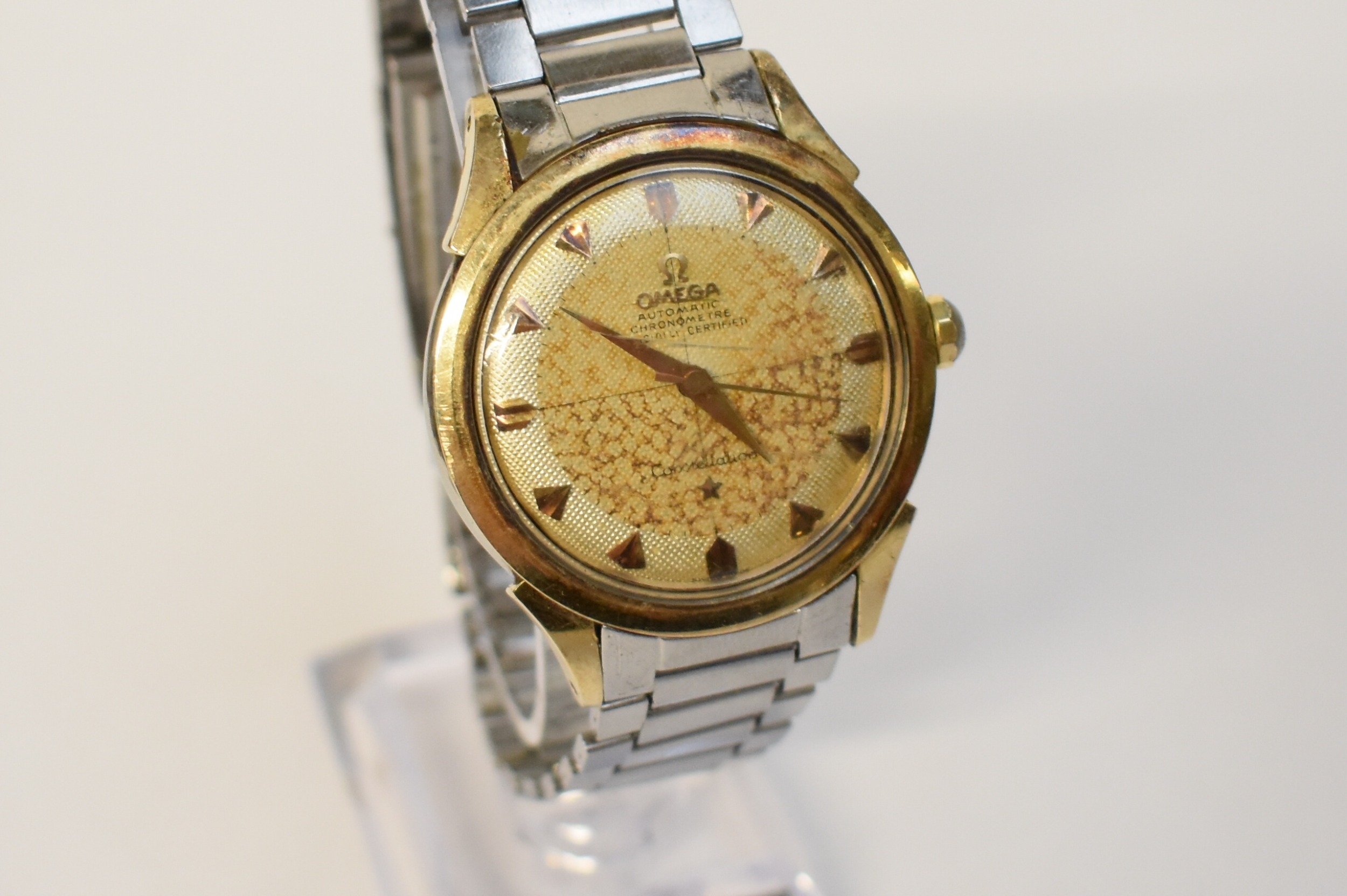 OMEGA: A gentleman's stainless steel cased Omega Constellation automatic wristwatch, gilded dial case, two tone honeycomb dial having gilt arrow markers, hands and centre seconds, on the Omega bracelet strap numbered 7912, case back engraved "M. STEPHENSON RECUERDO E.E.D MCBO 1957".