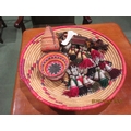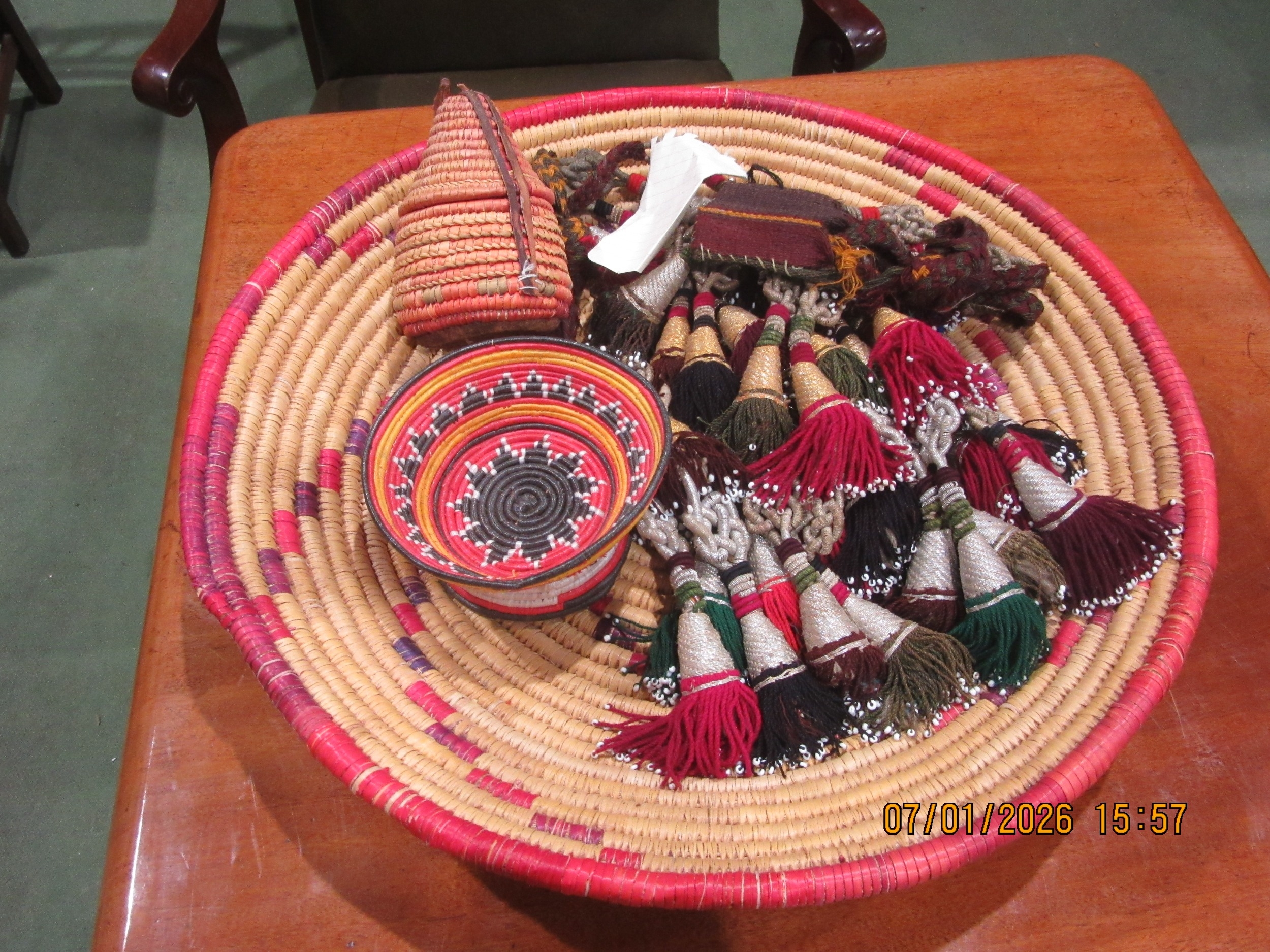 A pair of Yemeni hair adornments, a woven lidded pot, bowl and large dish
