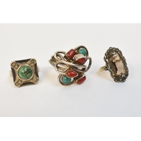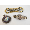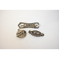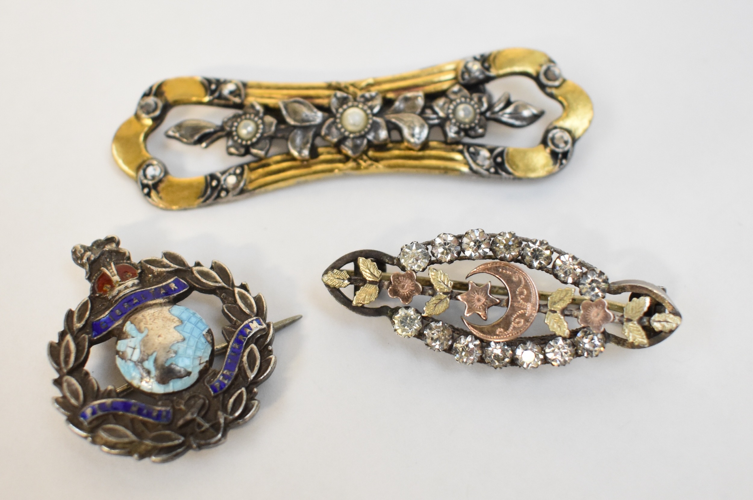 Three brooches, floral form and world. Longest 6cm