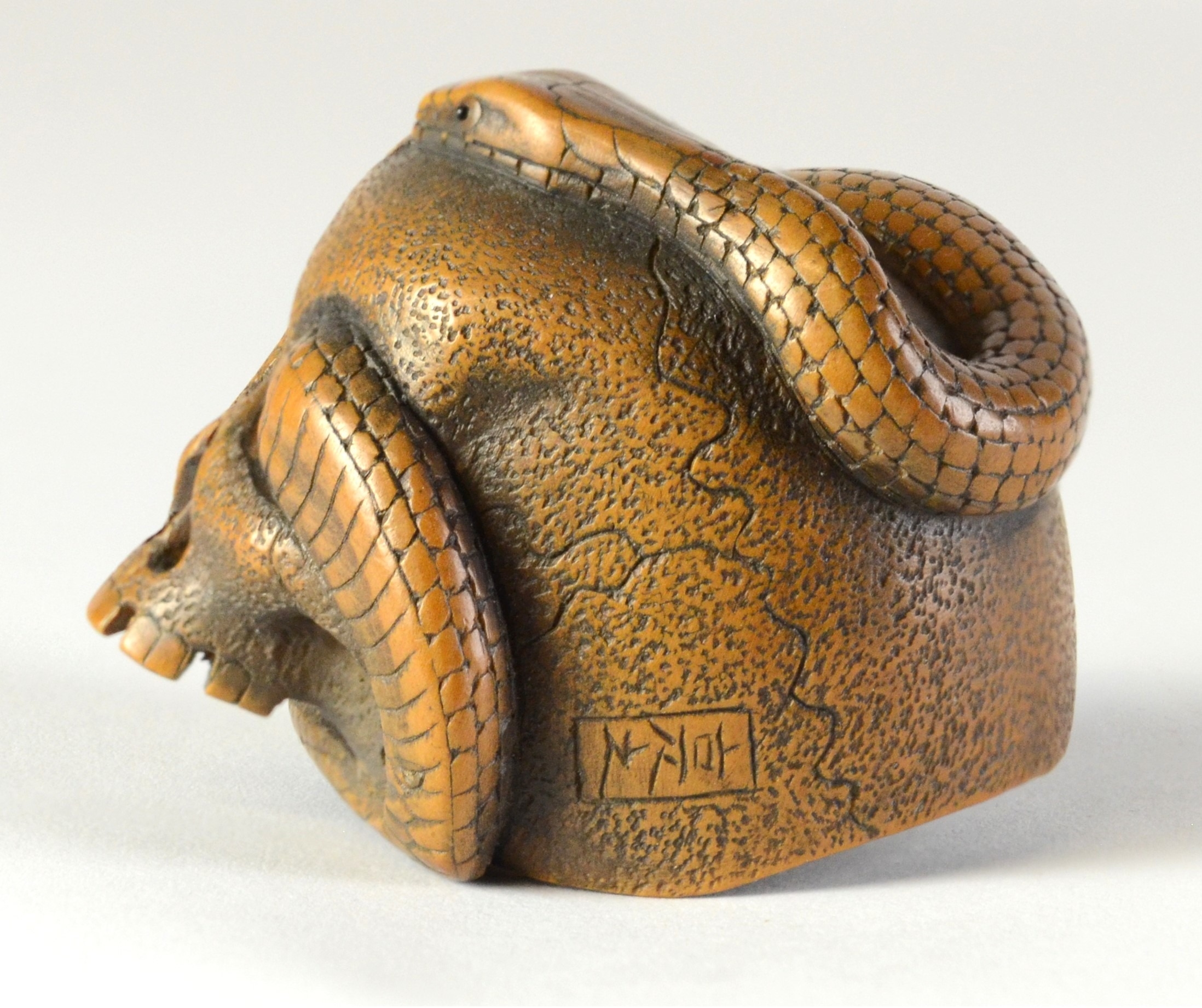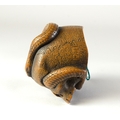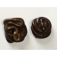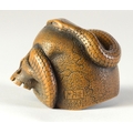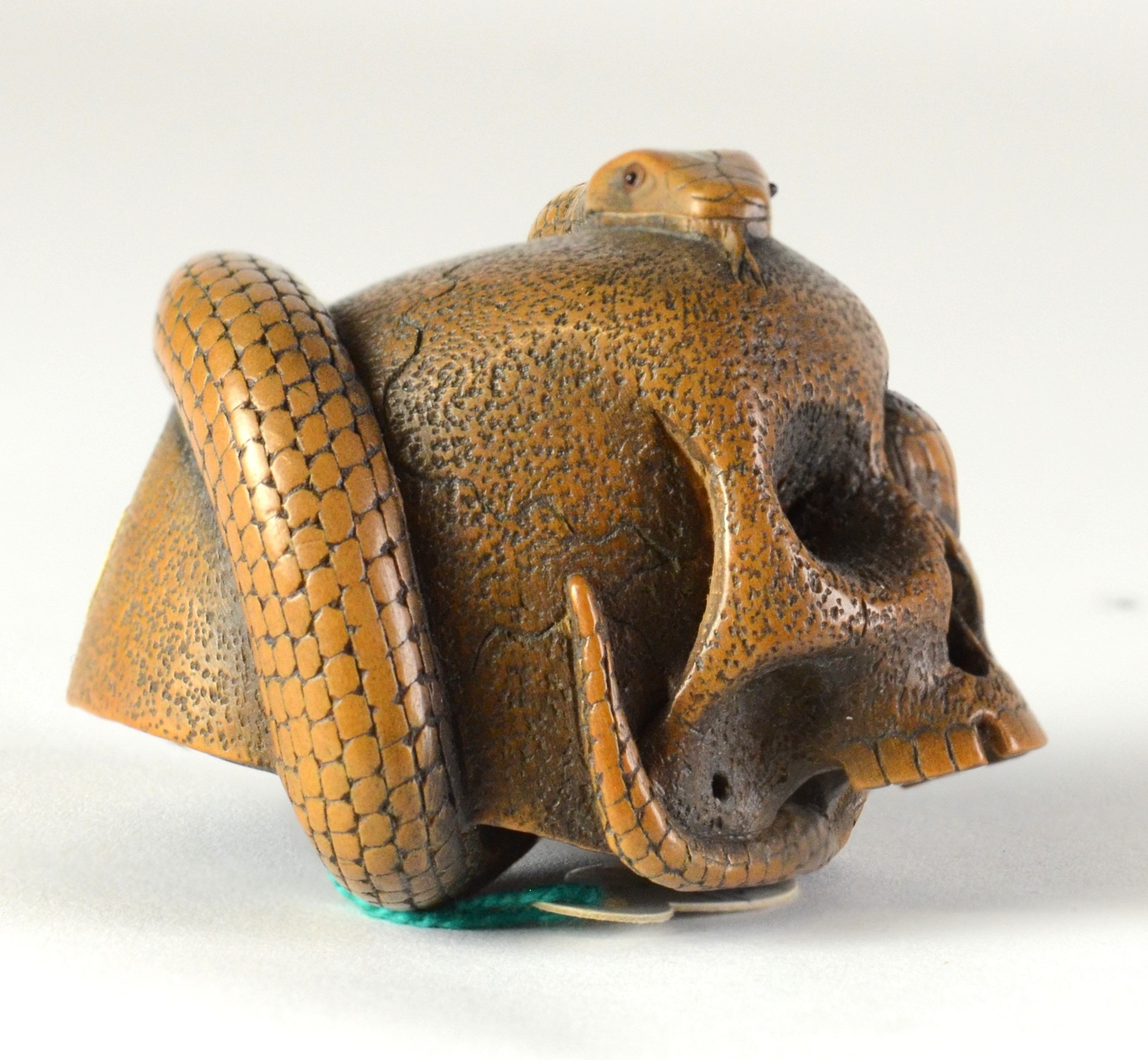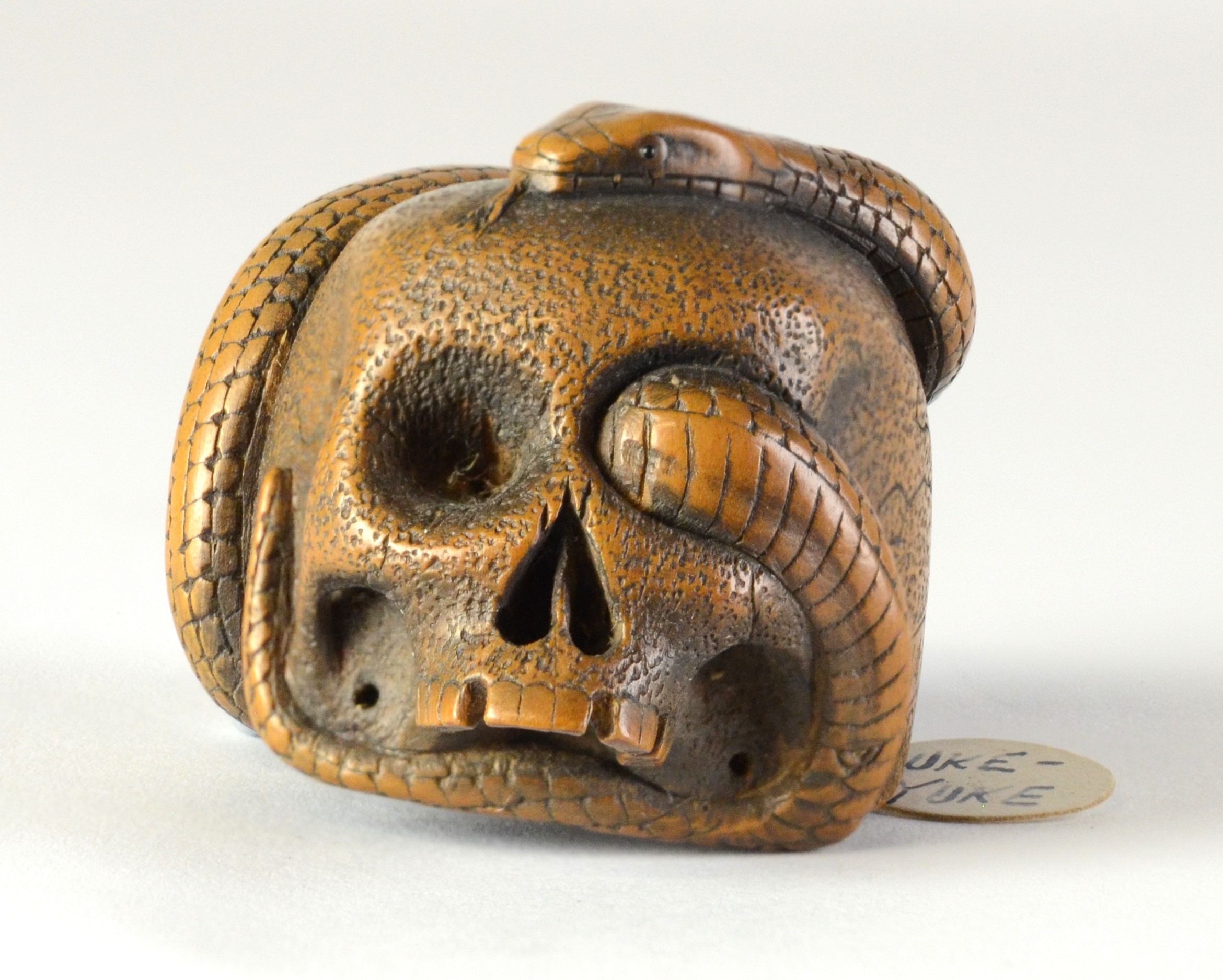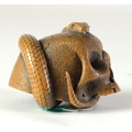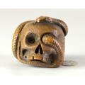 SUKEYUKI: a wooden netsuke of a skull and snake, signed to right of skull3.2cm wide, 4.2cm deep and 3.2cm highProvenanceDorothy Ann Stevens Collection no.277Bought from Norton October 1954