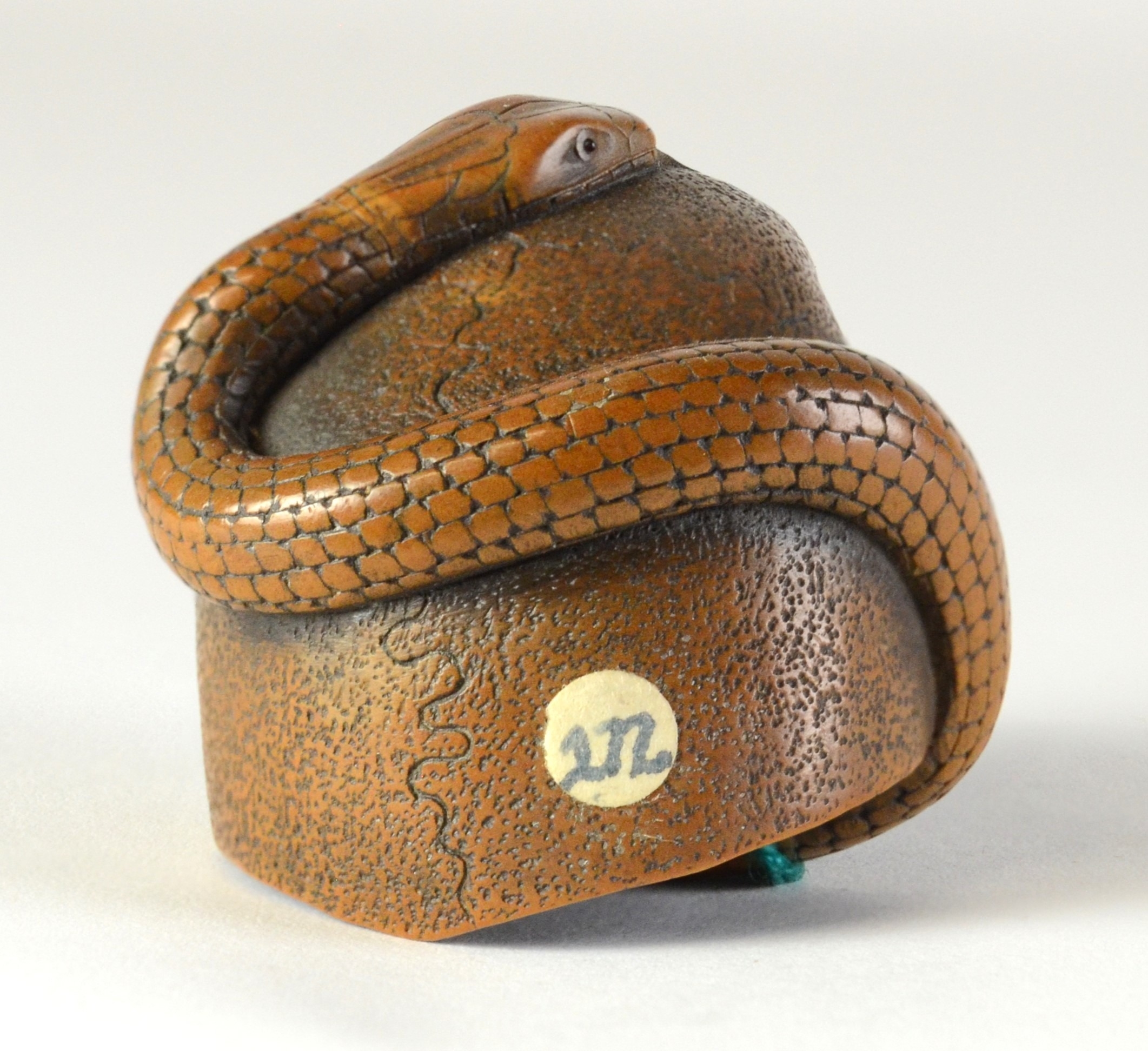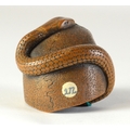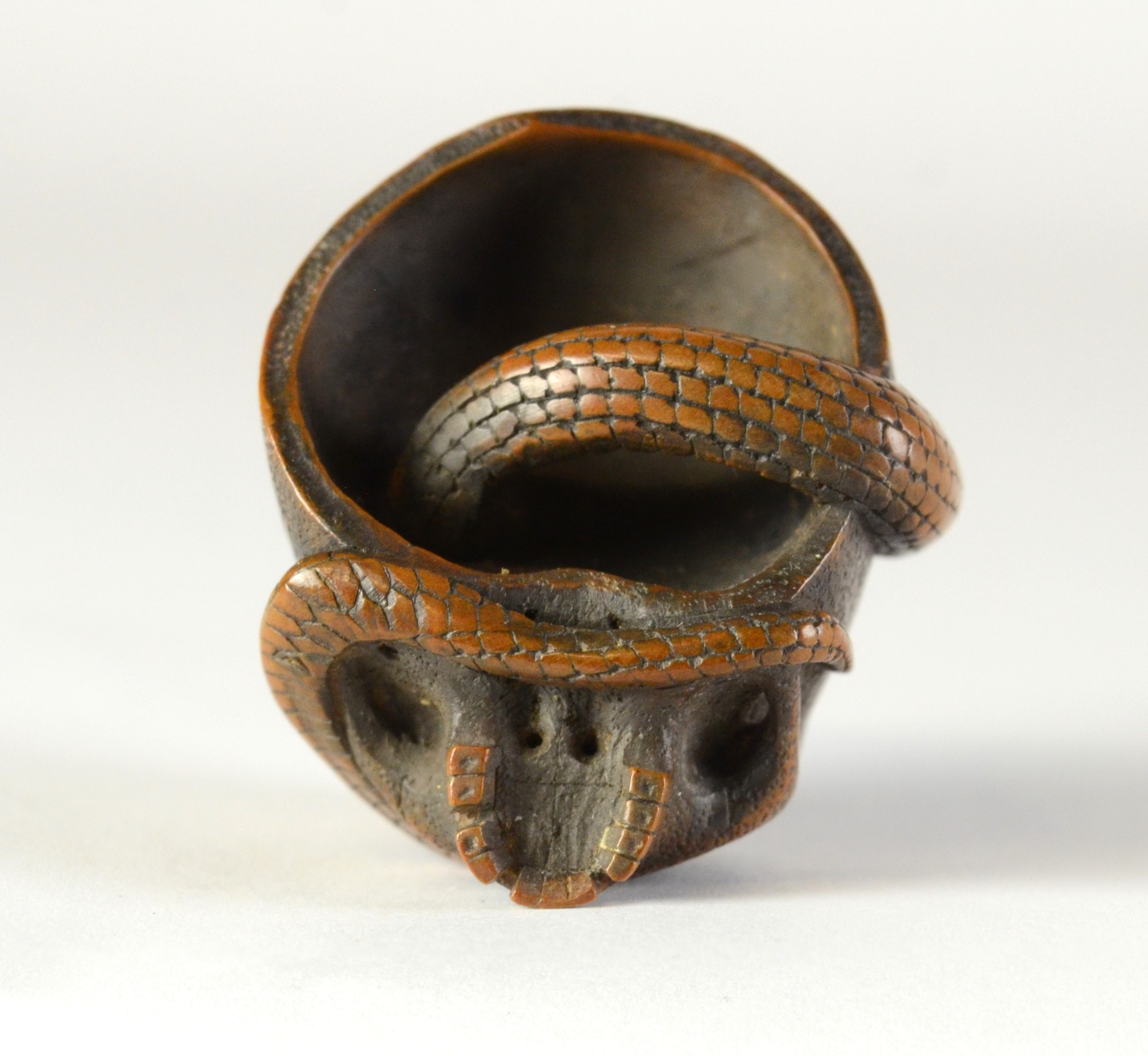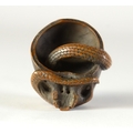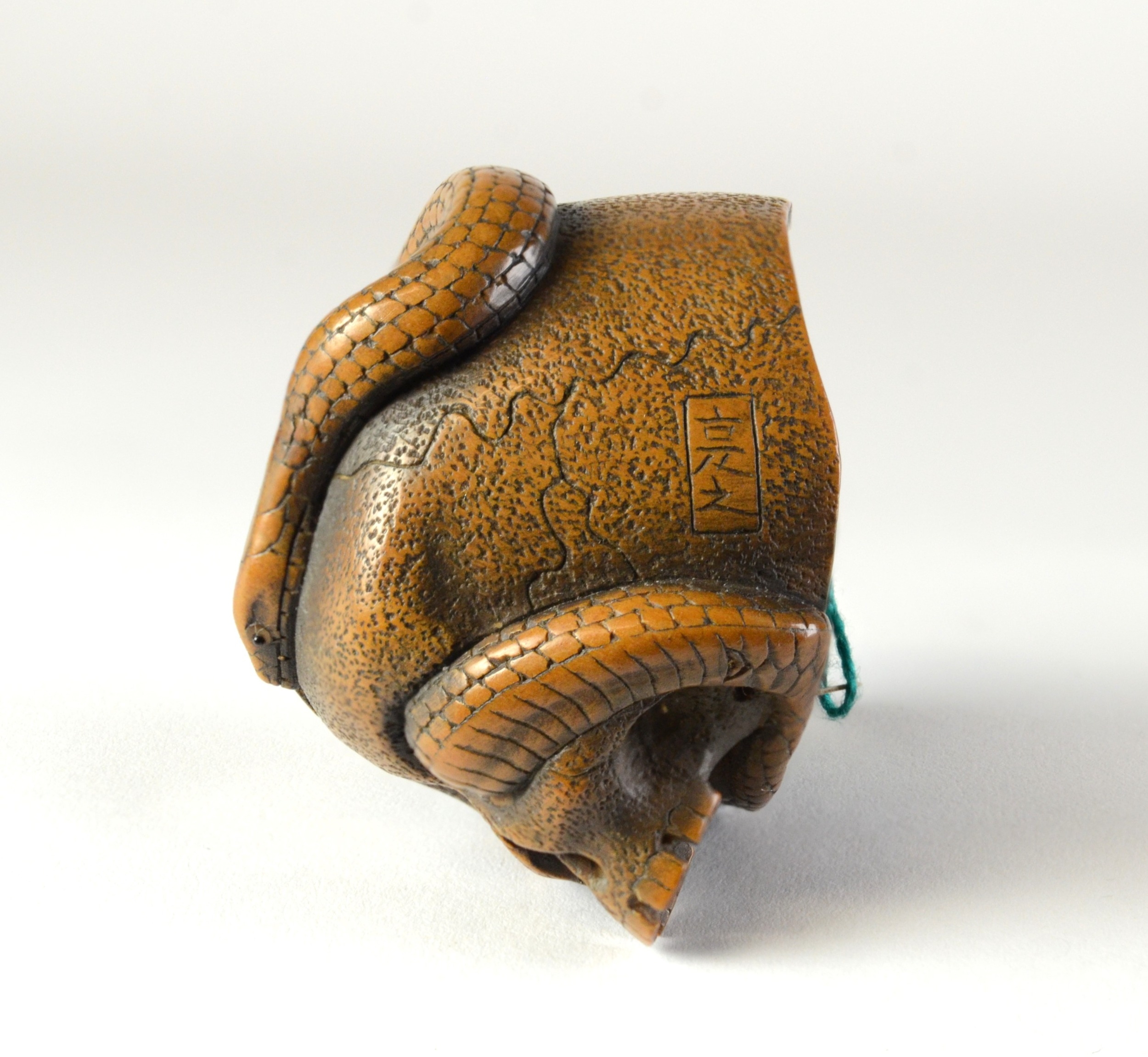 SUKEYUKI: a wooden netsuke of a skull and snake, signed to right of skull3.2cm wide, 4.2cm deep and 3.2cm highProvenanceDorothy Ann Stevens Collection no.277Bought from Norton October 1954