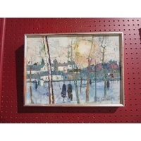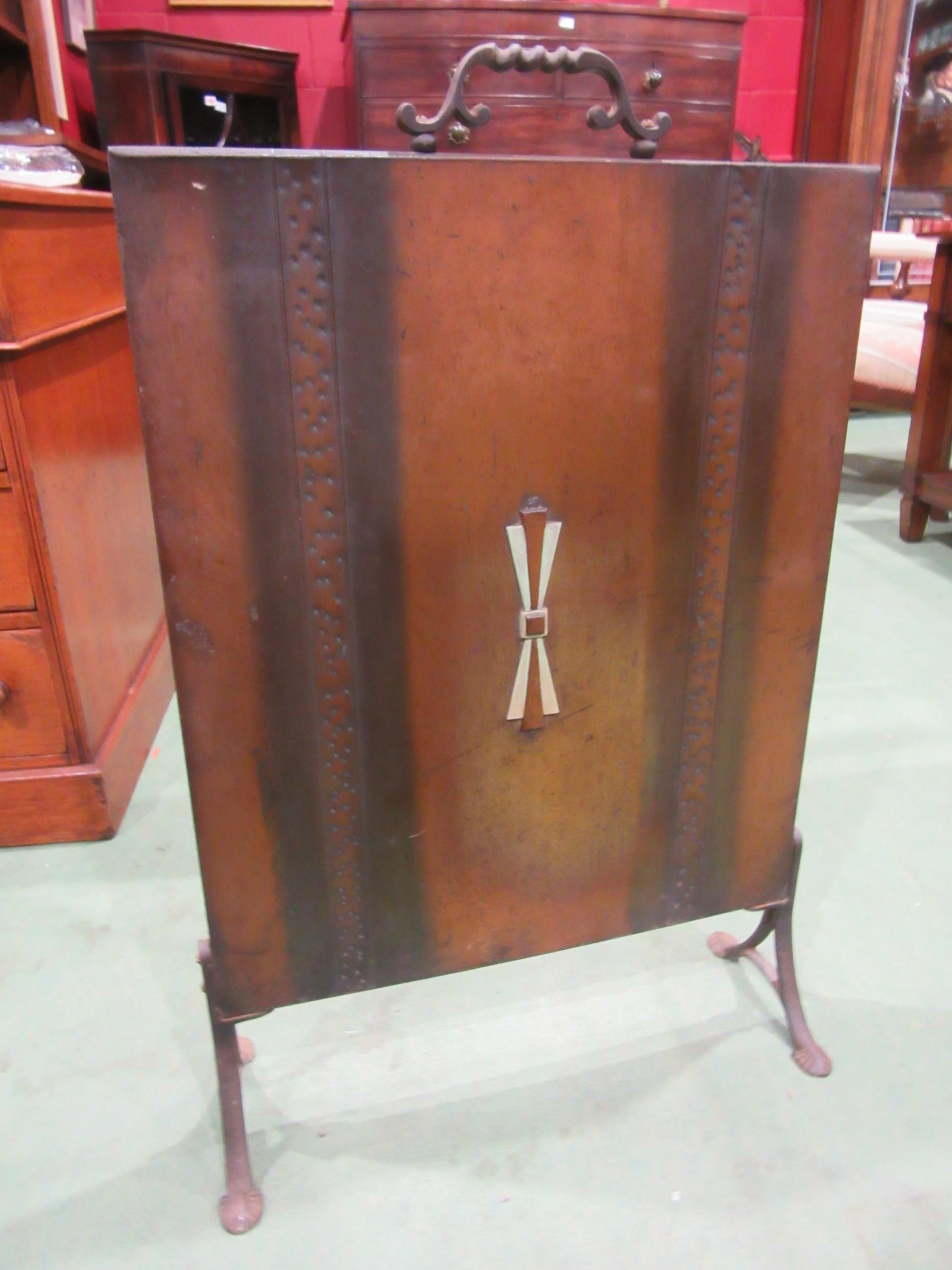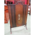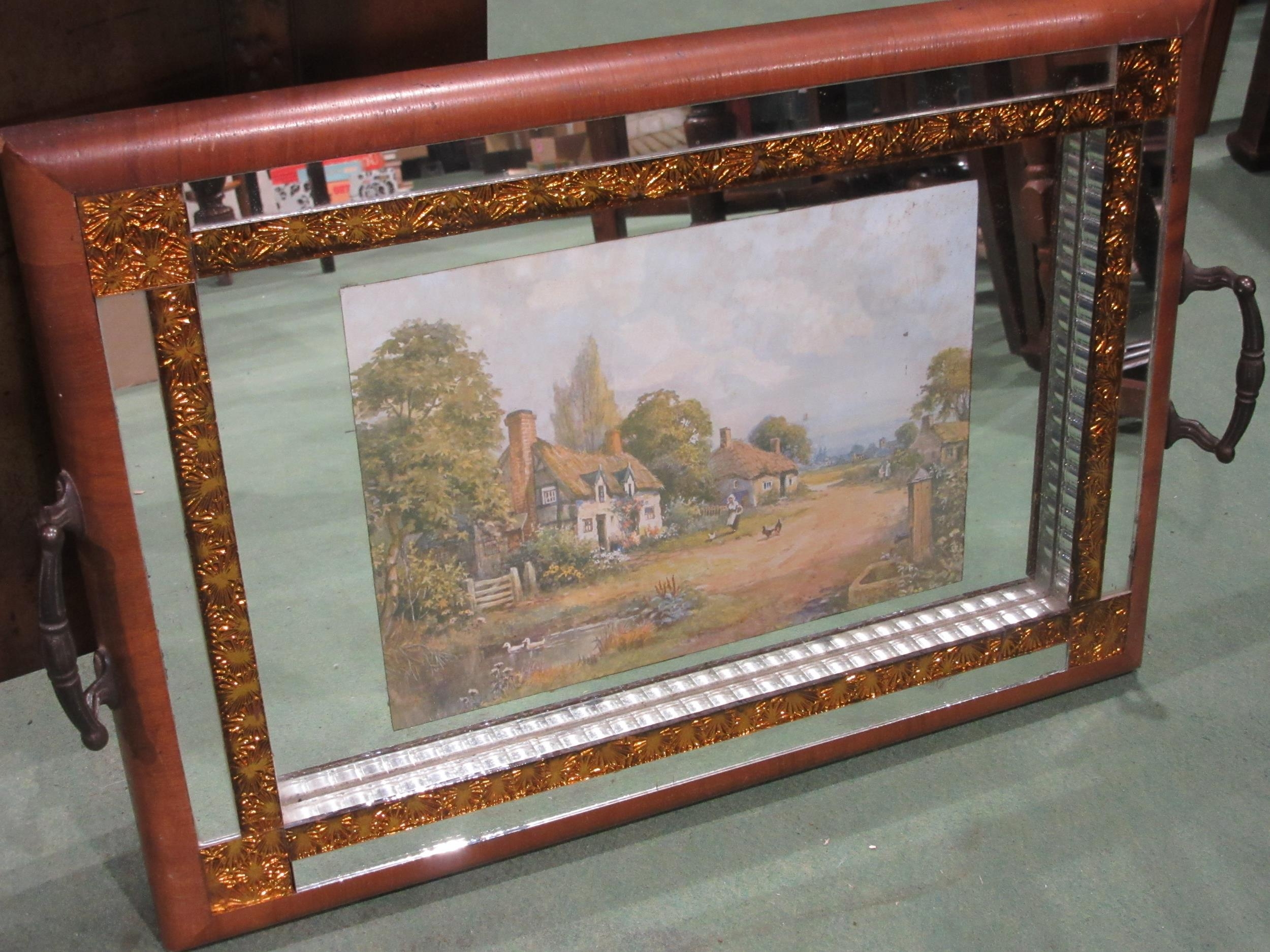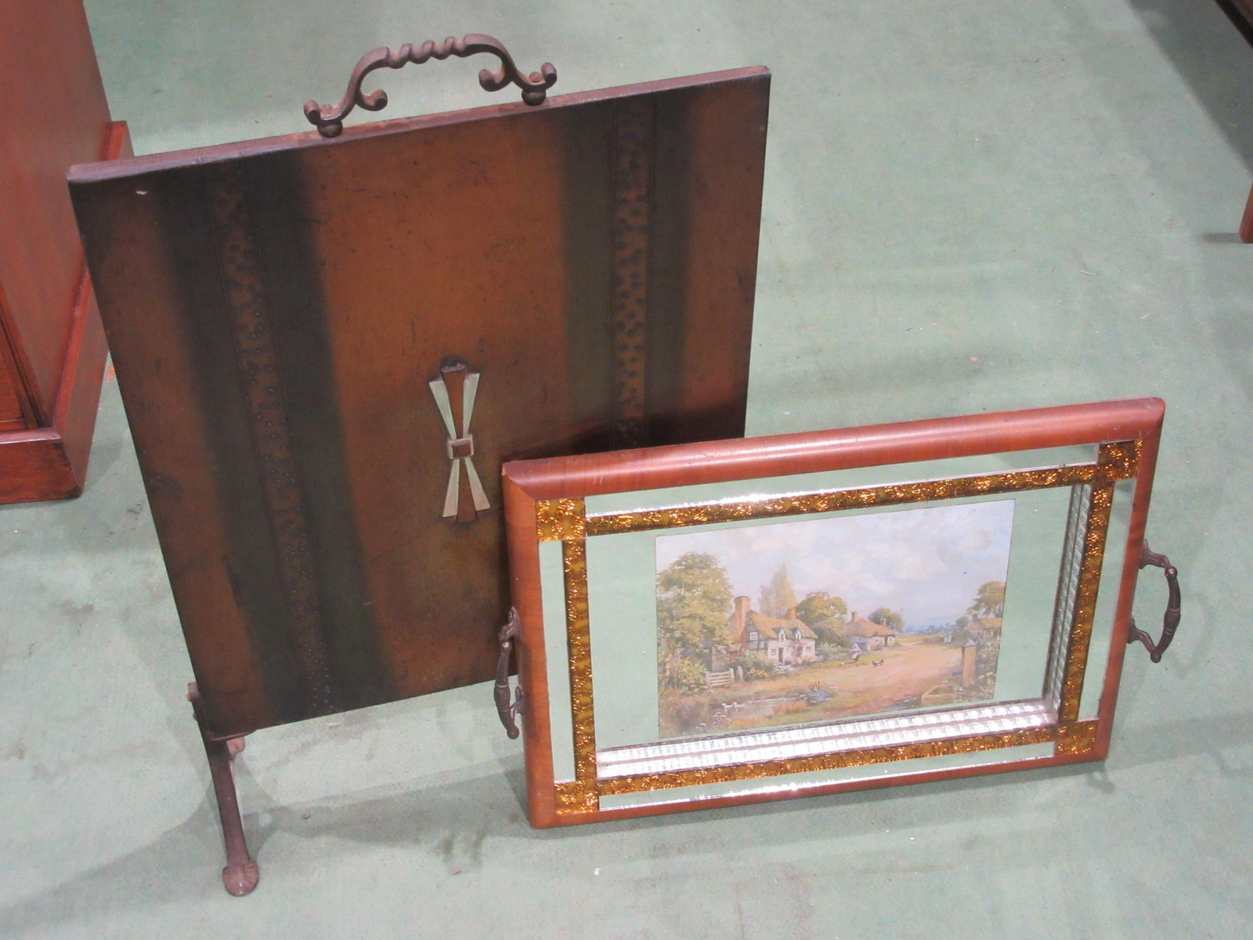 An Art Deco fire screen and mirrored mahogany tray with cottage scene and embellishments to border (2)