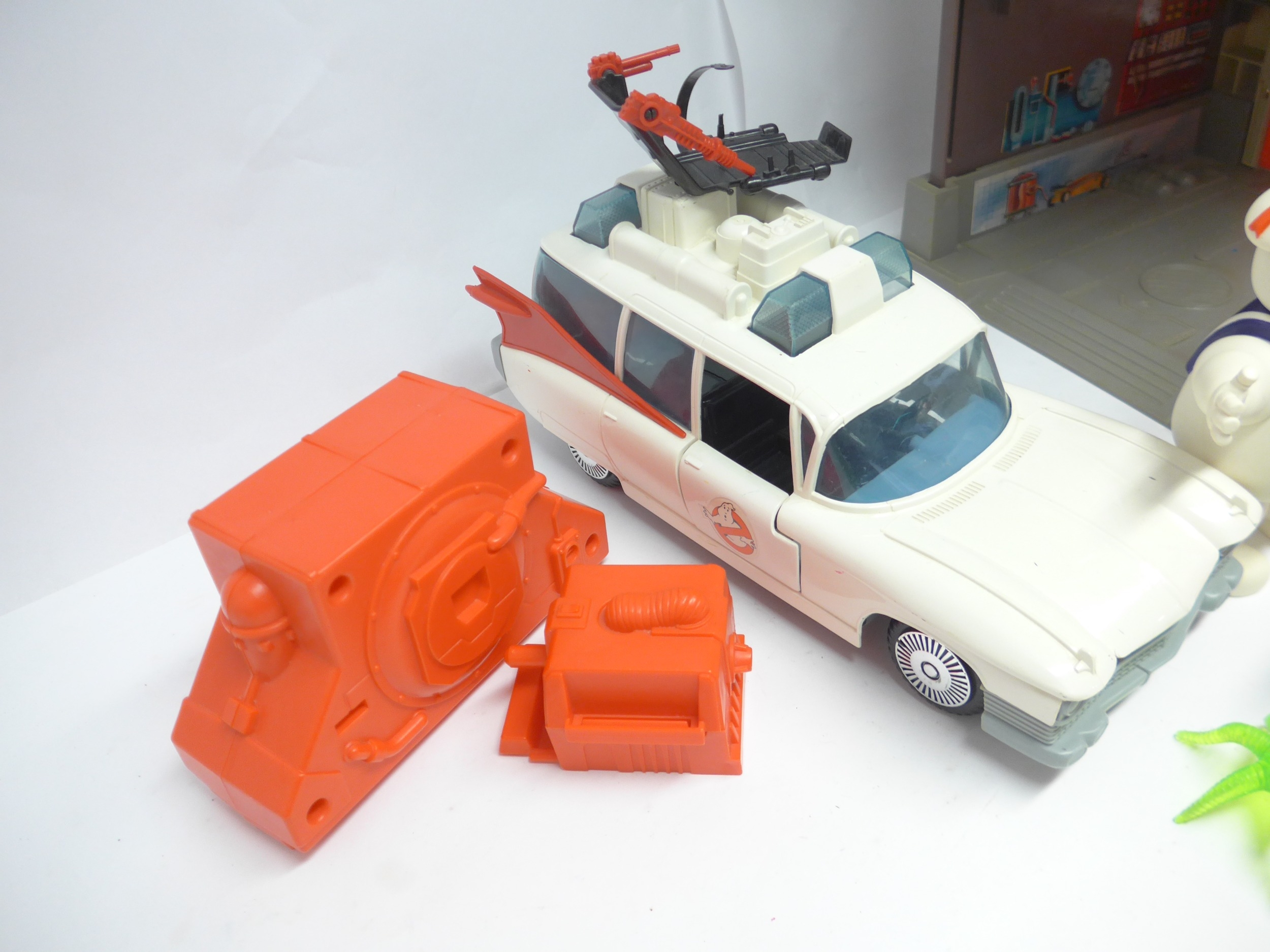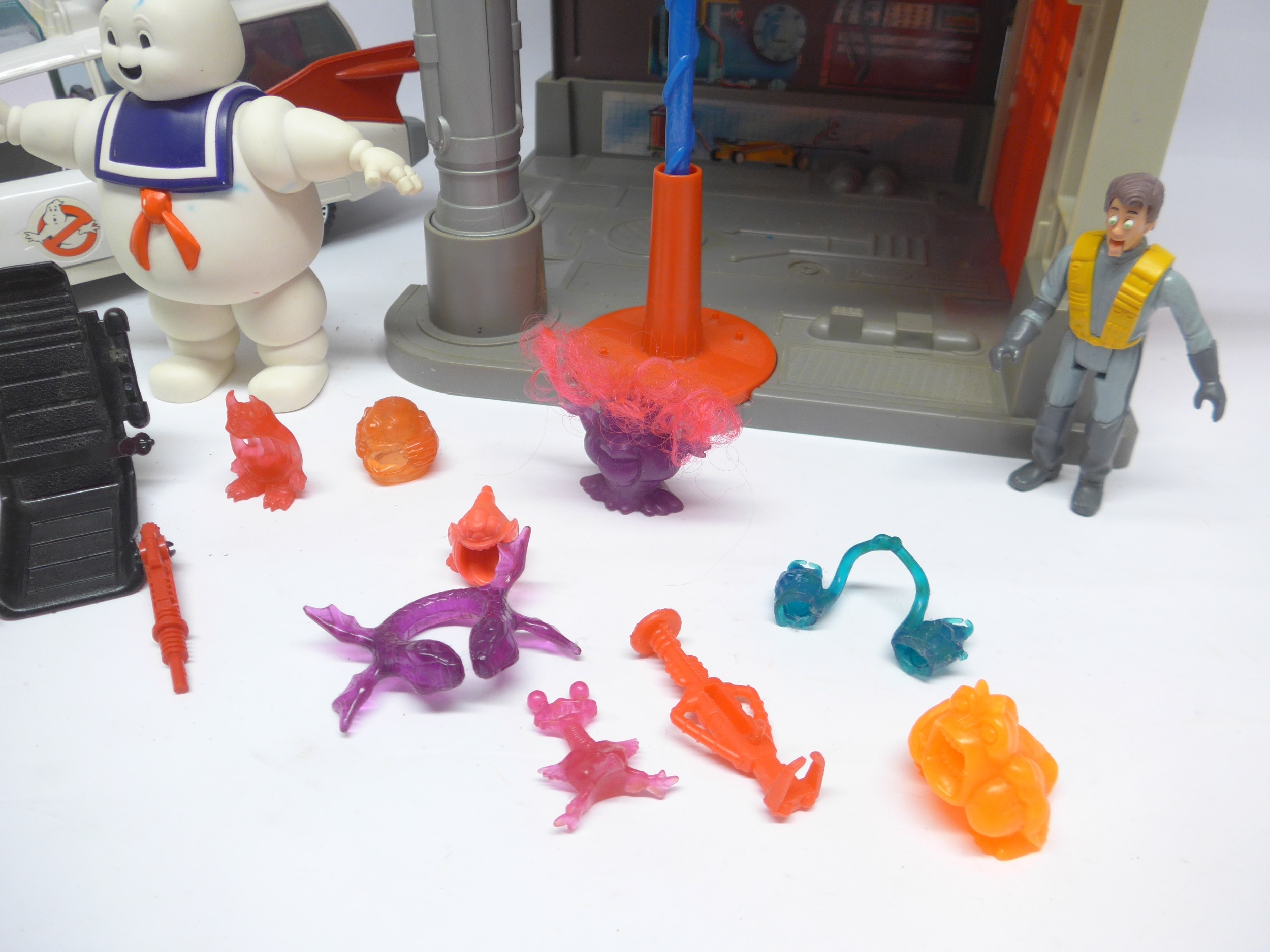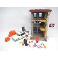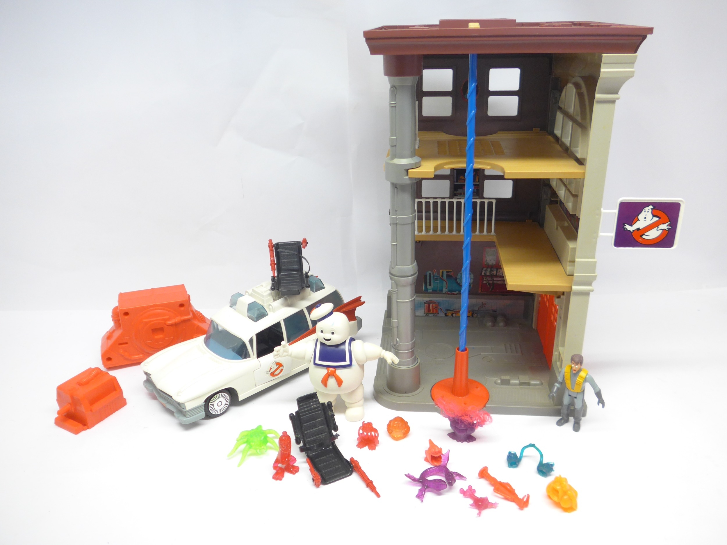 A The Real Ghostbusters Firehouse Headquarters playset, various figures including Staypuft Man and Fright Feature Peter Venkman, Ecto-1 car, etc.