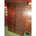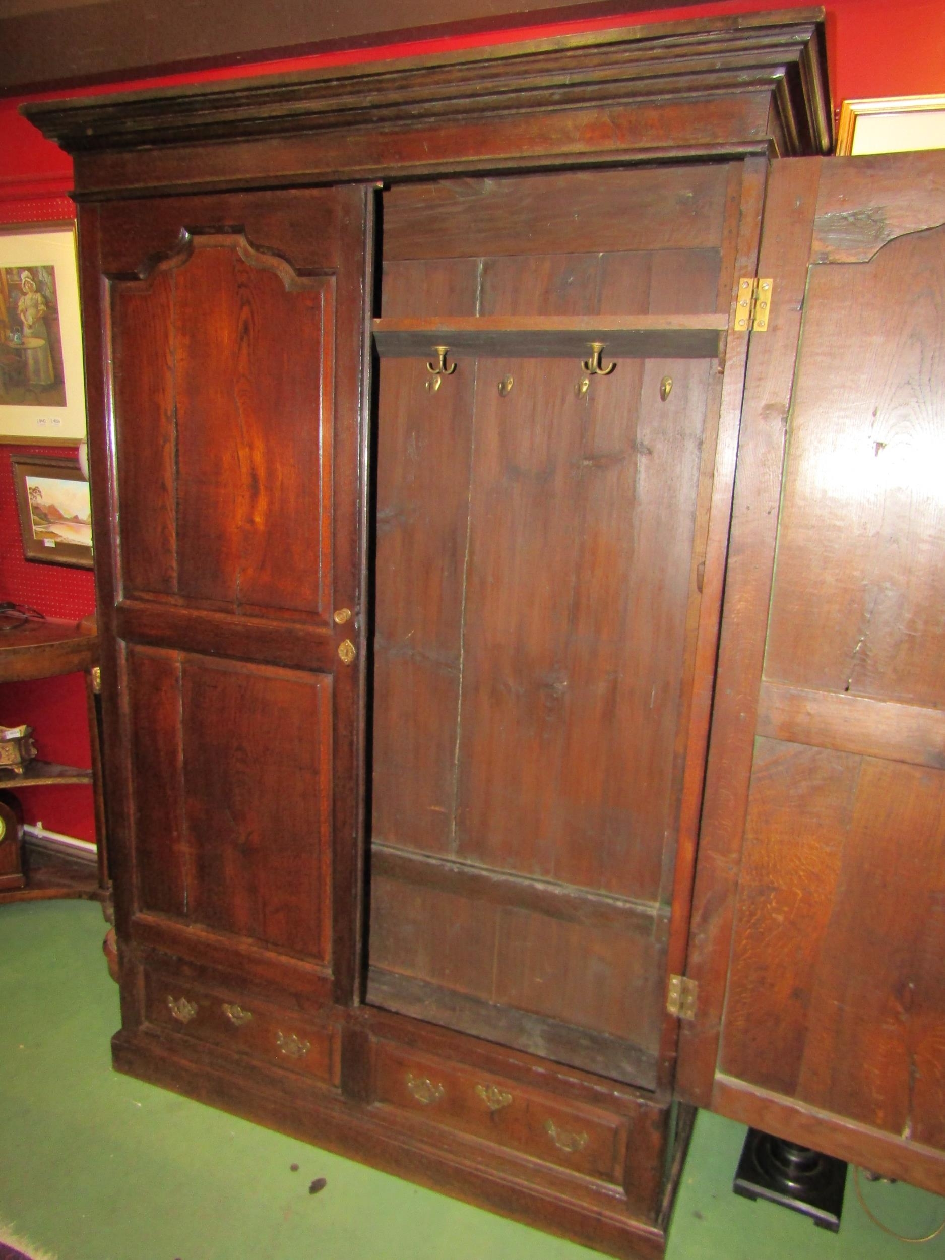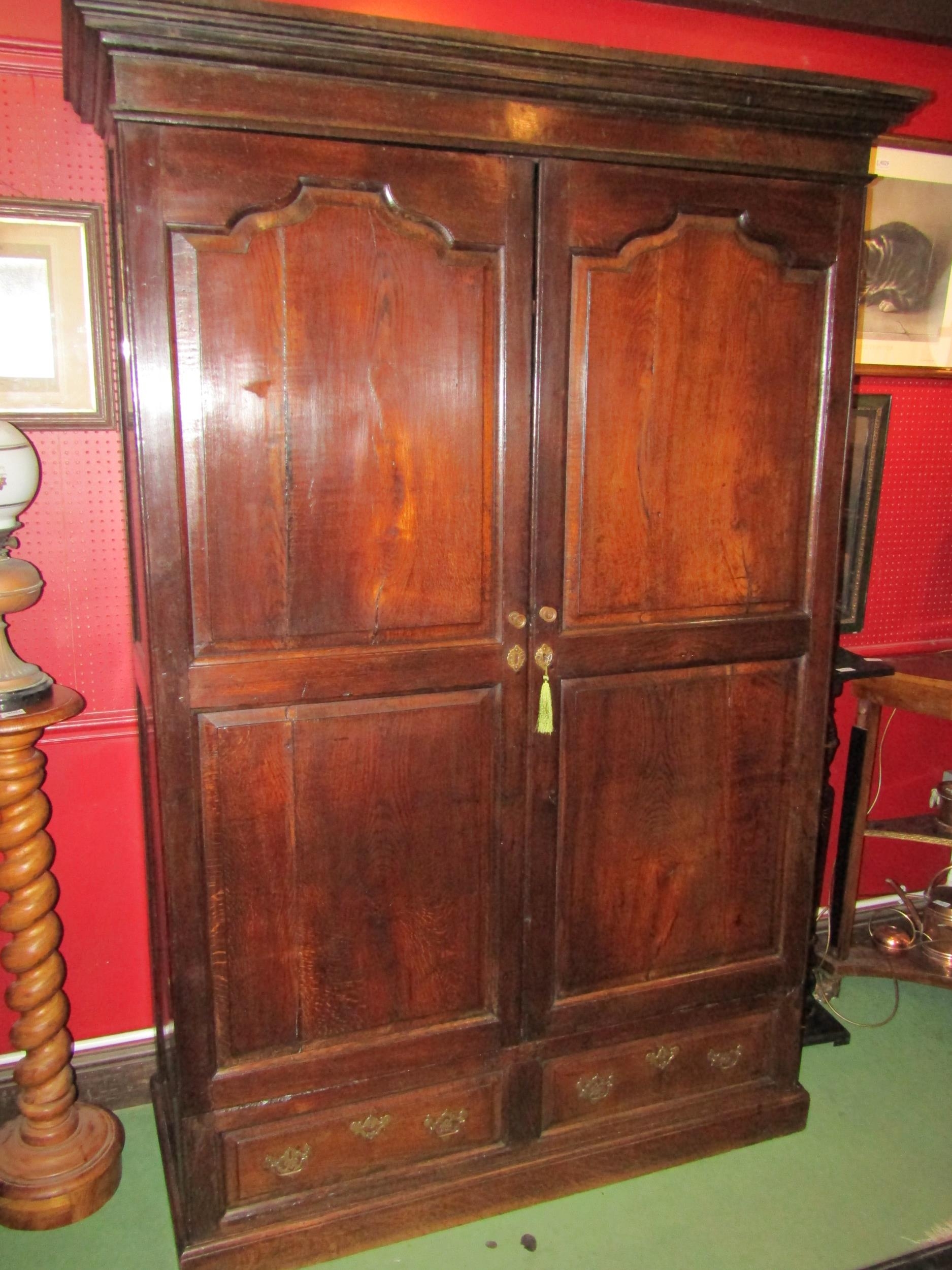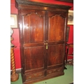 A circa 1800 and later French panelled oak armoire, the fielded panel two doors with key over two faux base drawers on a plinth base, 209cm tall x 142cm wide x 60cm deep