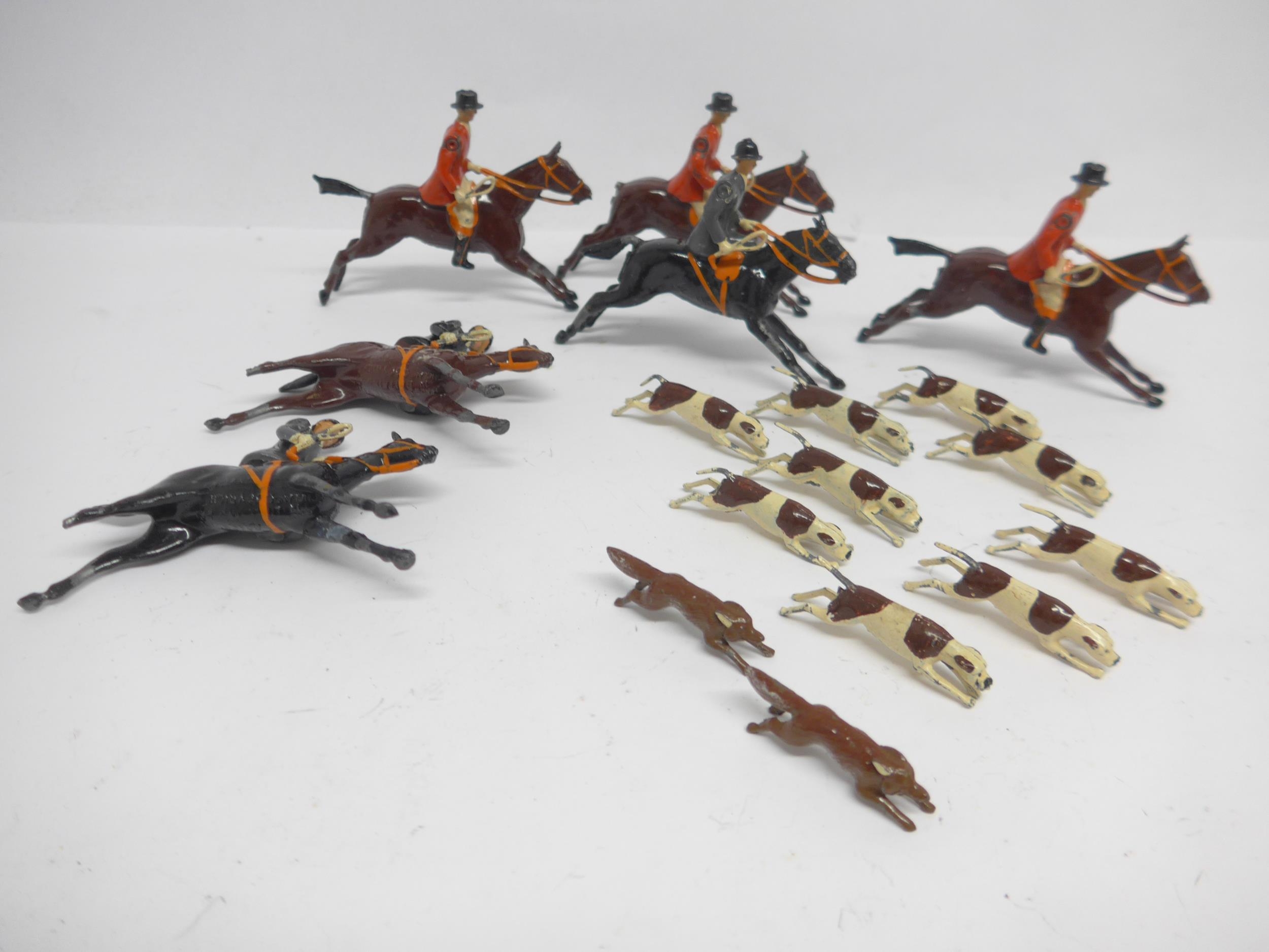 A collection of Britains Hunting Series painted lead figures, comprising six huntsmen and huntswomen on horseback (two horses missing one rear leg, one missing tail), nine beagles and two foxes (17)