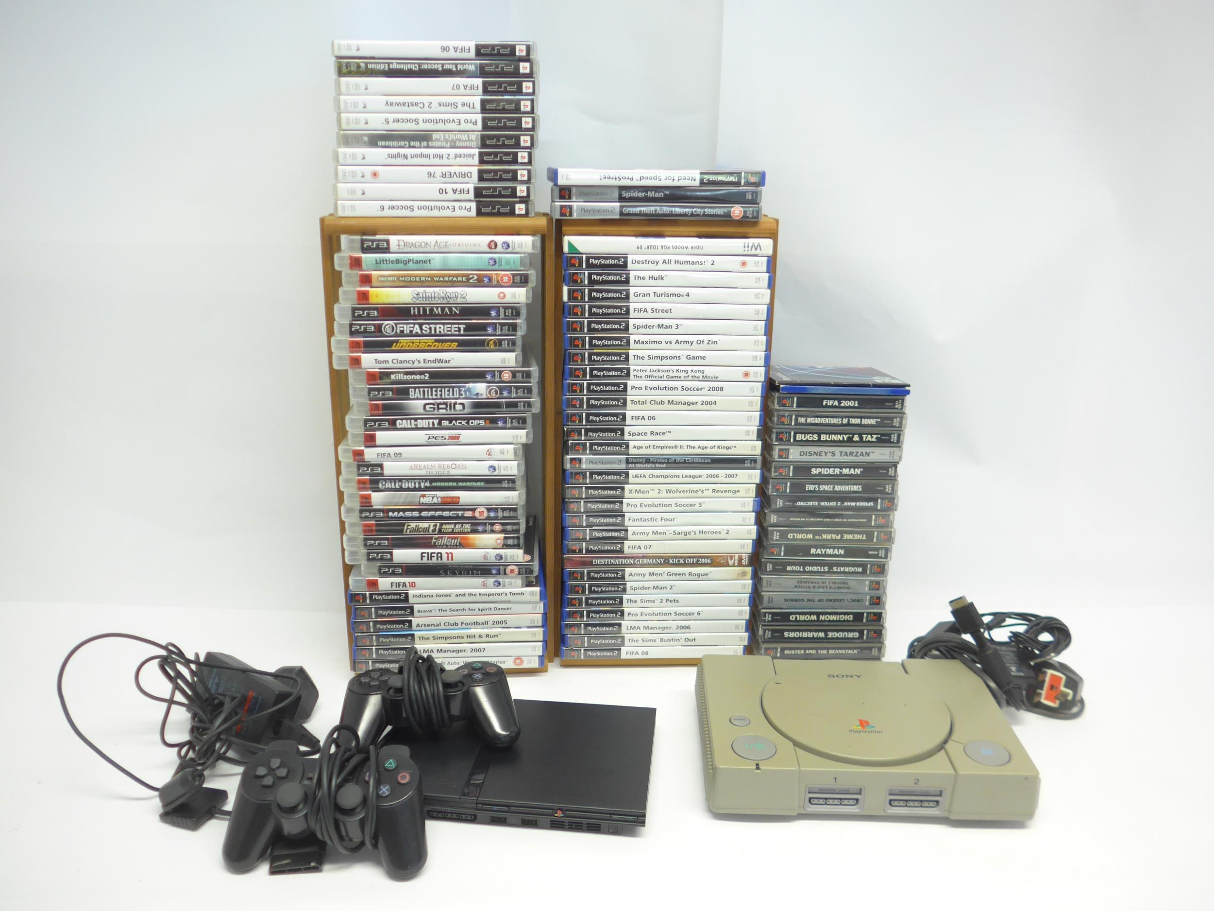Retro gaming, two unboxed computer games consoles to include Sony PlayStation and Sony PS2 Slimline with Two controllers. Together with a good collection of PS1,PS2,PS3 and PSP games