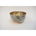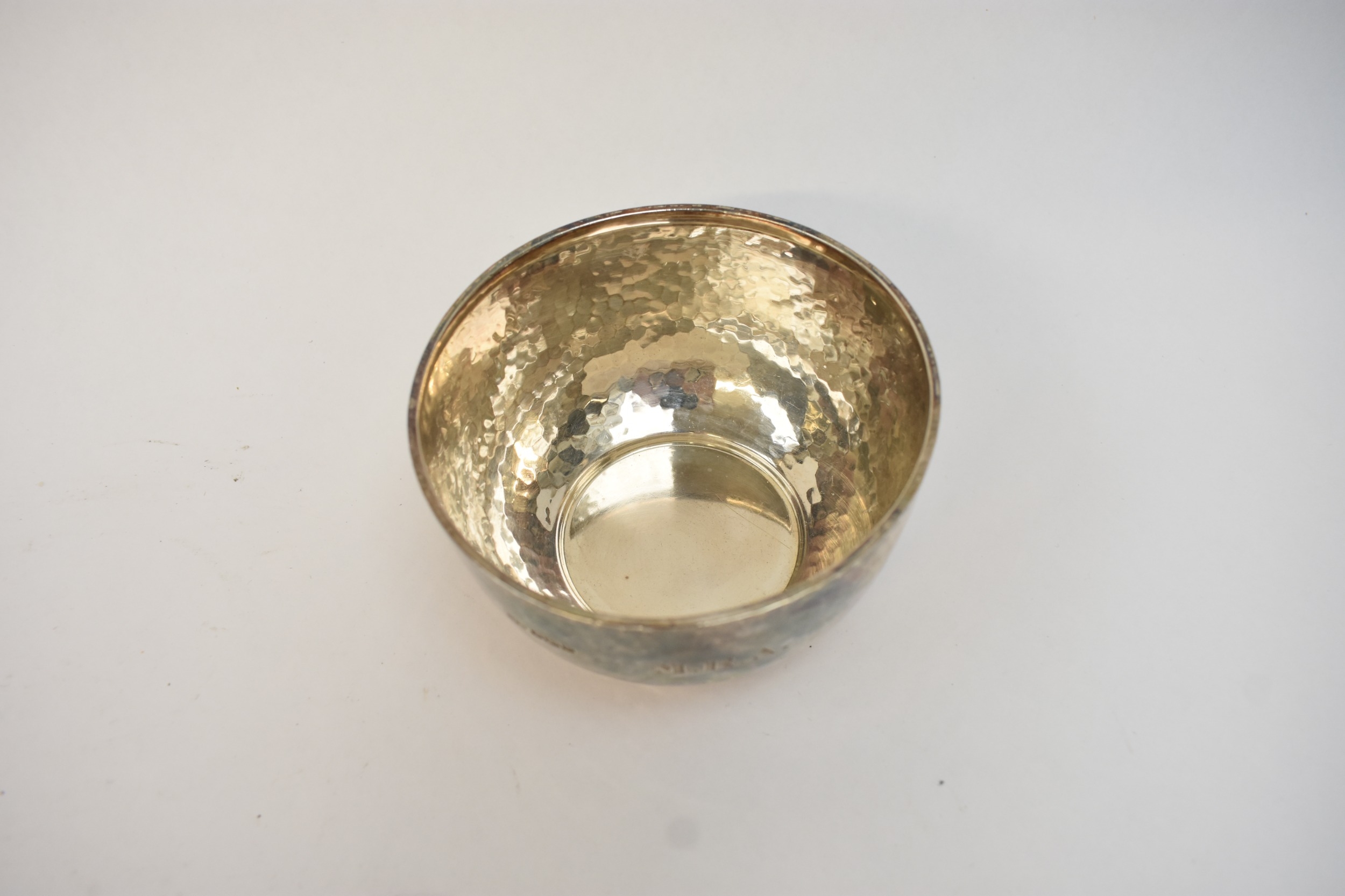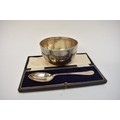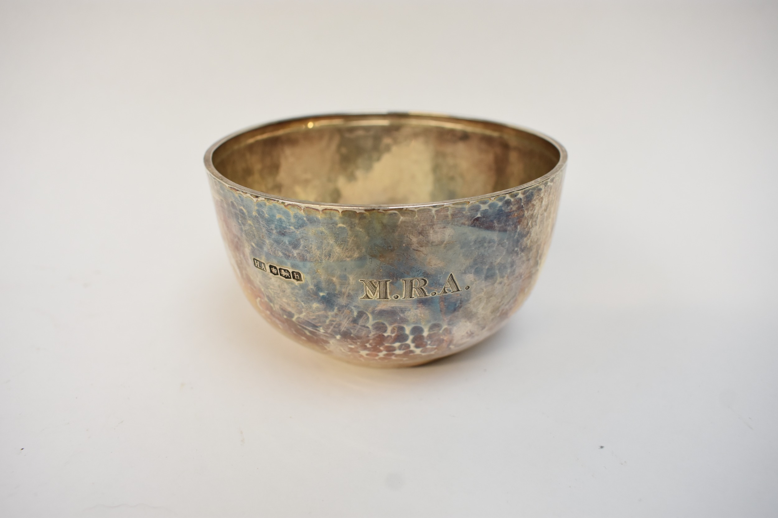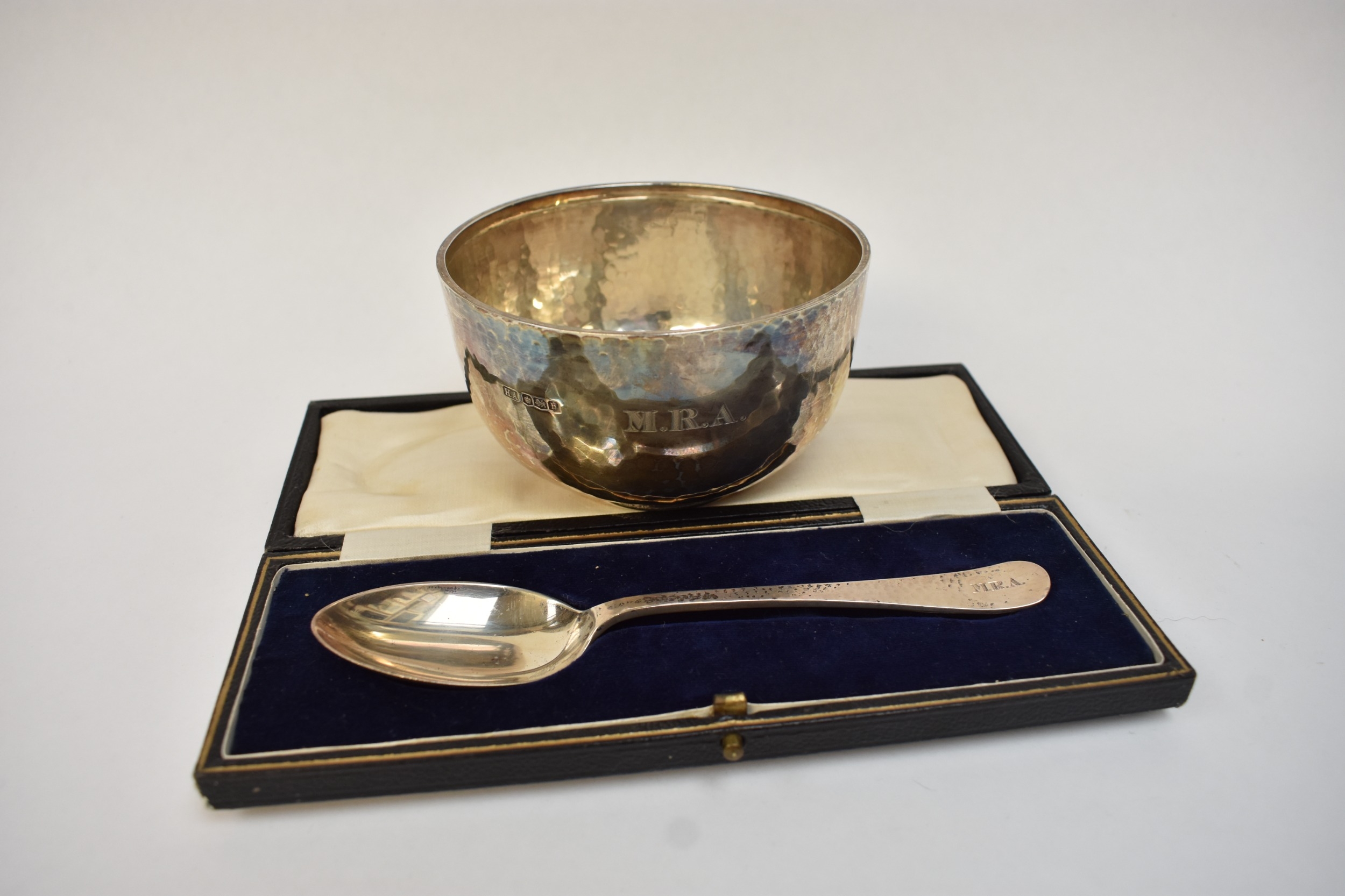 An Atkin Brother silver hammered bowl and spoon monogrammed M.R.A., Sheffield 1925, 1920. The bowl is 6cm tall x 10cm diameter, the spoon is 15.5cm long. 193g