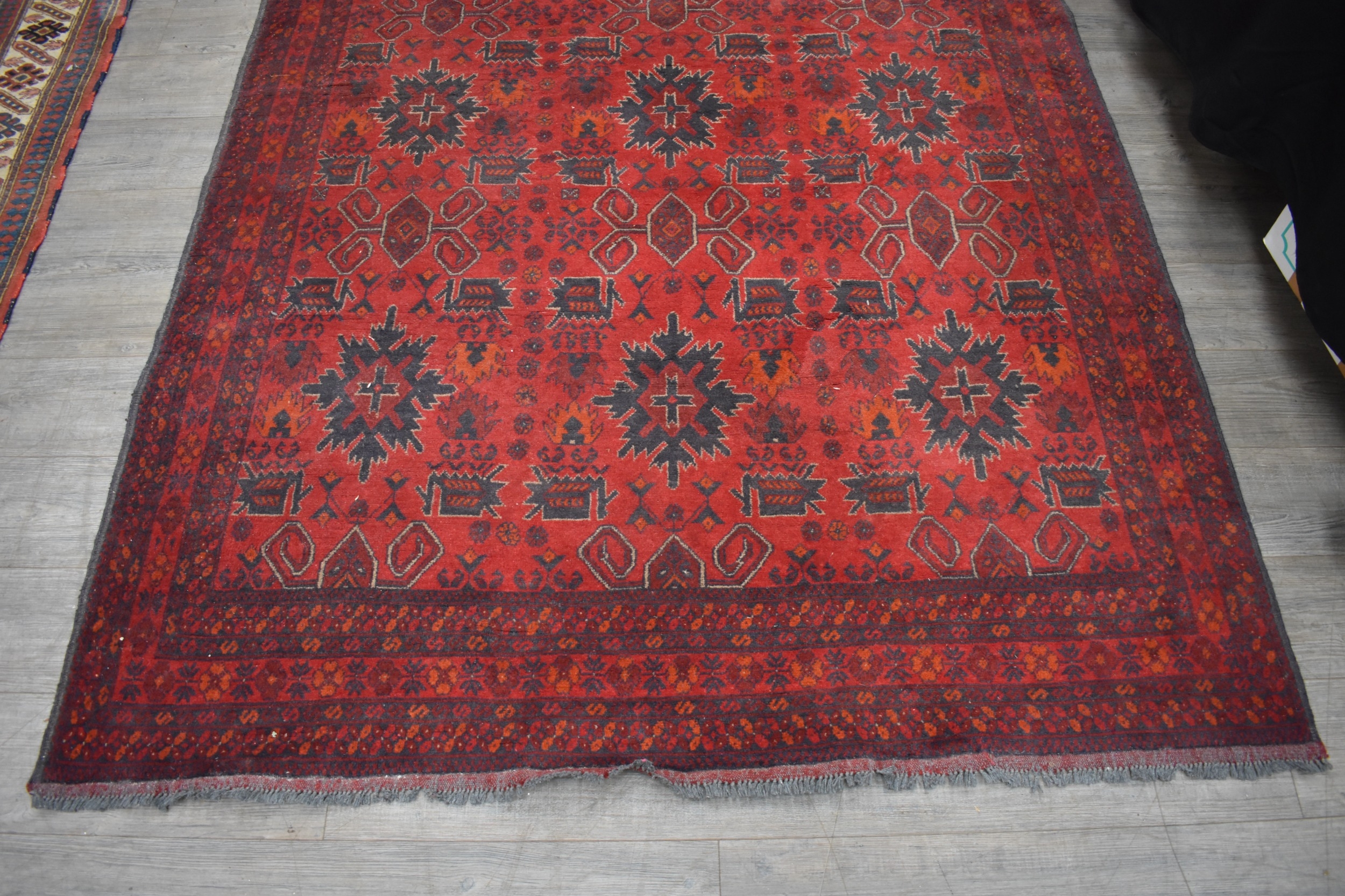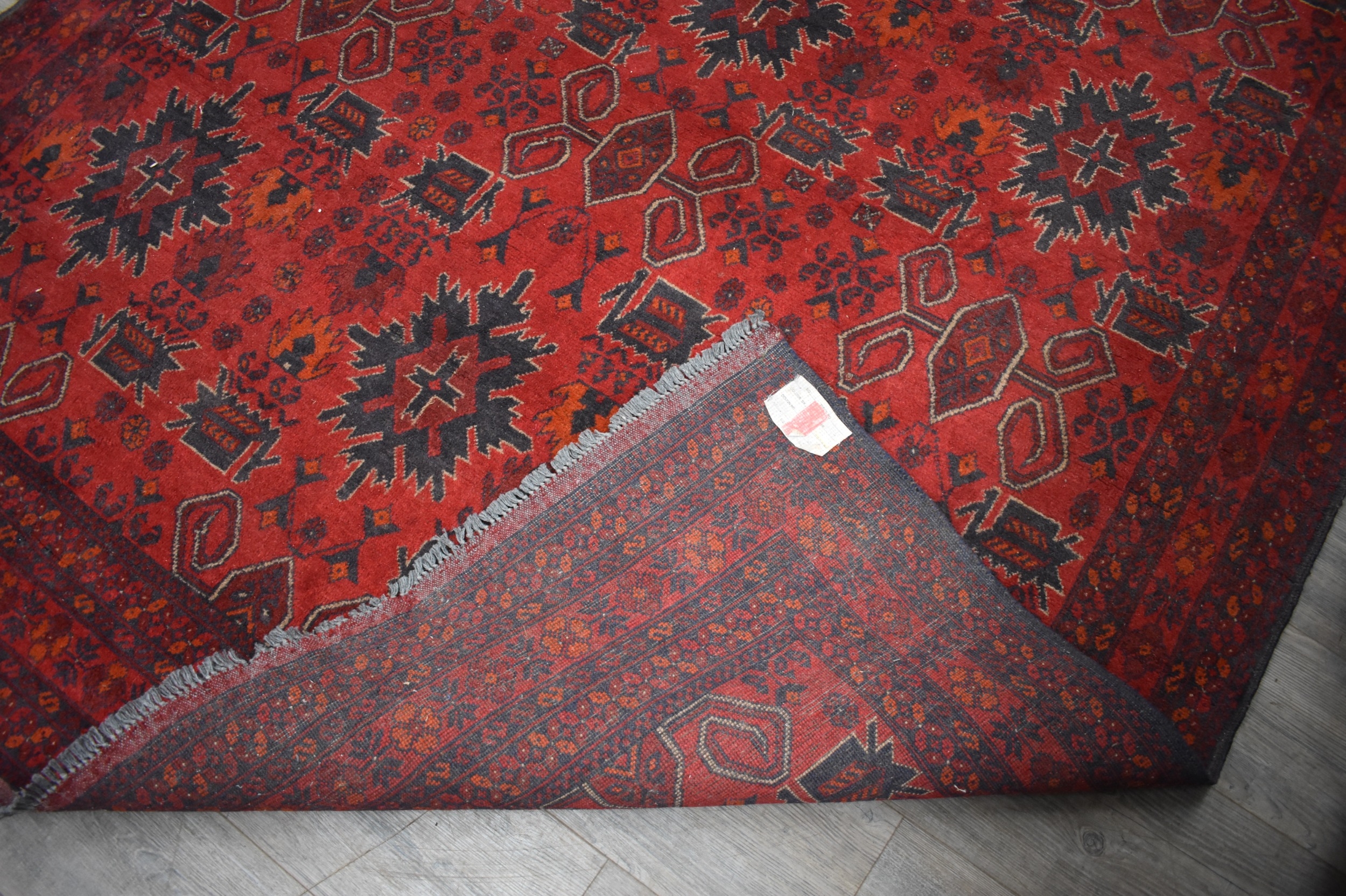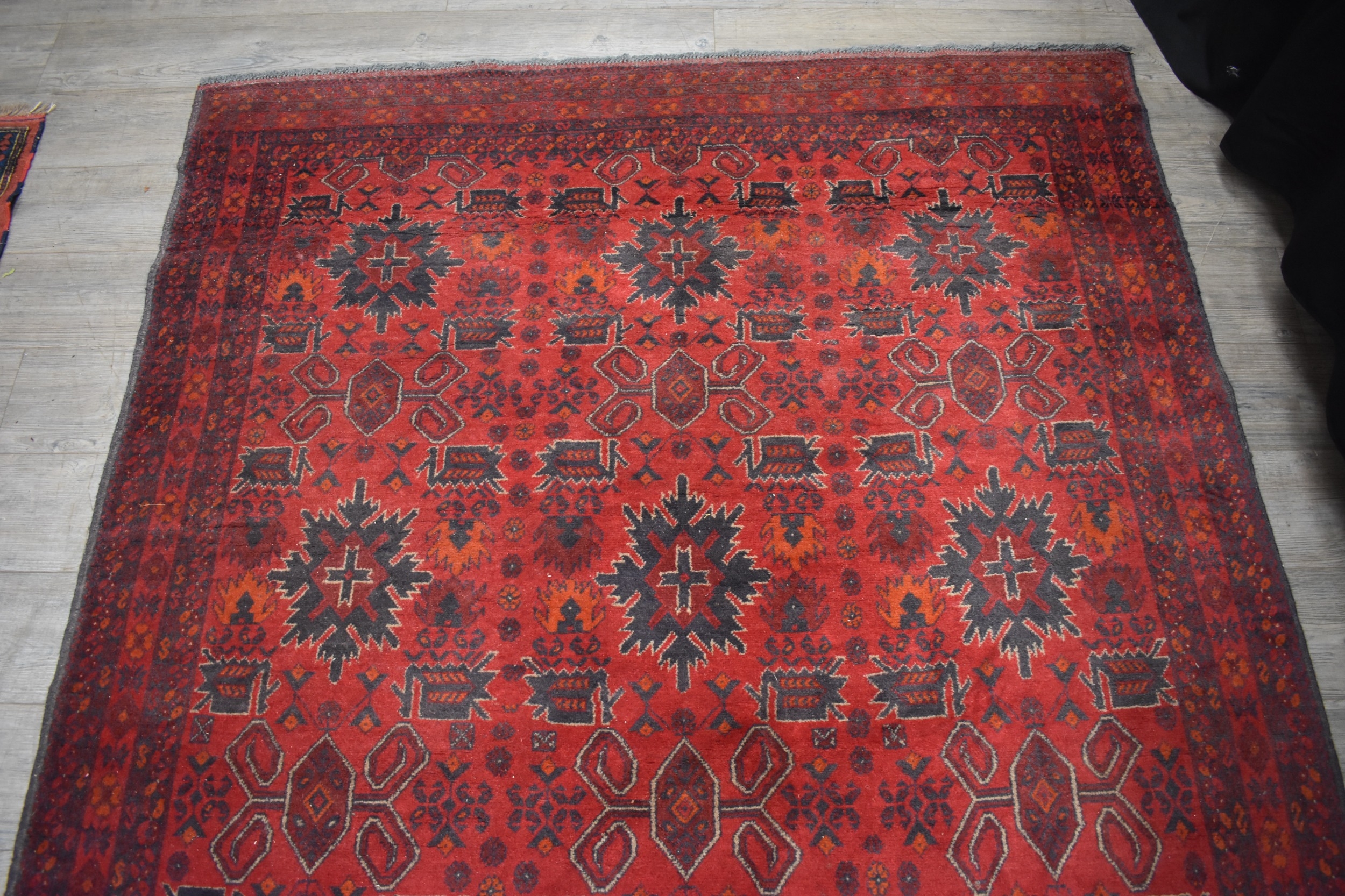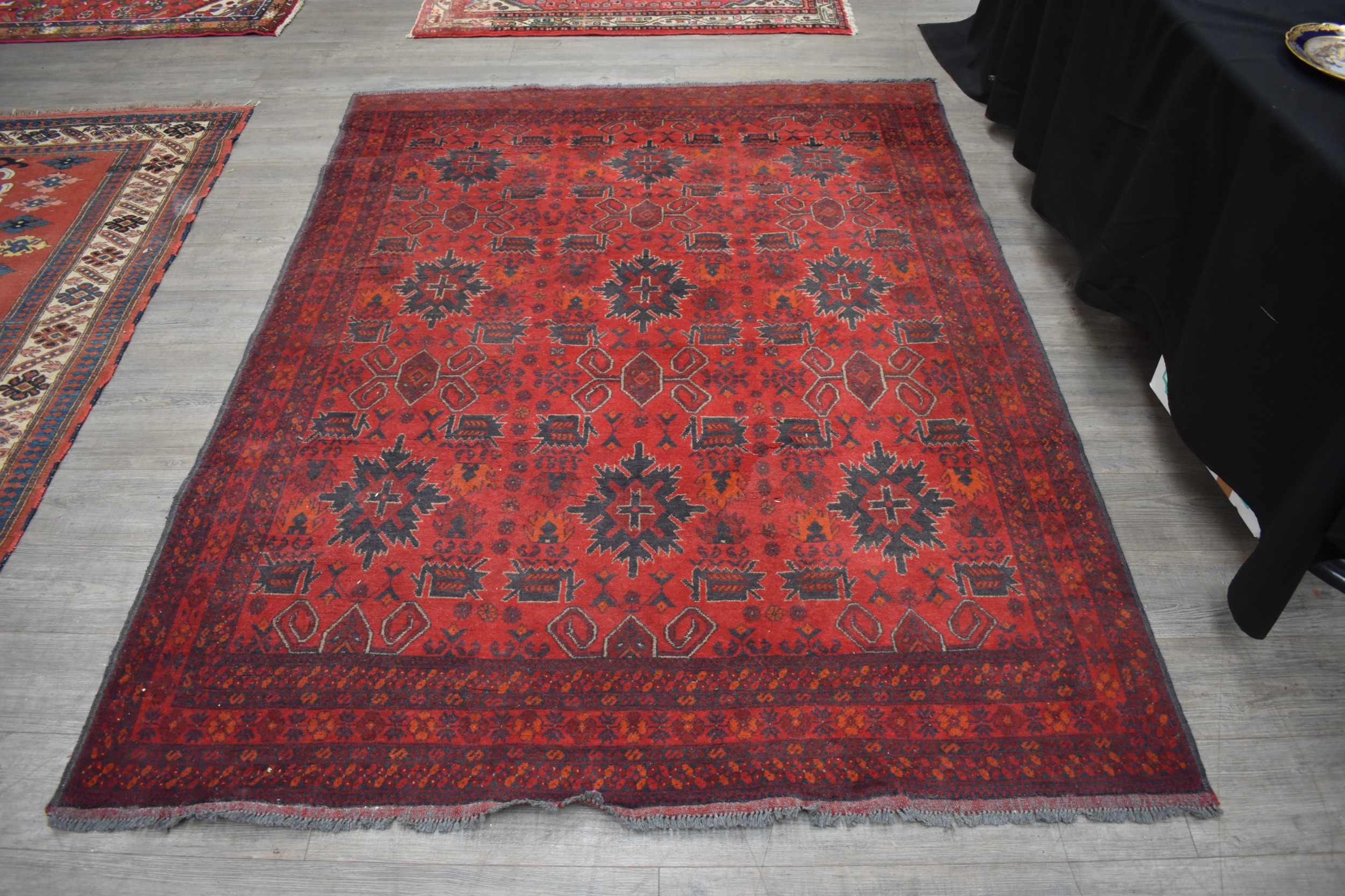 A Persian hand woven rug the central field decorated with various motifs including guls, flowers, stars, in a multiple bordered frame, colour way includes reds blues orange, 233cm x 178cm