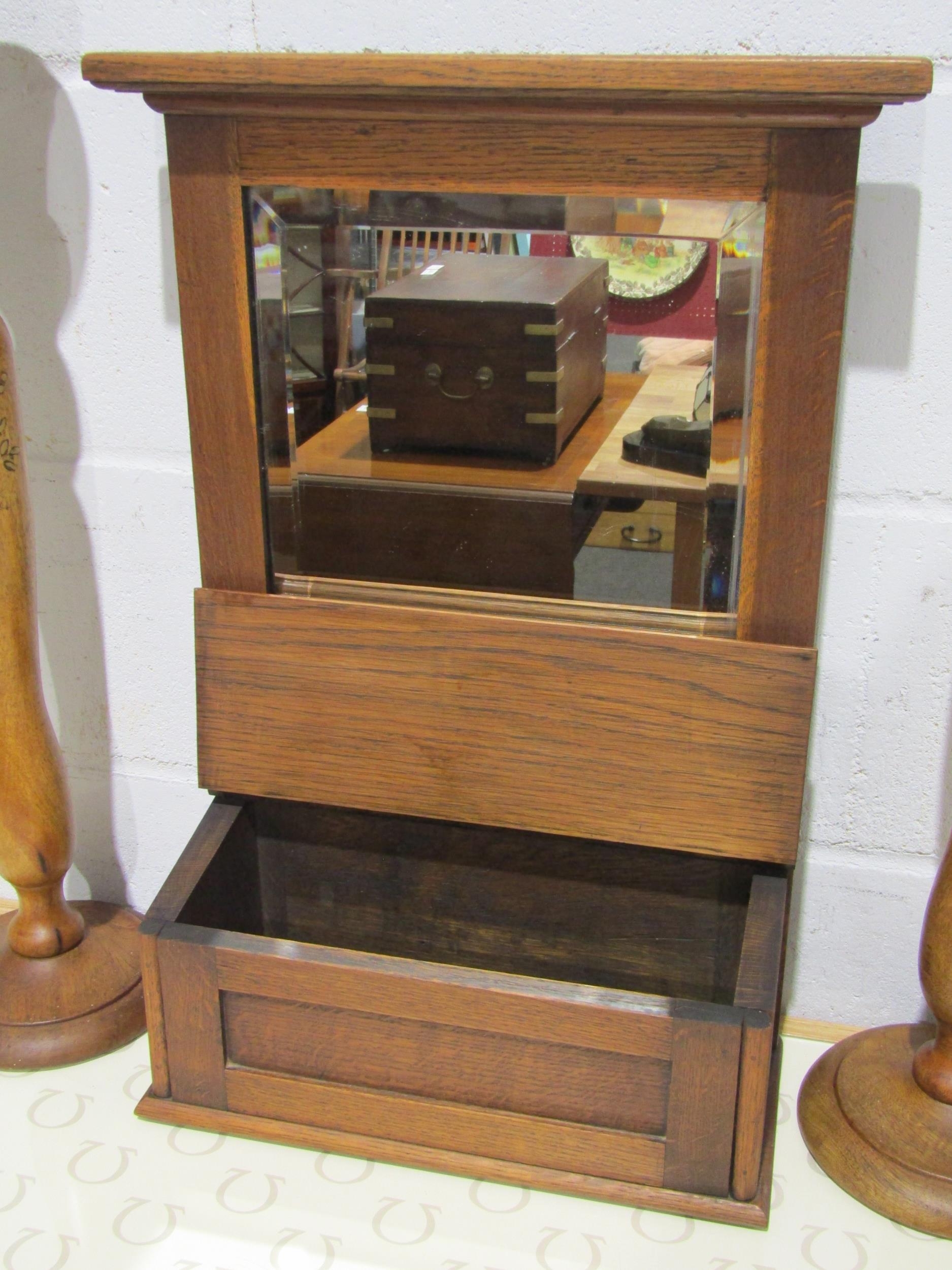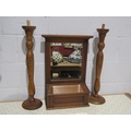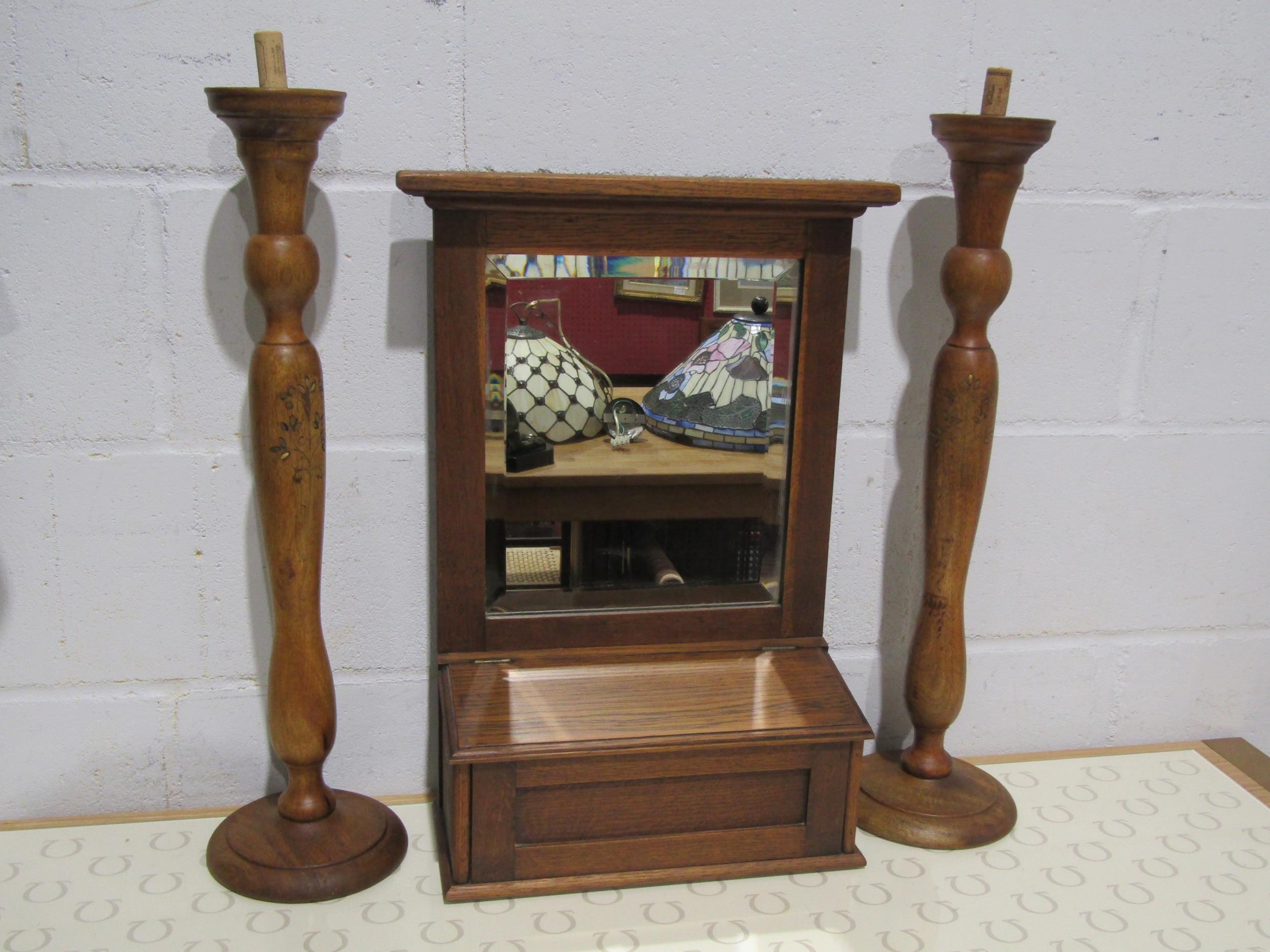 A pair of tall wooden candlesticks with gilt floral design and an oak mirror with box front (3)