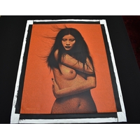 PAIROJ KARNDEE Thai Contemporary Artist: Female portrait, titled " Seduction Paris " bust length study of female with bobbed hair, purple lipstick, orange toned skin acrylic on canvas. The artist has been influenced by the mysterious Apsaras - the celestial maidens of ancient Asian culture depicted in the galleries of Cambodia's Angkor Wat. His techniques painstakingly recreate the stone textures of those images with a time-consuming rendering of acrylic on linen canvas. His figures show a notable range of emotions. Signed and dated, 2012, image size 89cm x 109.5cm