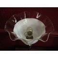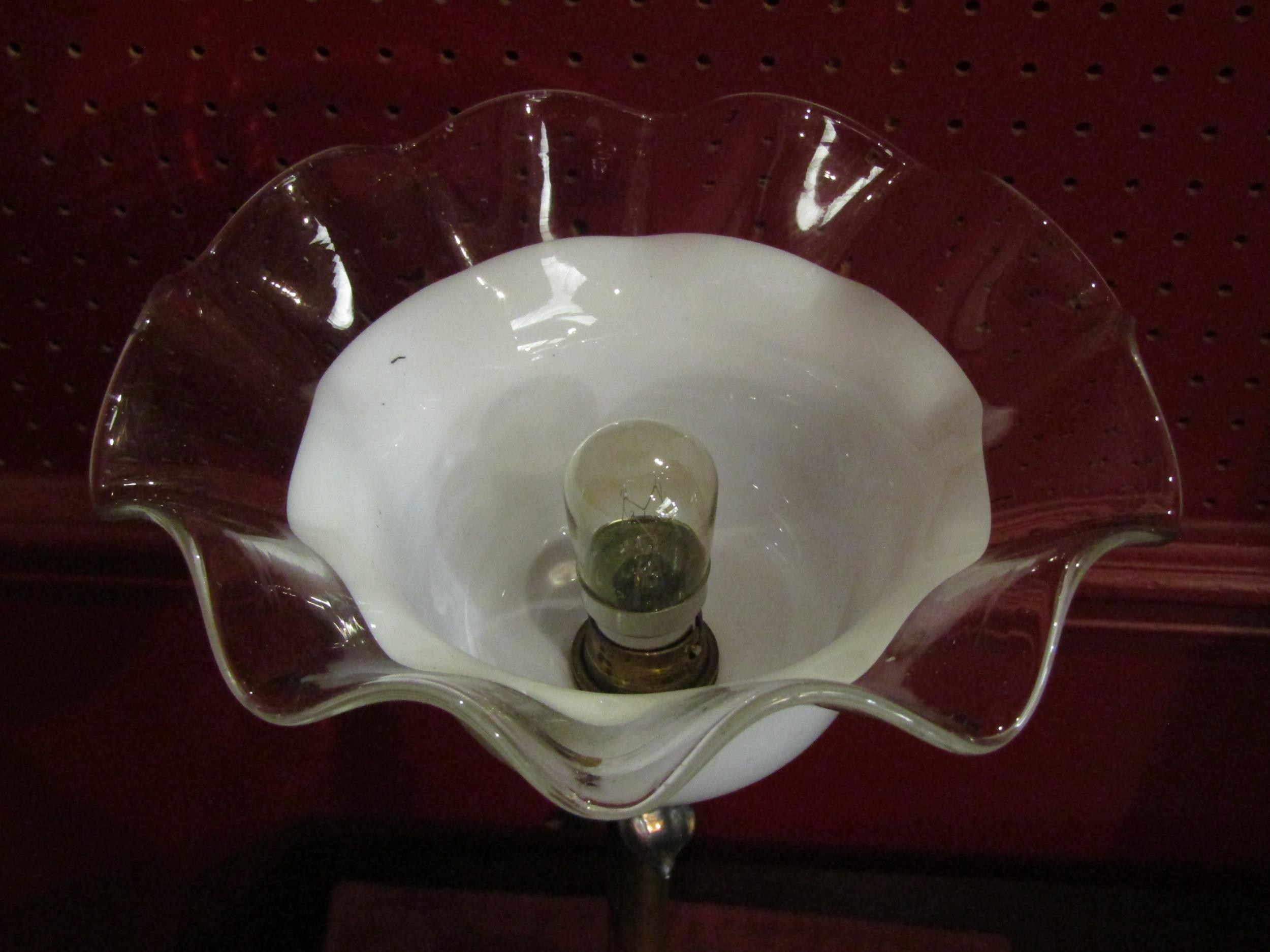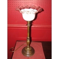 A brass stick form table lamp, petal detail, frilled white/clear glass shade, 44cm height