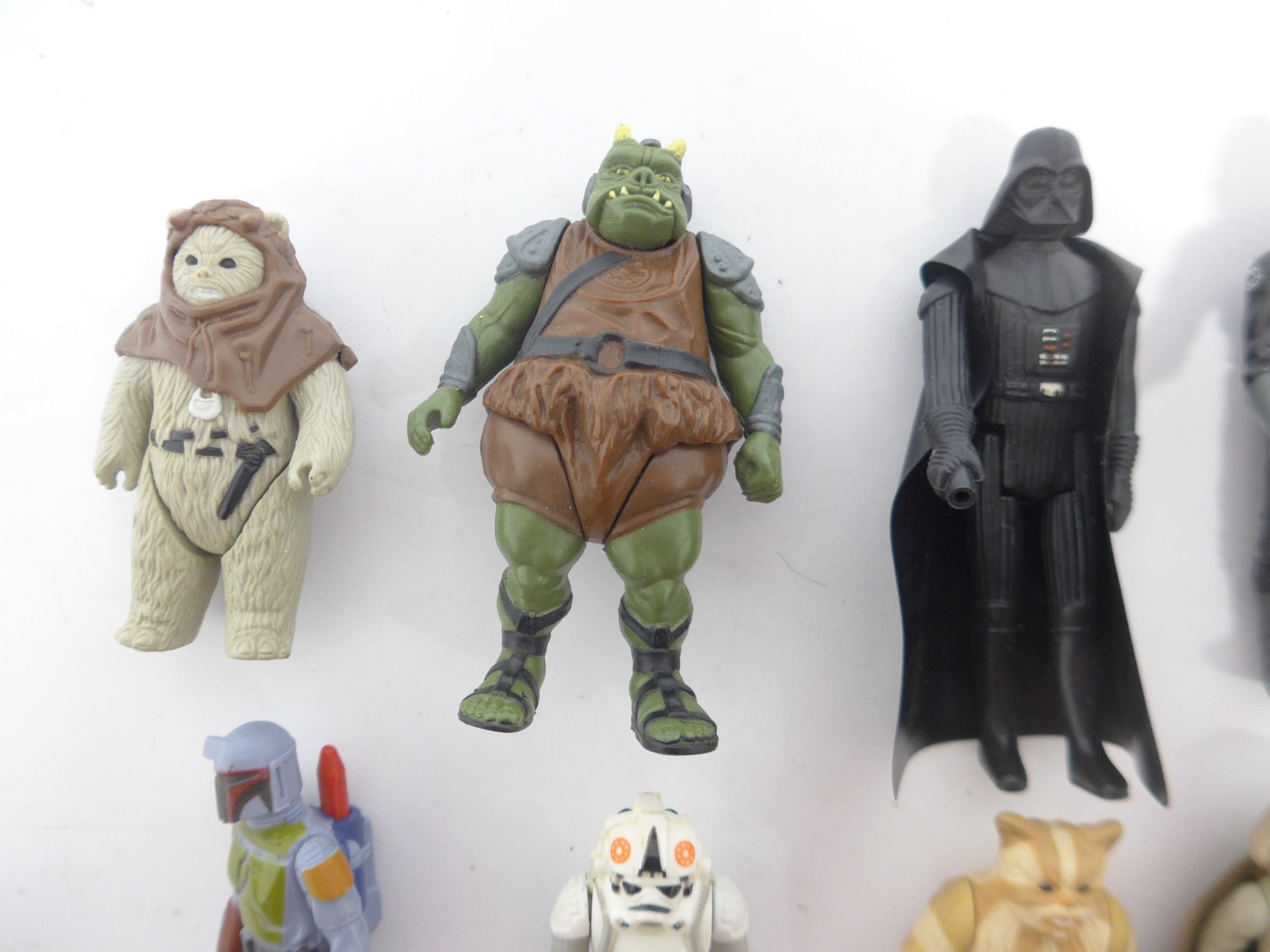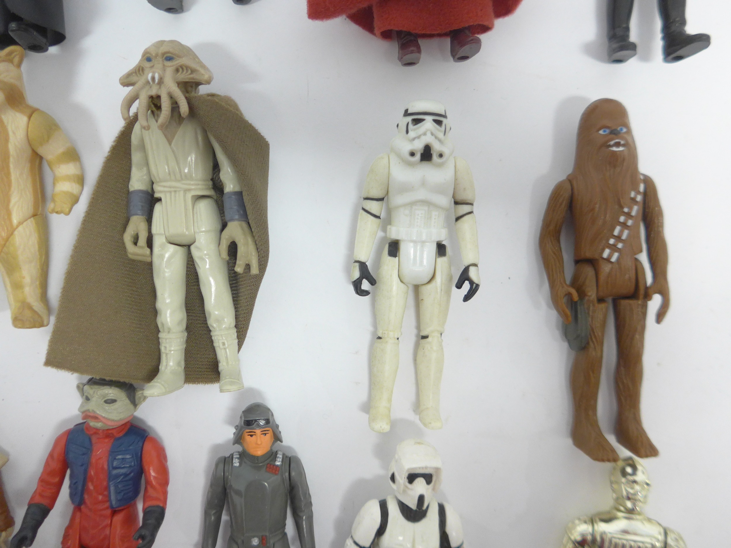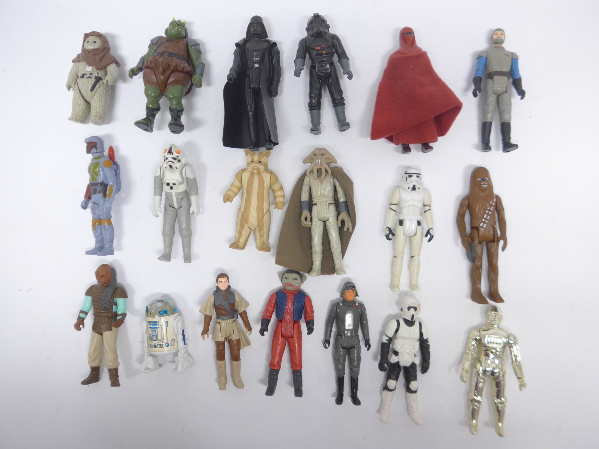 A collection of nineteen loose vintage Kenner and Palitoy LFL/CPG/GMFGI Star Wars action figures to include Squid Head, Darth Vader, C-3PO, Chewbacca, Chief Chirpa, Weequay, Gamorrean Guard, Princess Leia (Boushh Disguise), R2-D2, AT-AT Driver, AT-AT Commander, Logray, Boba Fett, Biker Scout, Emperor's Royal Guard, General Madine, Nien Nunb, Stormtrooper and Tie Fighter Pilot (19, incomplete)