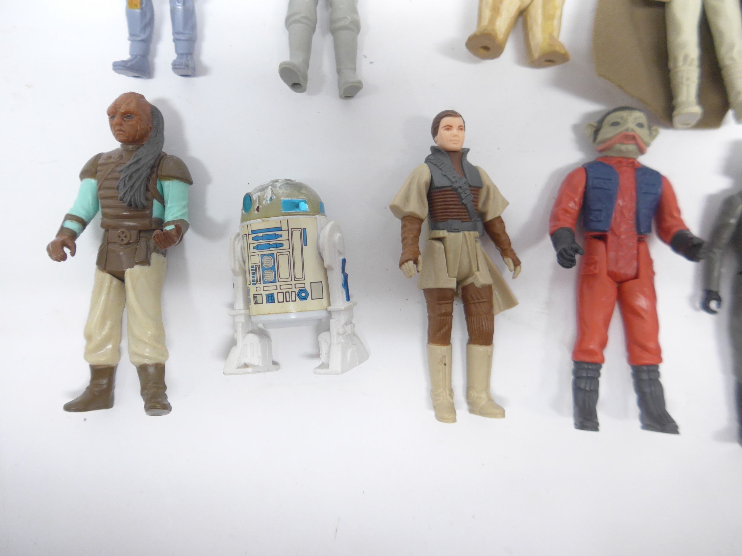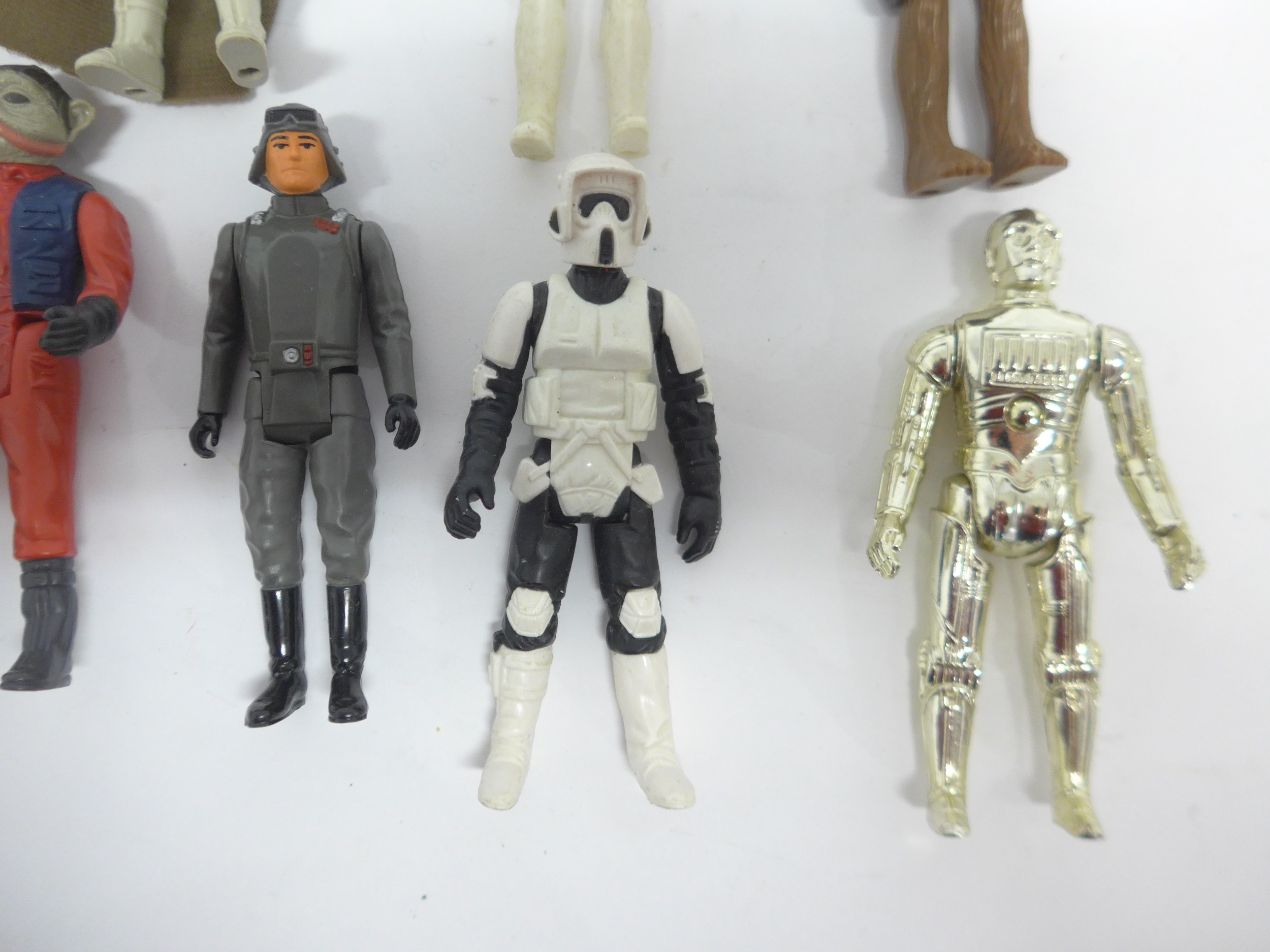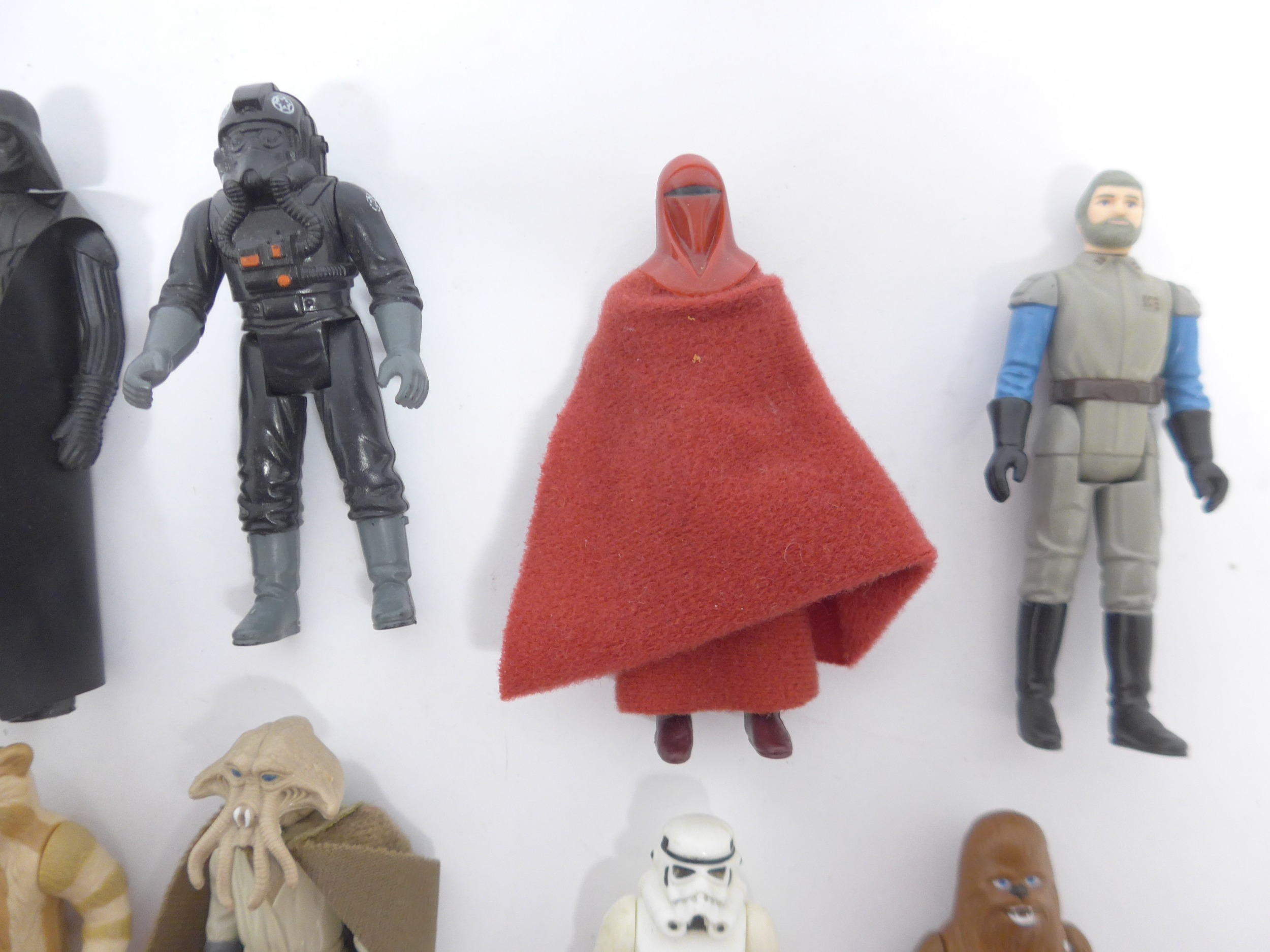 A collection of nineteen loose vintage Kenner and Palitoy LFL/CPG/GMFGI Star Wars action figures to include Squid Head, Darth Vader, C-3PO, Chewbacca, Chief Chirpa, Weequay, Gamorrean Guard, Princess Leia (Boushh Disguise), R2-D2, AT-AT Driver, AT-AT Commander, Logray, Boba Fett, Biker Scout, Emperor's Royal Guard, General Madine, Nien Nunb, Stormtrooper and Tie Fighter Pilot (19, incomplete)
