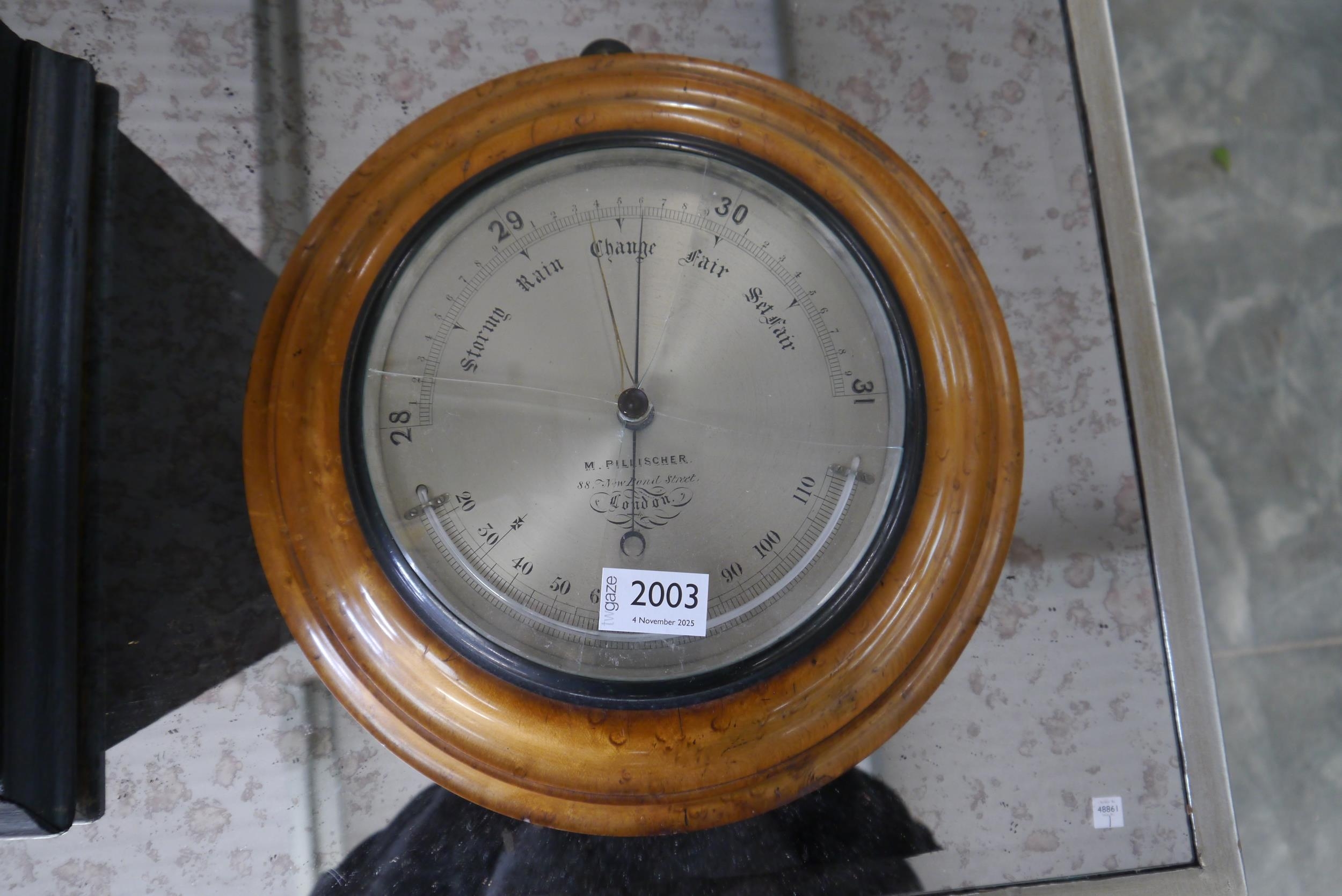 A 19th Century birds-eye maple framed barometer, glass cracked by M.Pillischer 34cm Diameter
