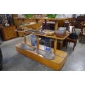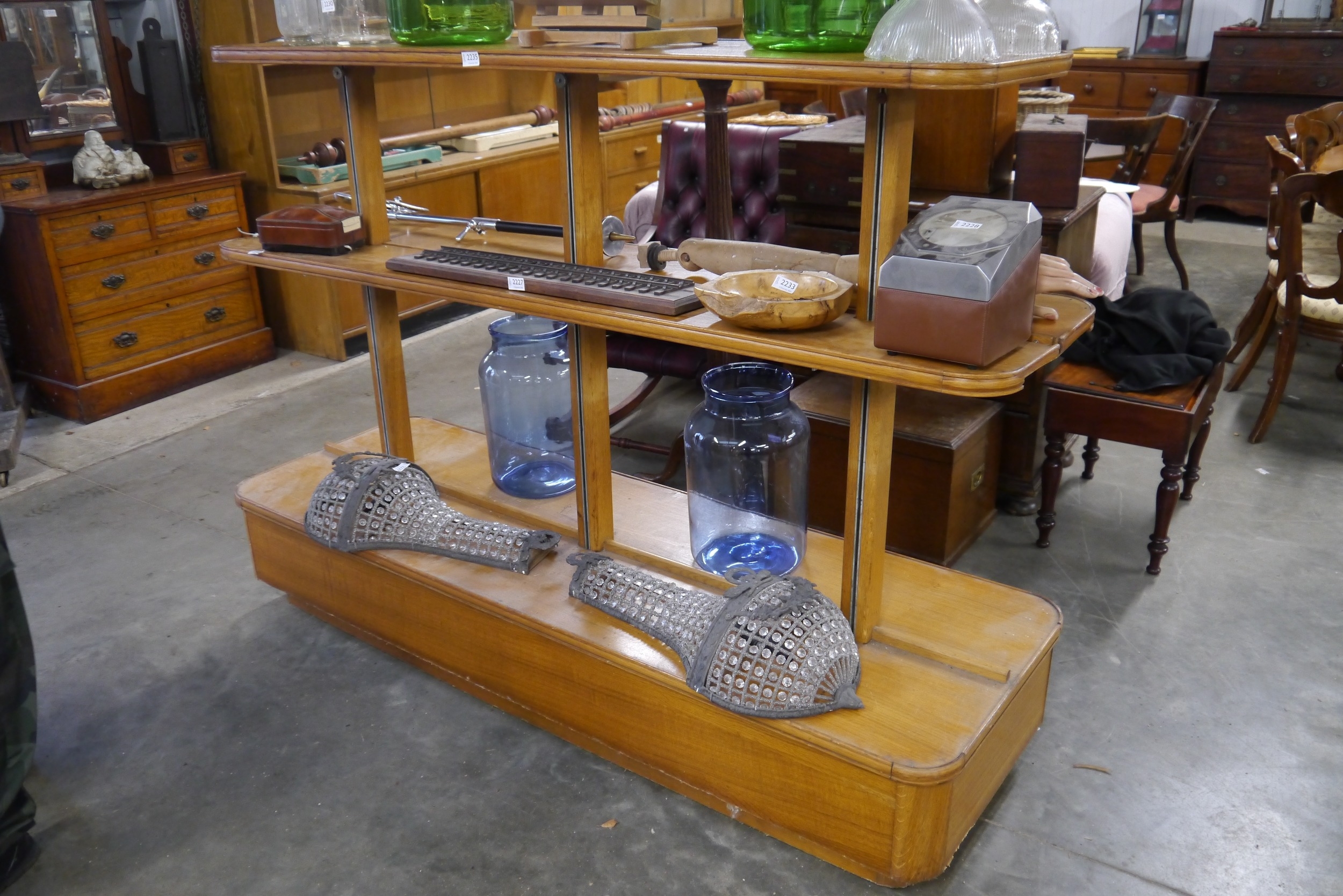 A mid 20th Century oak shop display stand with adjustable shelves 6'long x 2'deep