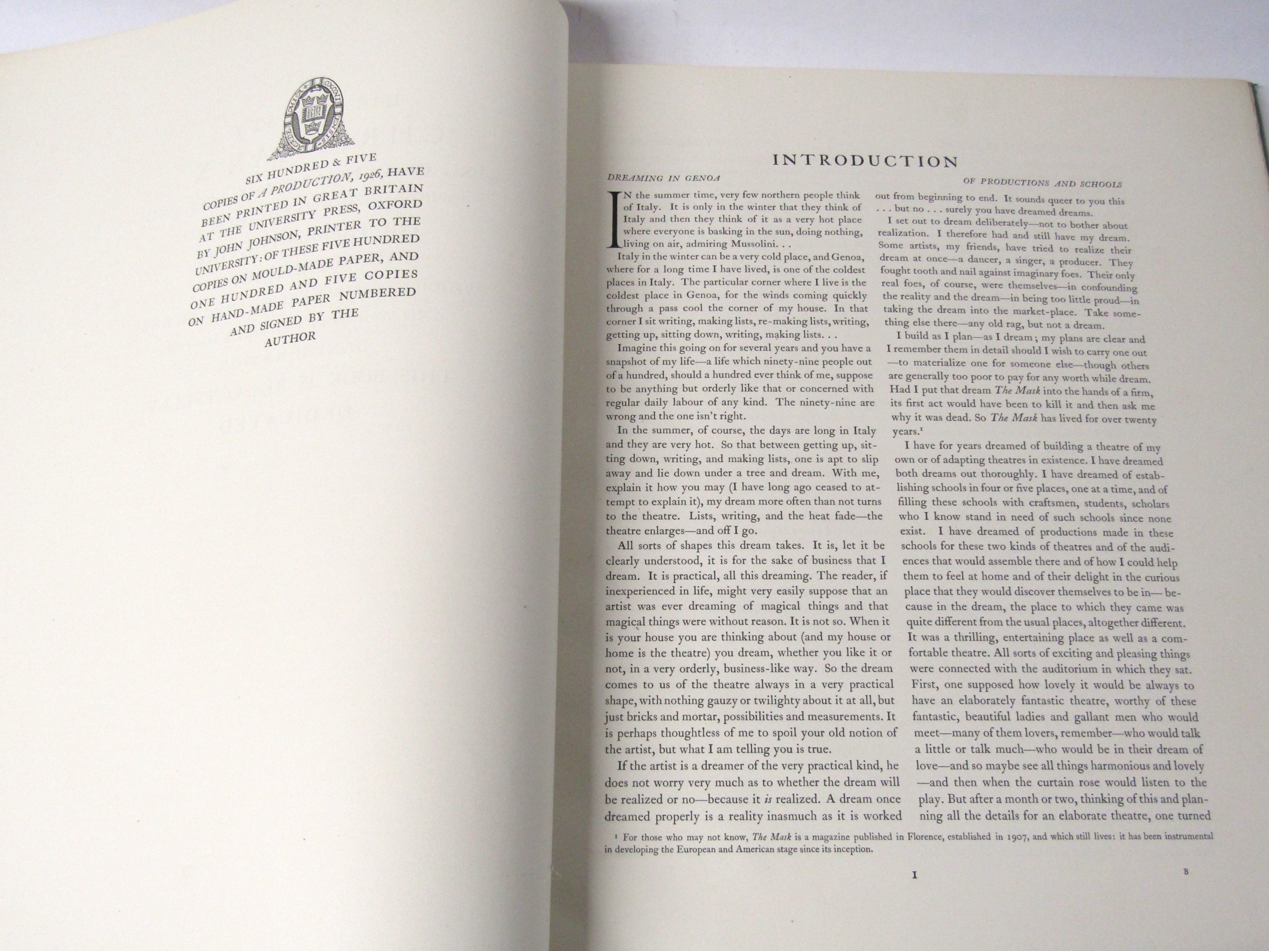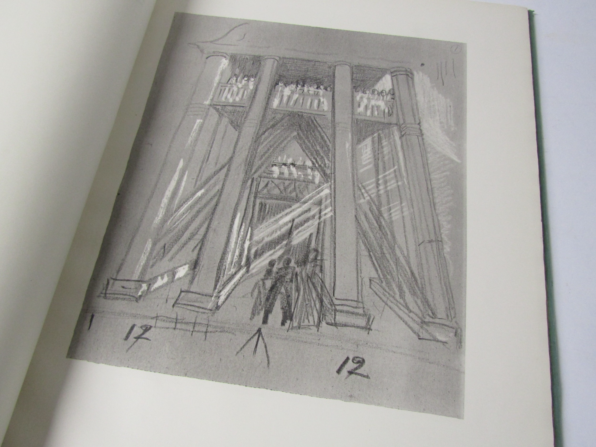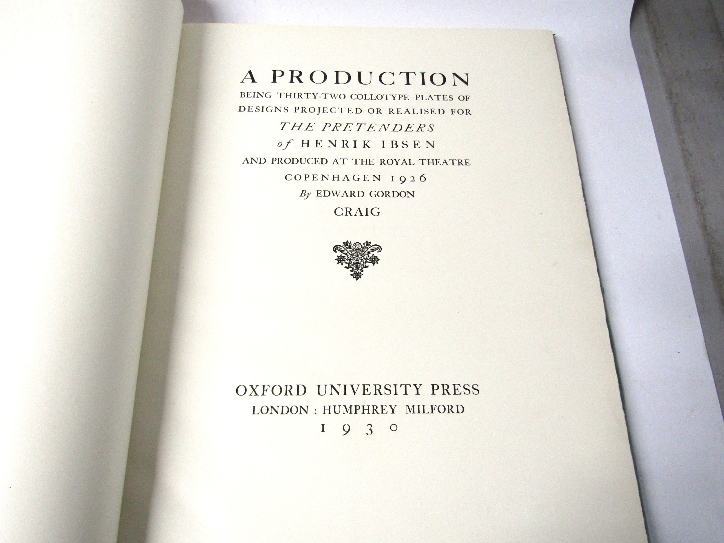 Edward Gordon Craig: 'A Production, being Thirty-Two Collotype Plates of Designs Projected or Realised for The Pretenders of Henrik Ibsen and Produced at the Royal Theatre Copenhagen 1926', London, Humphrey Milford, 1930, limited edition, one of 500 copies on mould made paper from a total edition of 605, 32 plates (of which several coloured) complete, elephant folio (51 x 38cm), original parchment backed red cloth gilt (VGC), in the scarce dust wrapper