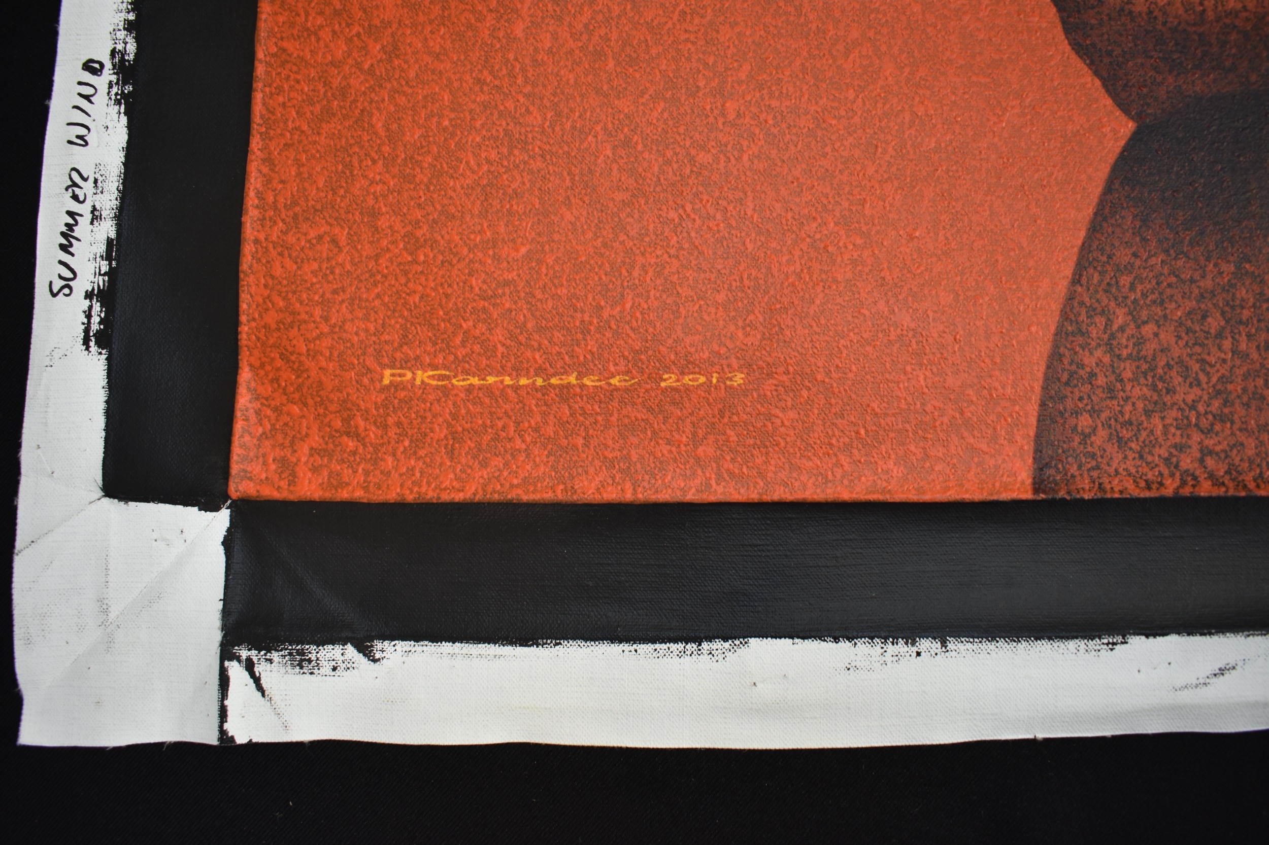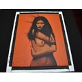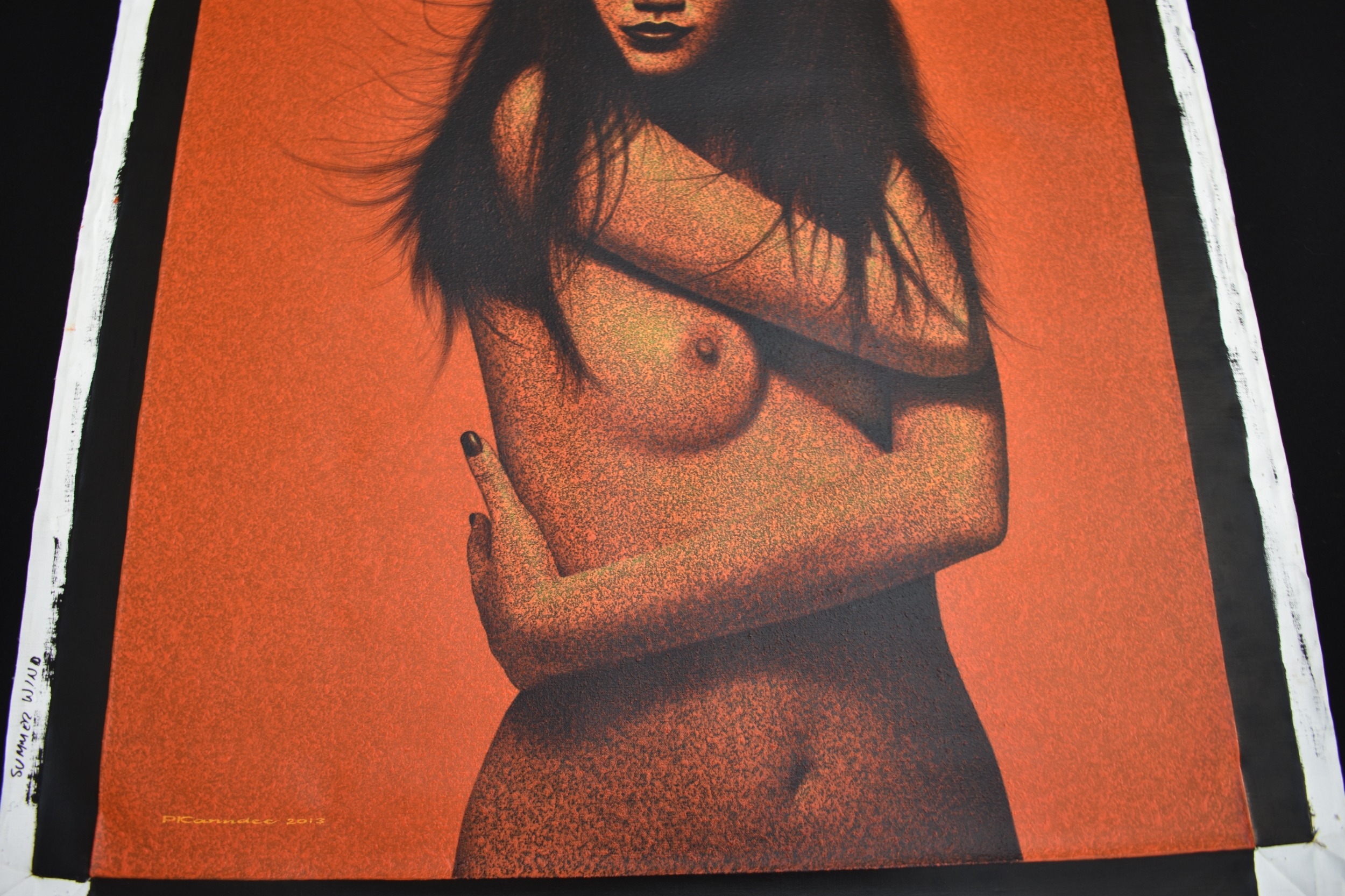 PAIROJ KARNDEE Thai Contemporary Artist: Female portrait, titled " Summer wind " 3/4 length image of nude female with arms wrapped around her body, acrylic on canvas. The artist has been influenced by the mysterious Apsaras - the celestial maidens of ancient Asian culture depicted in the galleries of Cambodia's Angkor Wat. His techniques painstakingly recreate the stone textures of those images with a time-consuming rendering of acrylic on linen canvas. His figures show a notable range of emotions. Signed and dated, 2013, image size 99cm x 79cm