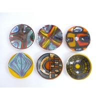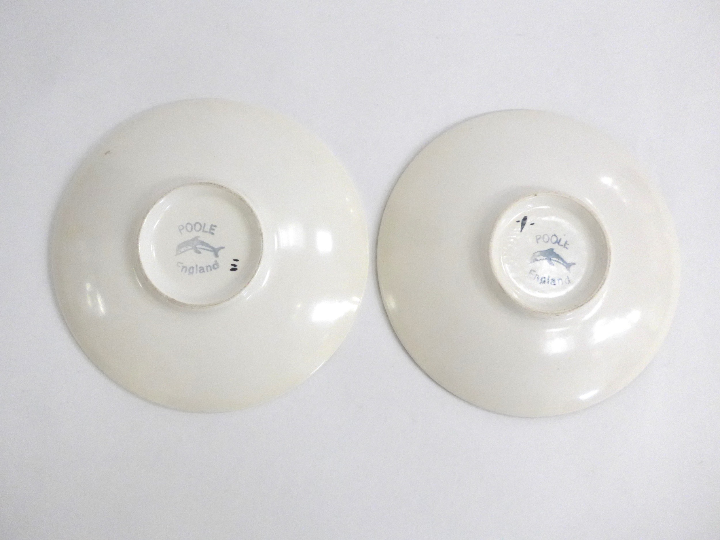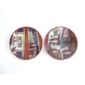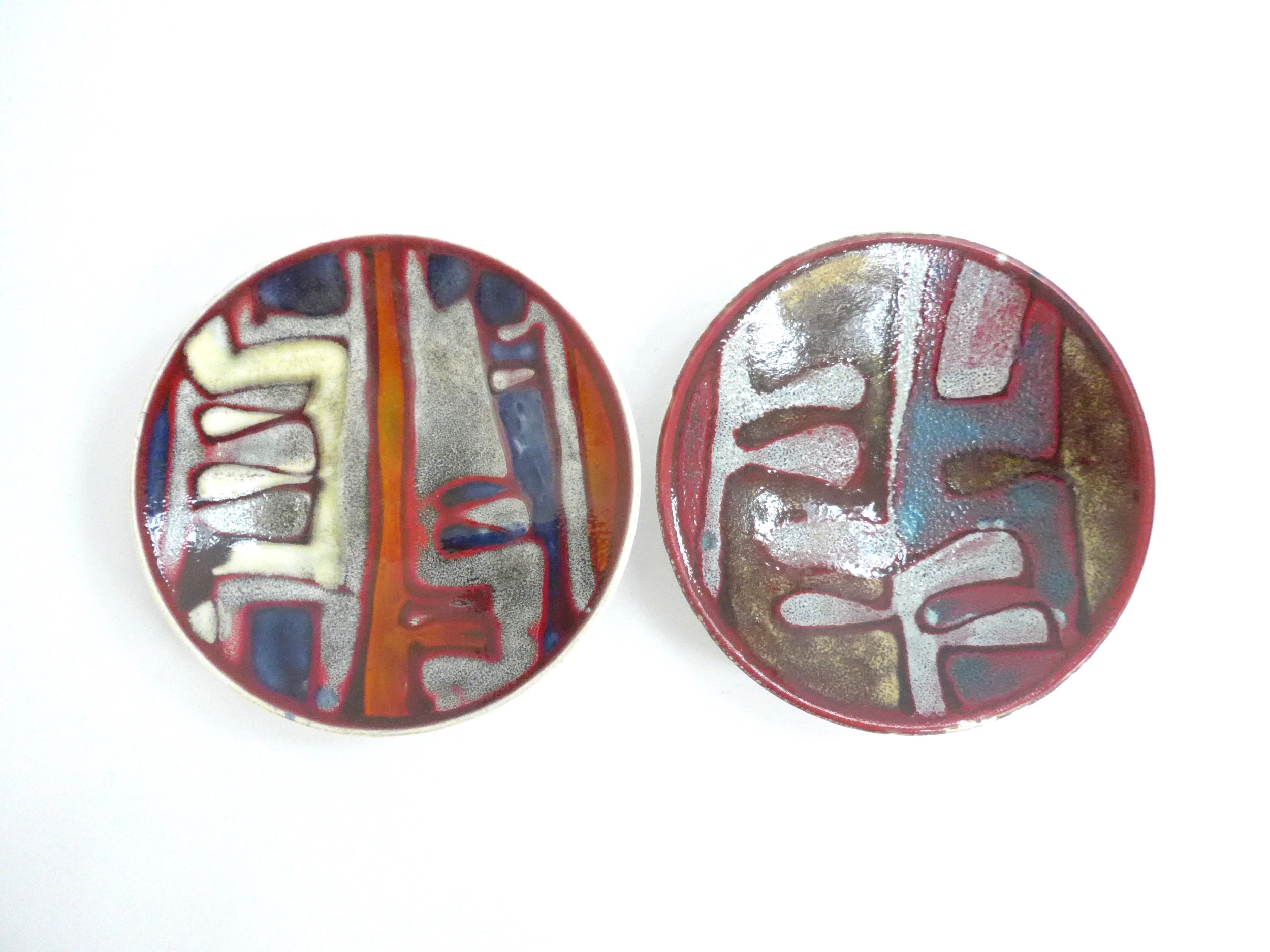 Two small Poole Pottery Delphis range pin dishes, purple, red and blue colours. Blue backstamps. 12.5cm diameter