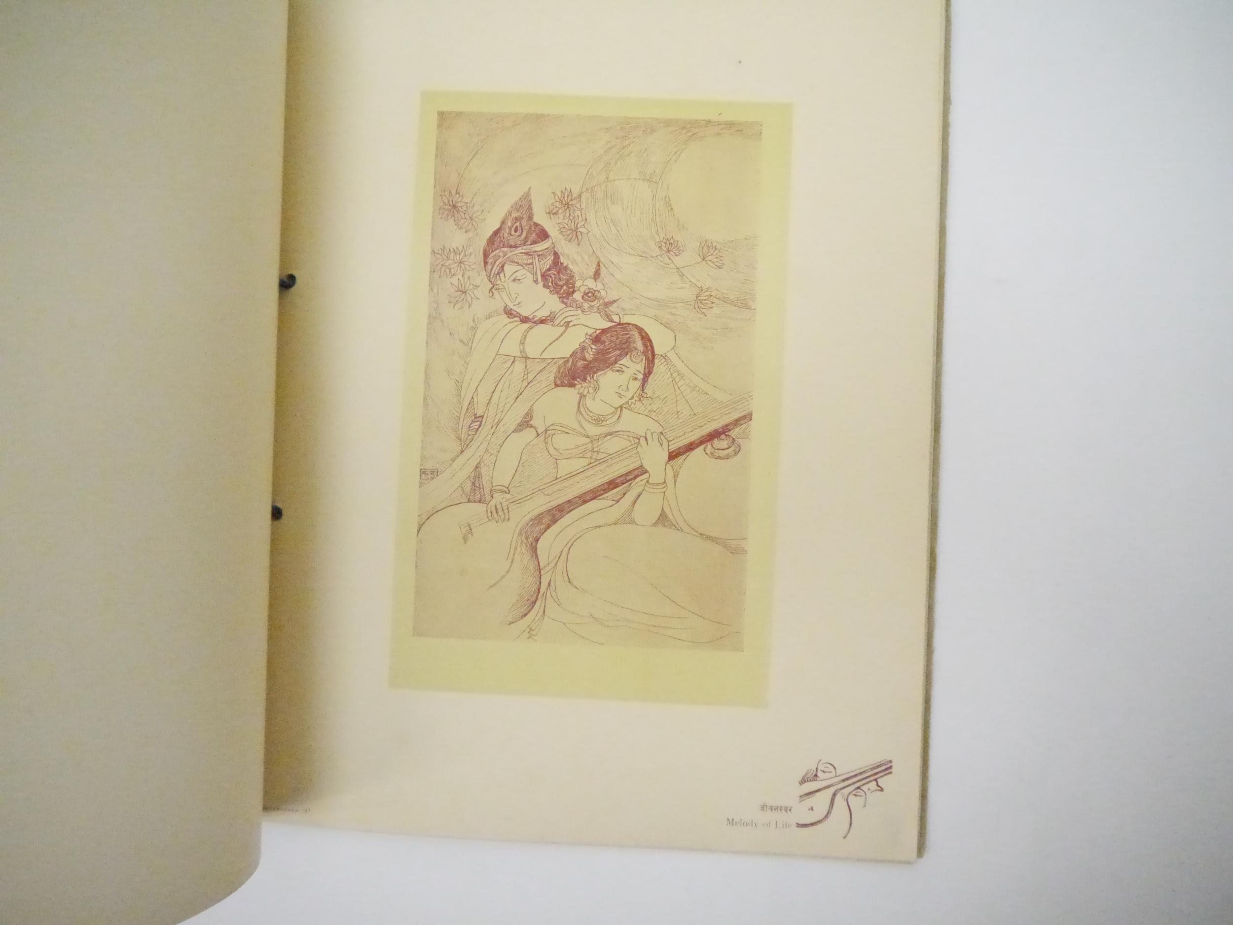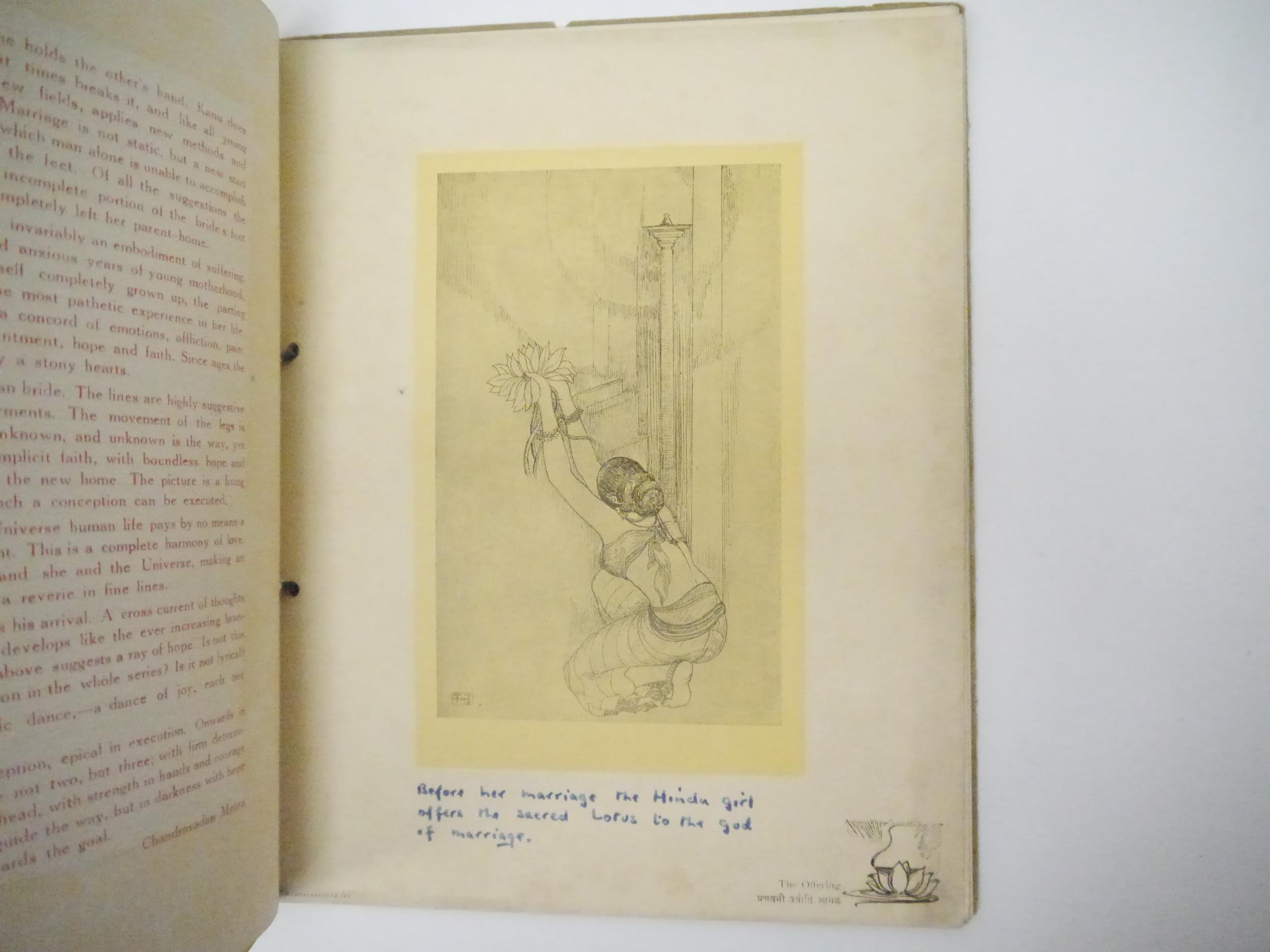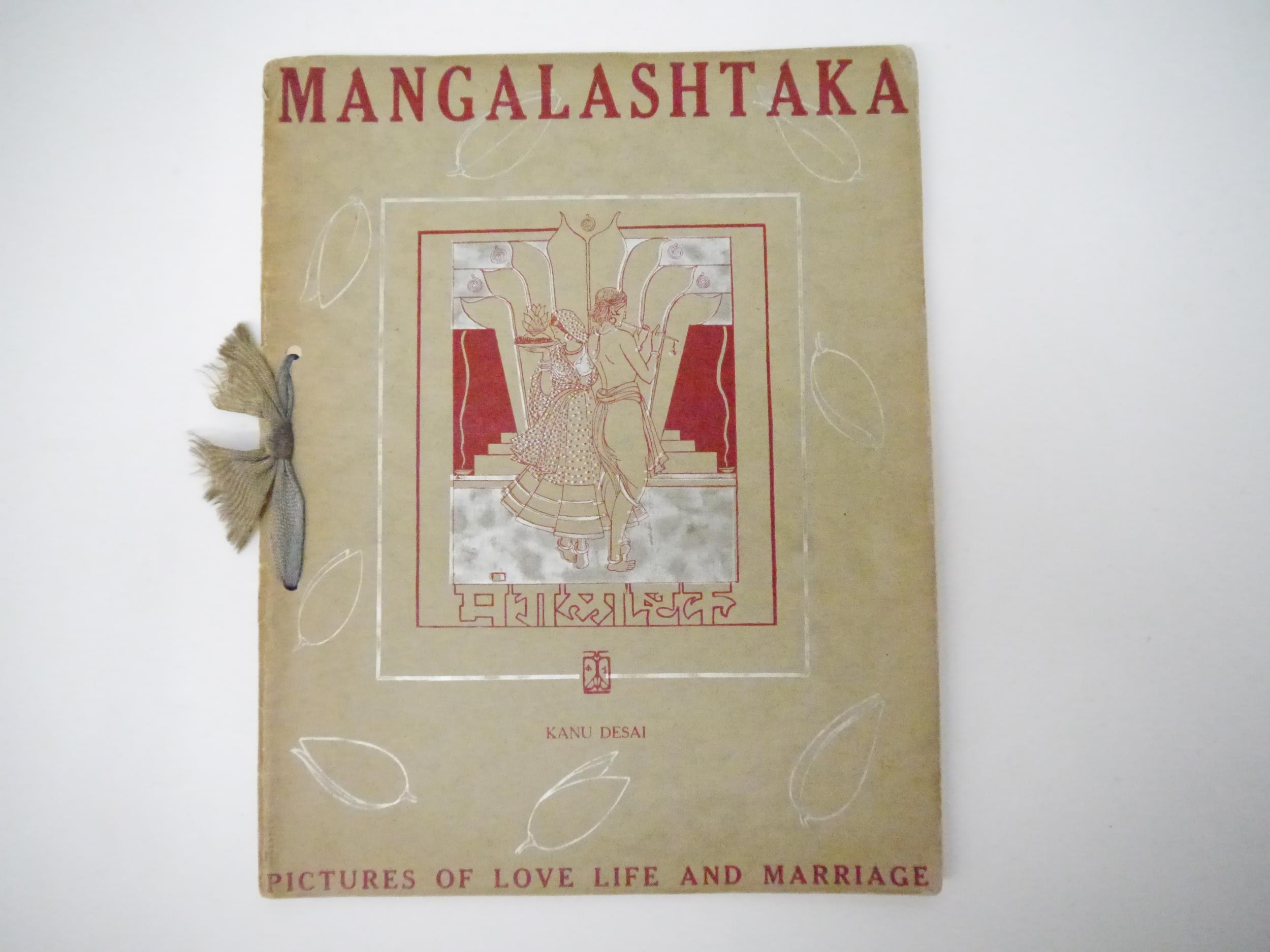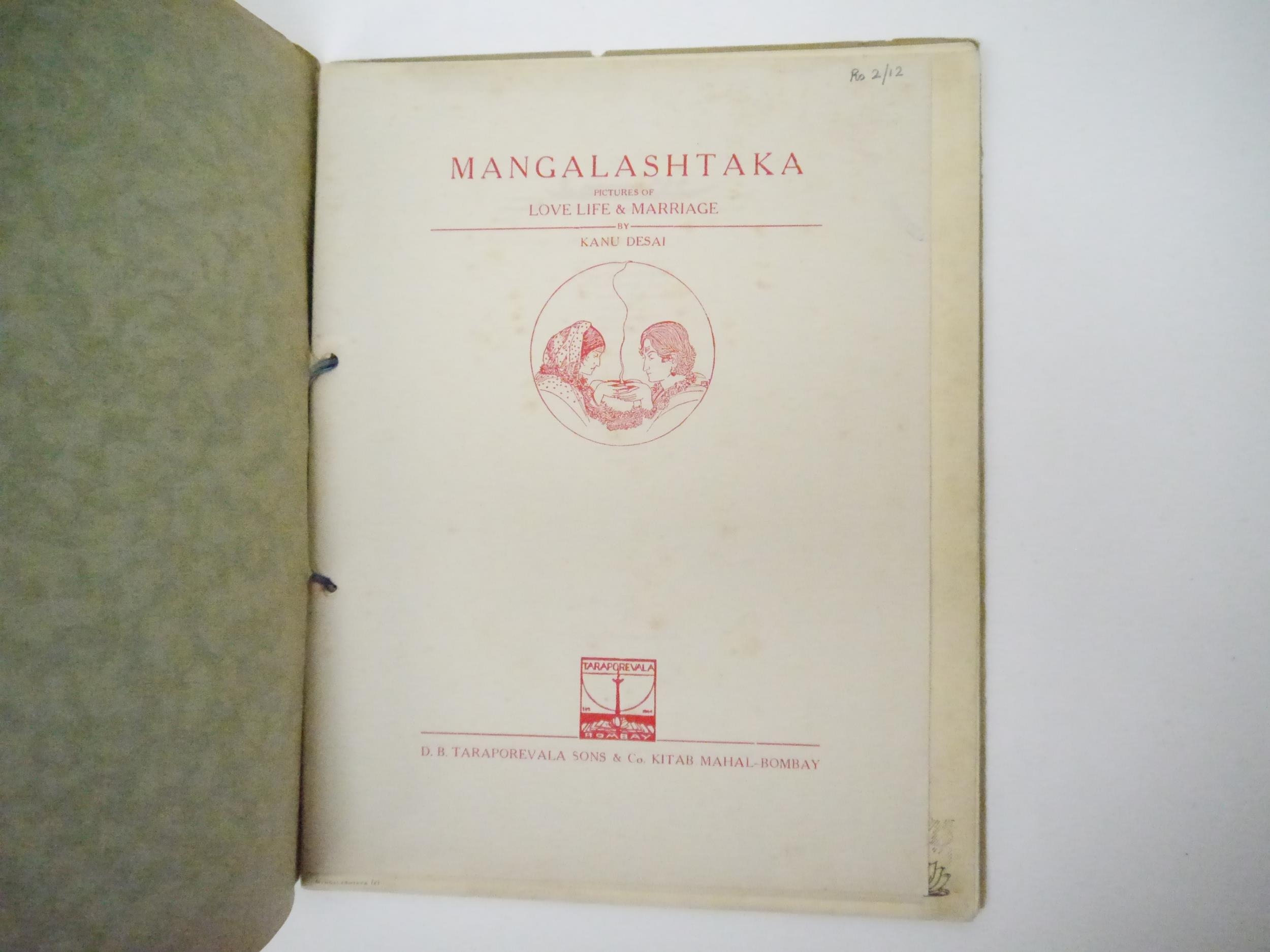 (India.) Kanu Desai: 'Mangalashtaka. Pictures of Love Life & Marriage.', Bombay, Taraporevala & Sons, [no date, c. 1940's). 4to (23 x 29 cms). Title leaf + single text leaf + 8 plates by Kanu Desai (1907-1980) held together with ribbon in original decorative printed wraps. Three plates with ink annotation to lower margin in English by a previous owner.