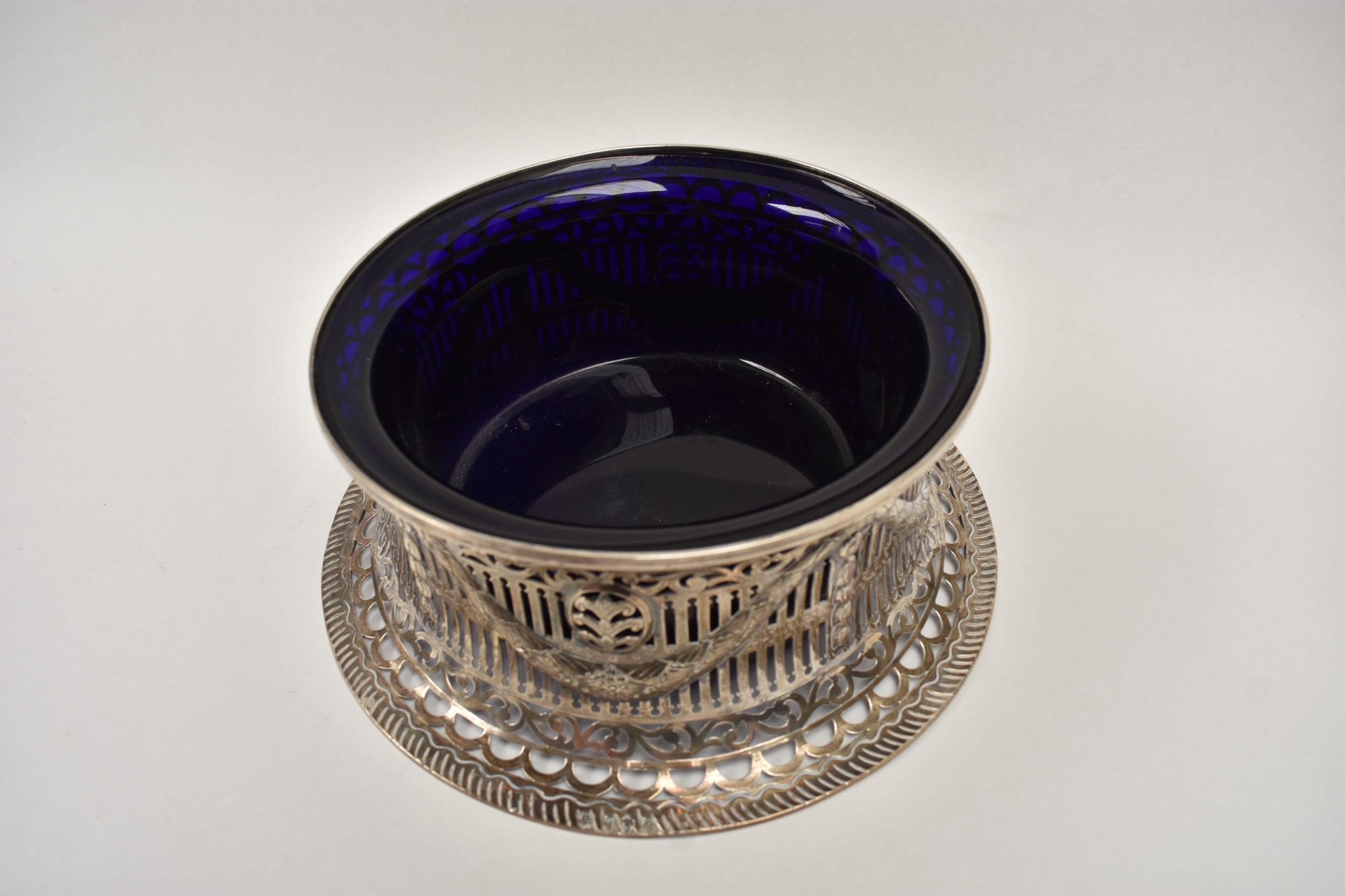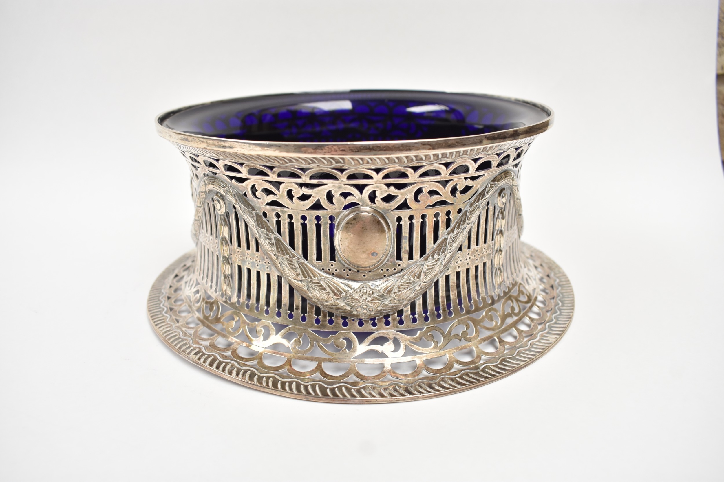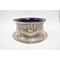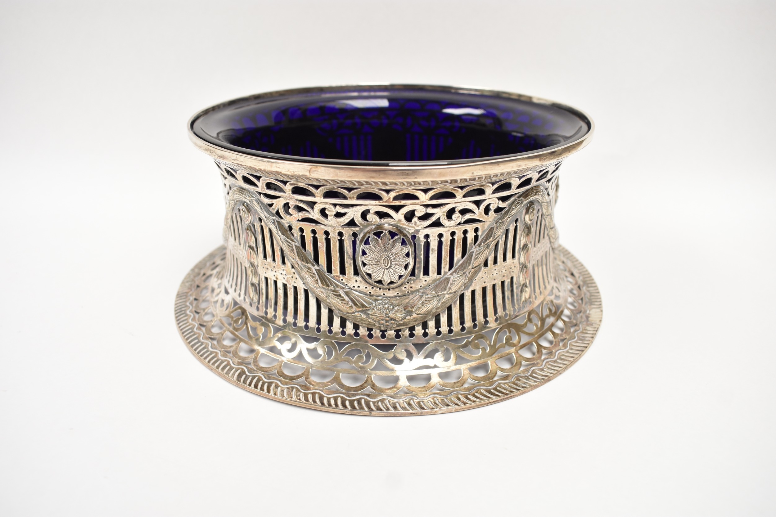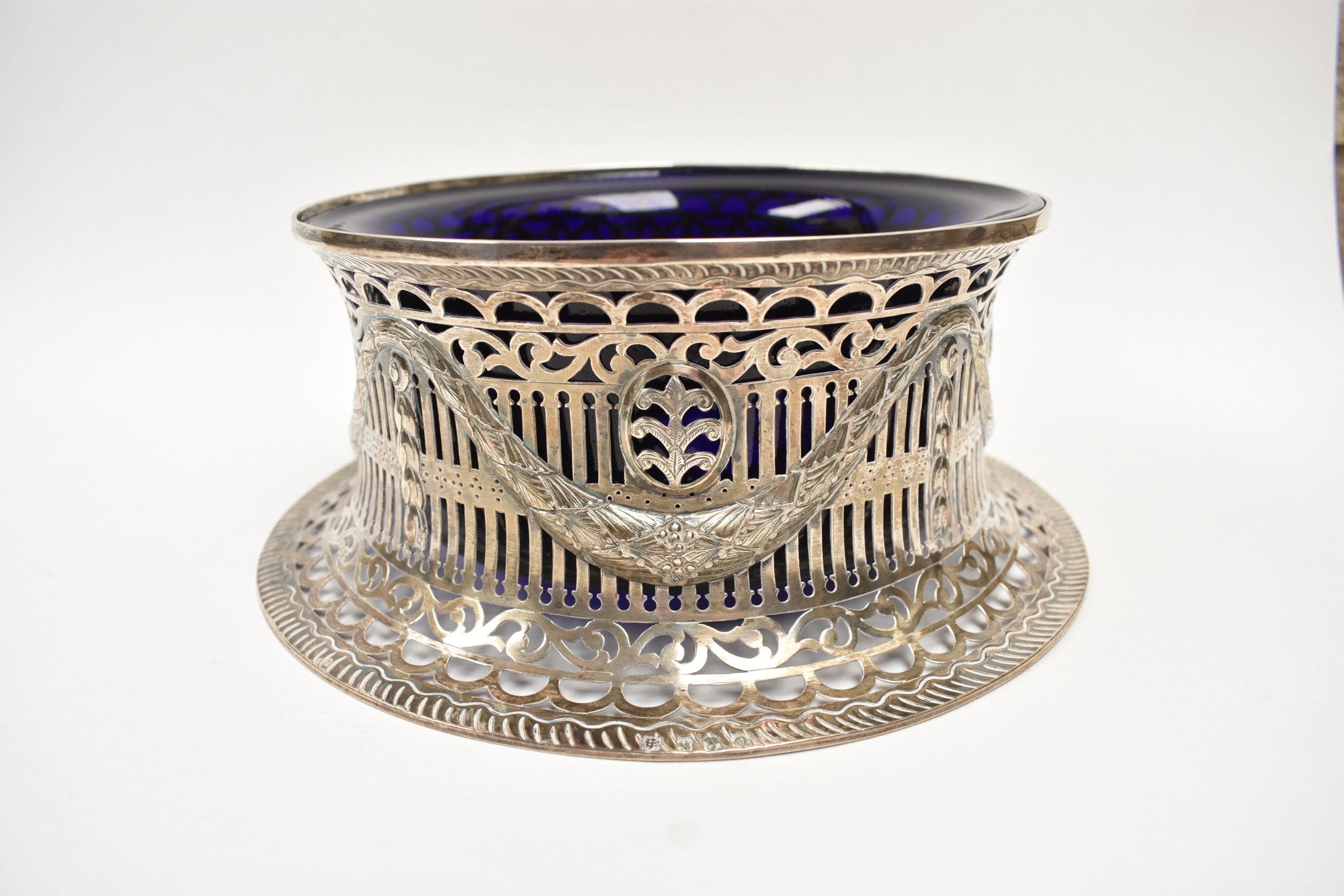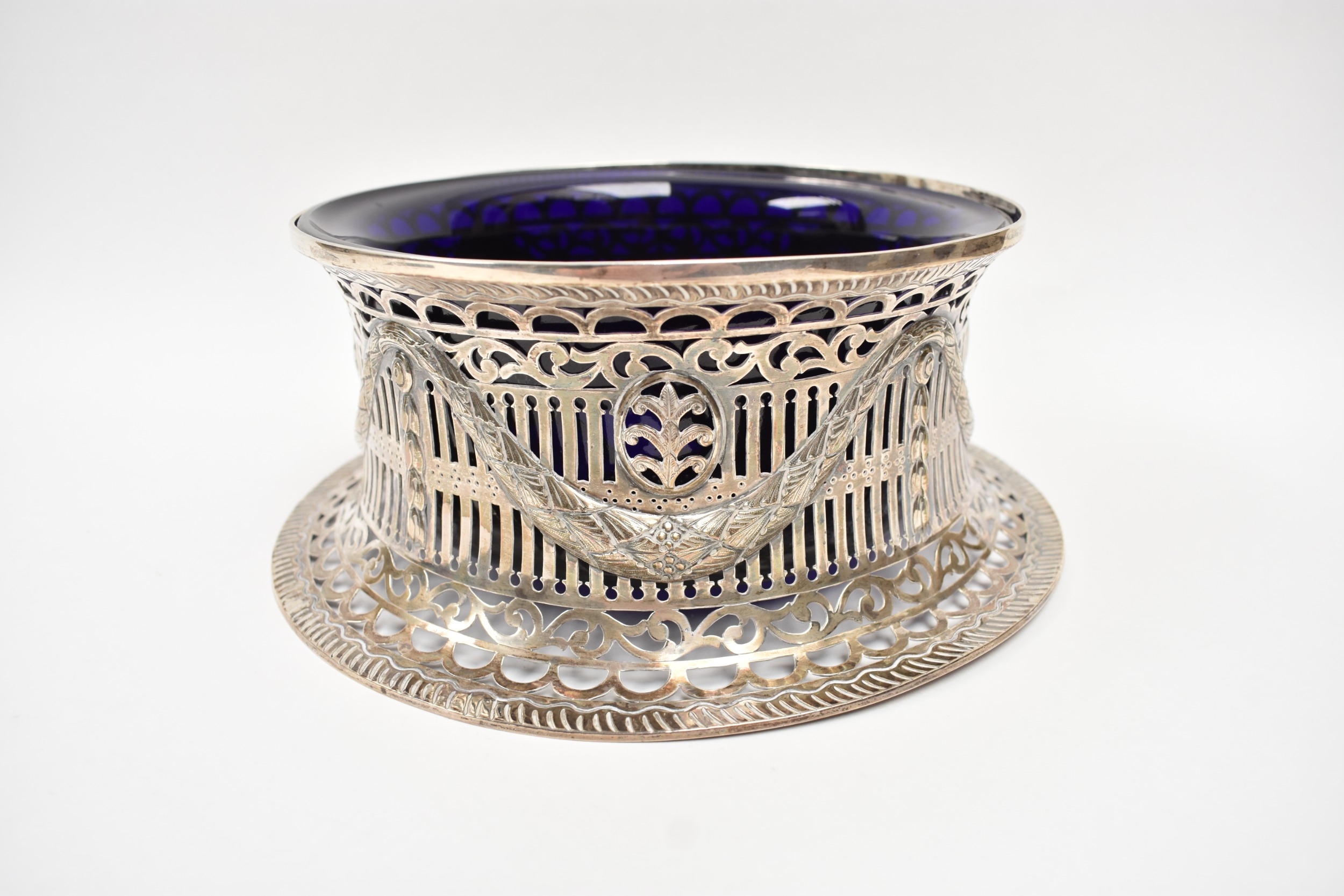 A Georgian Irish silver potato ring and later blue glass liner, Edmund Johnson, Dublin, 1908, box diameter 22cm, top diameter 18.5cm, 418g