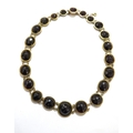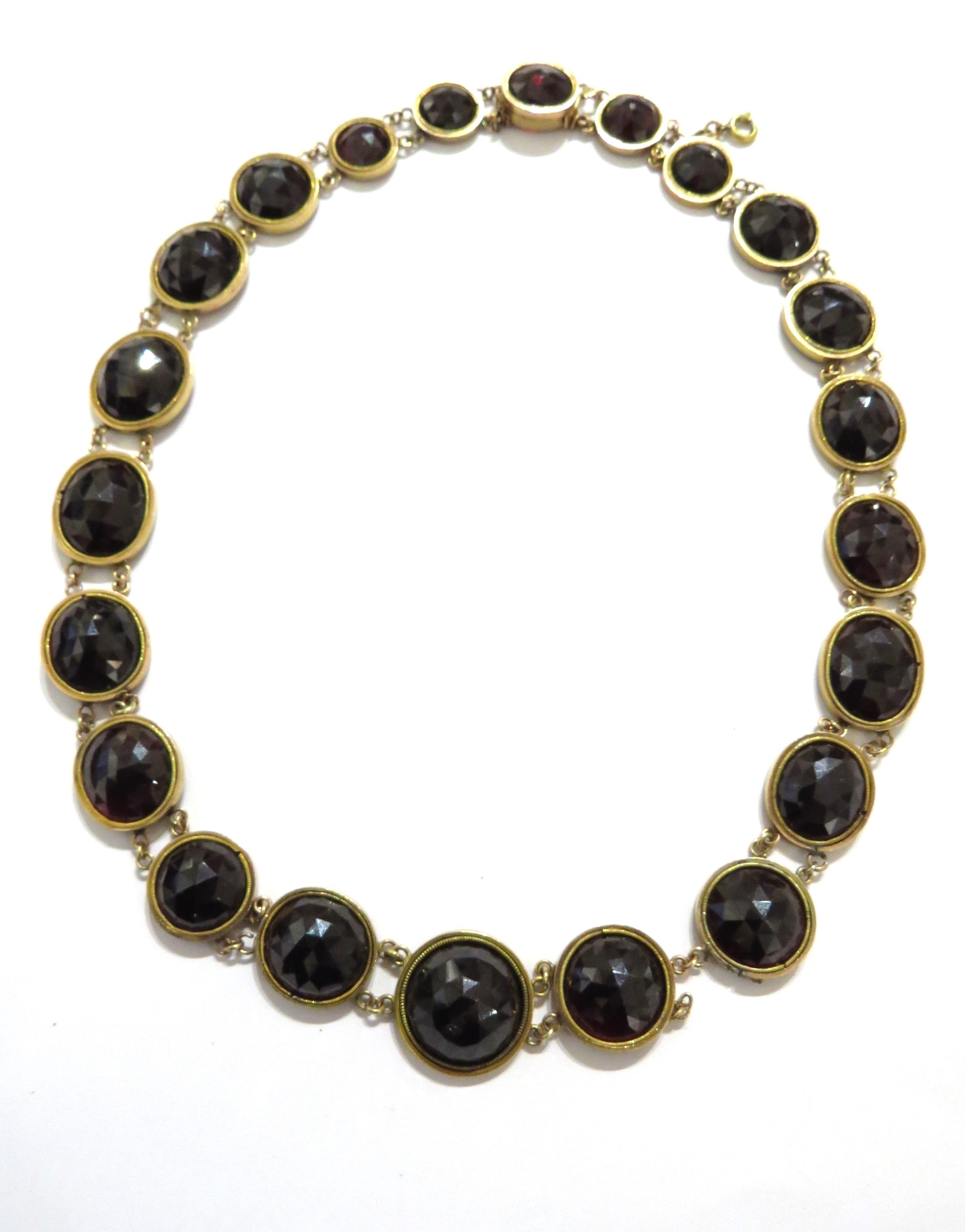 A garnet rivière necklace with oval and circular domed facet cut garnets, unmarked gold, 45cm long (two links unattached)