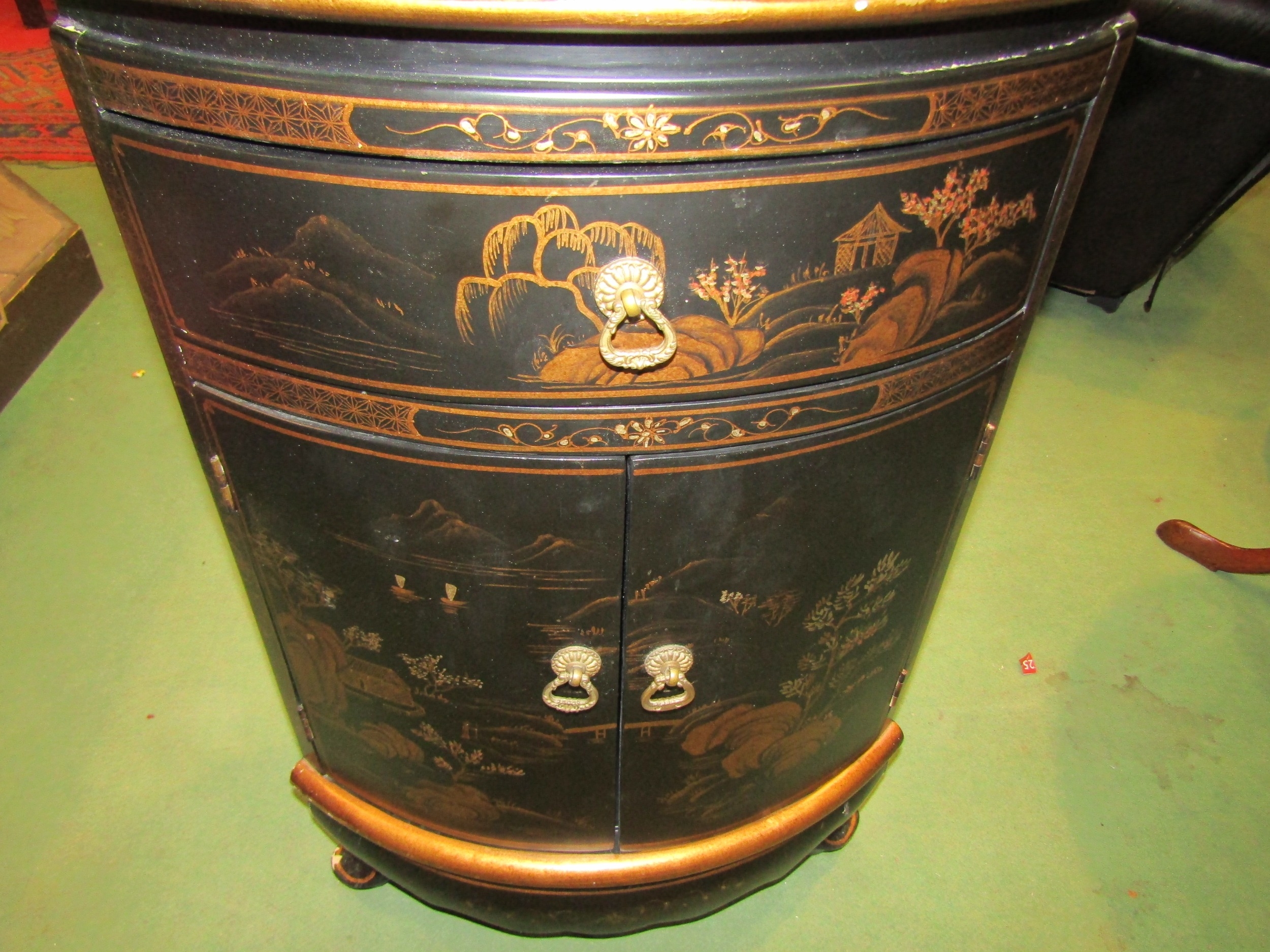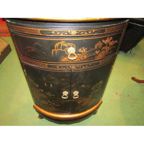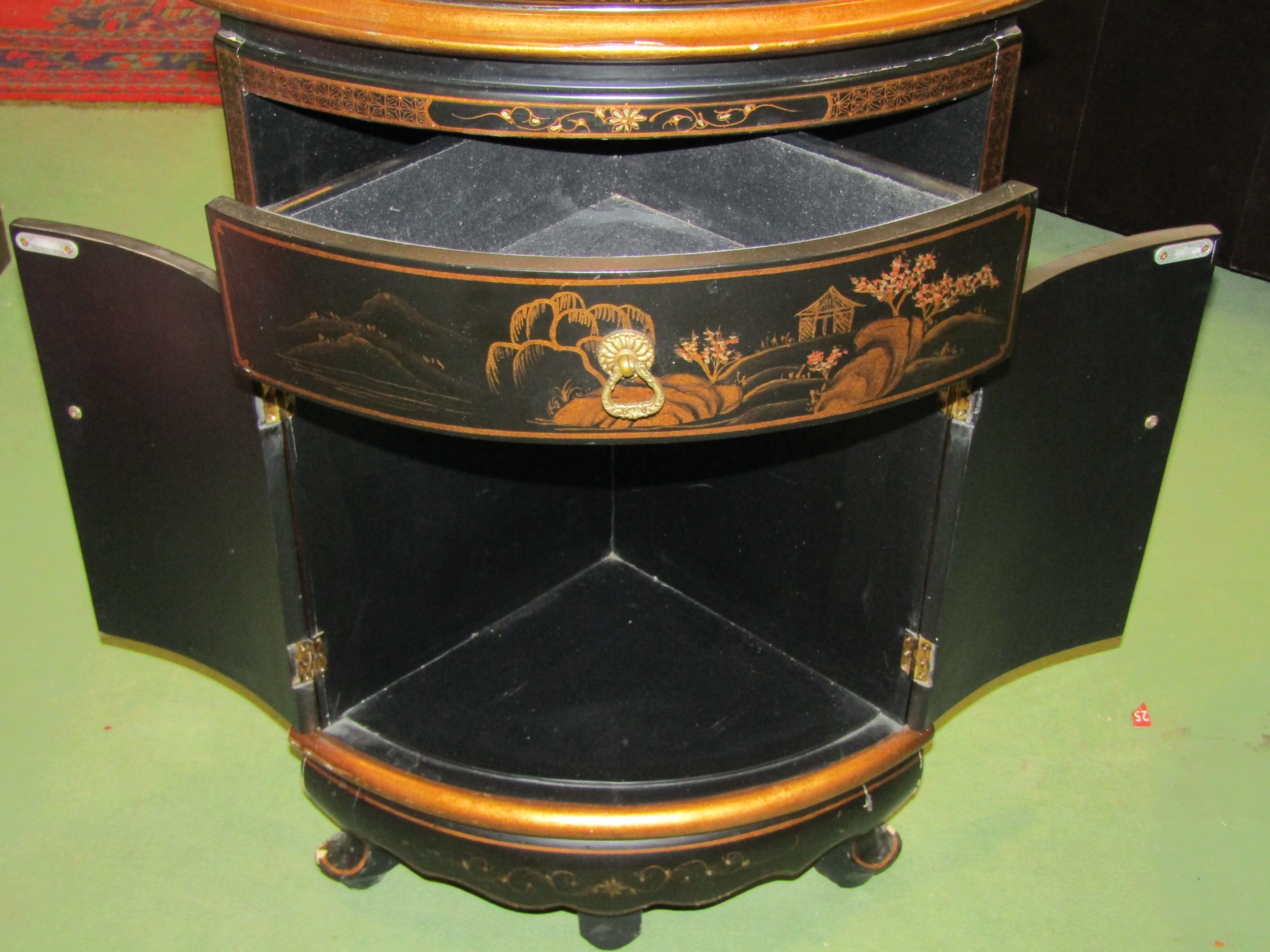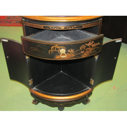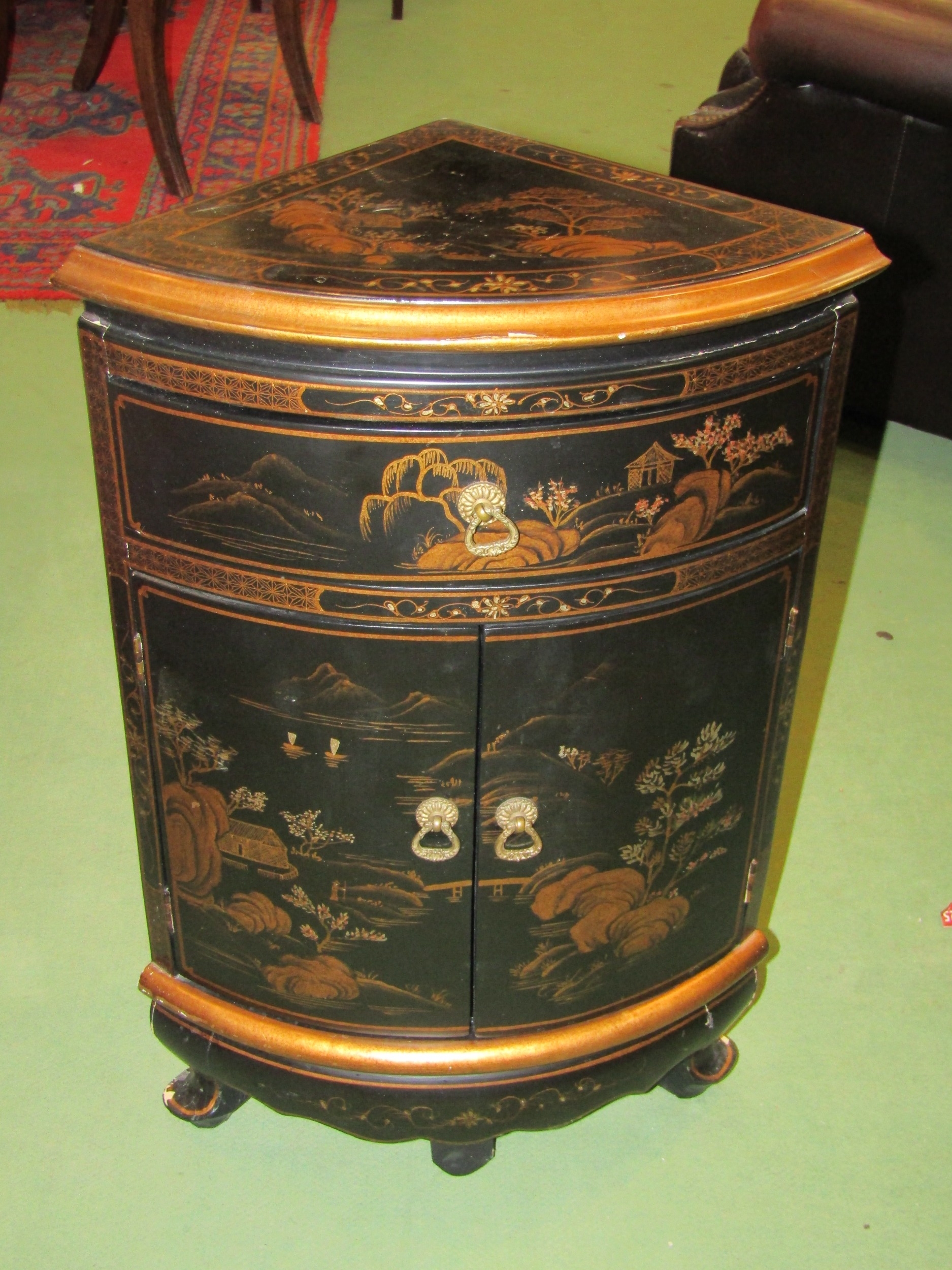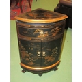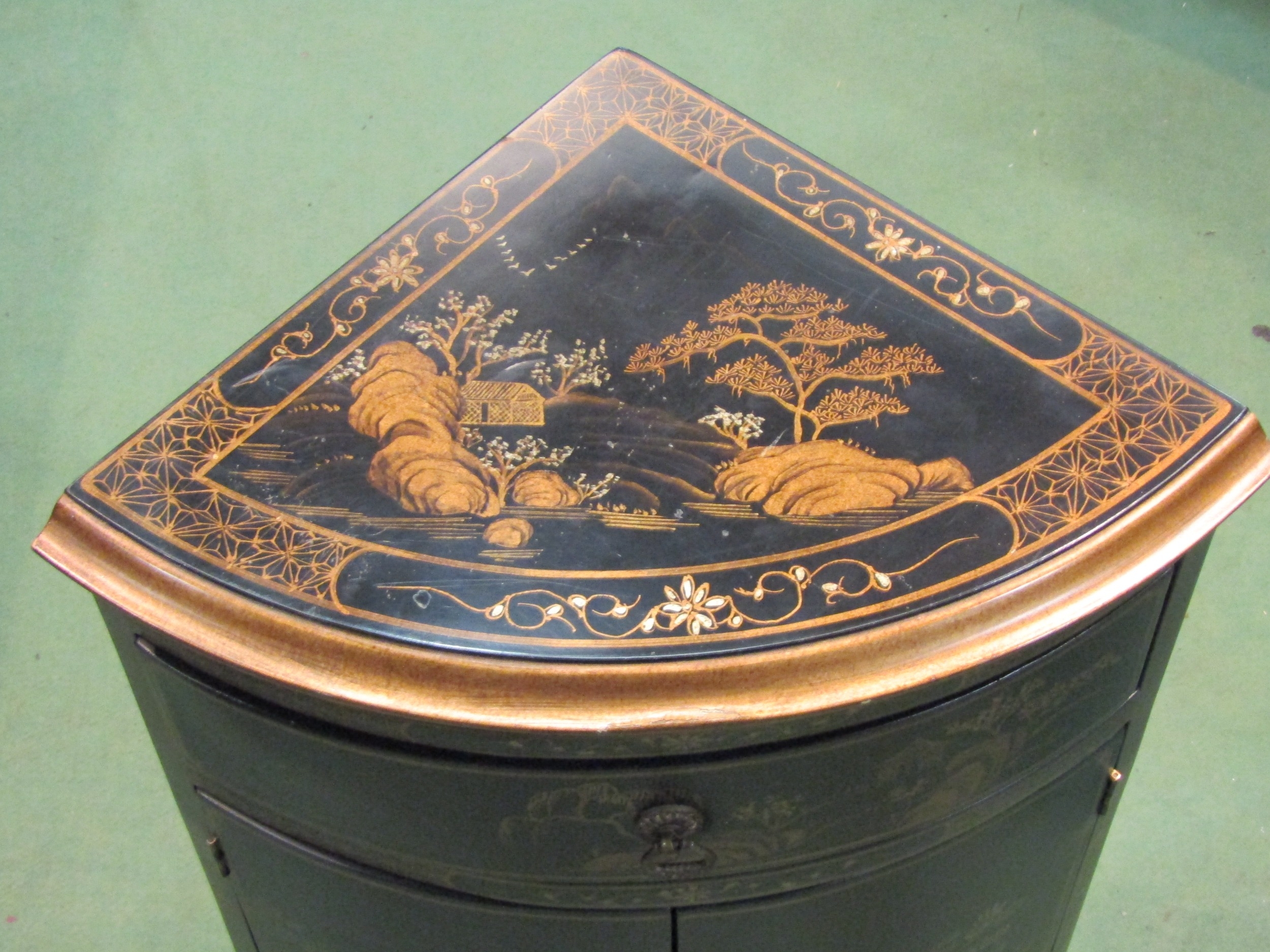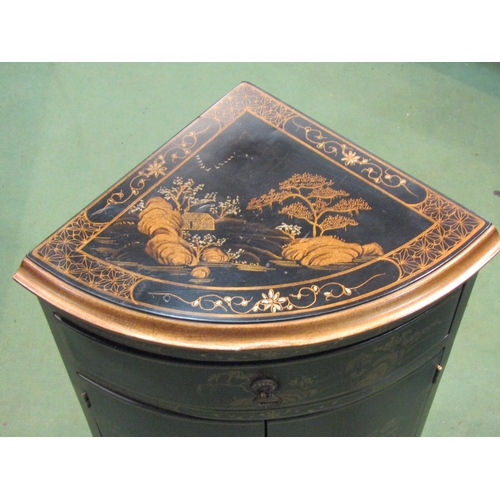 A pair of 20th Century Chinoiserie corner cupboards, one drawer over two doors, 70cm tall x 46cm wide x 33cm deep
