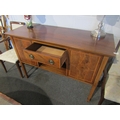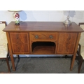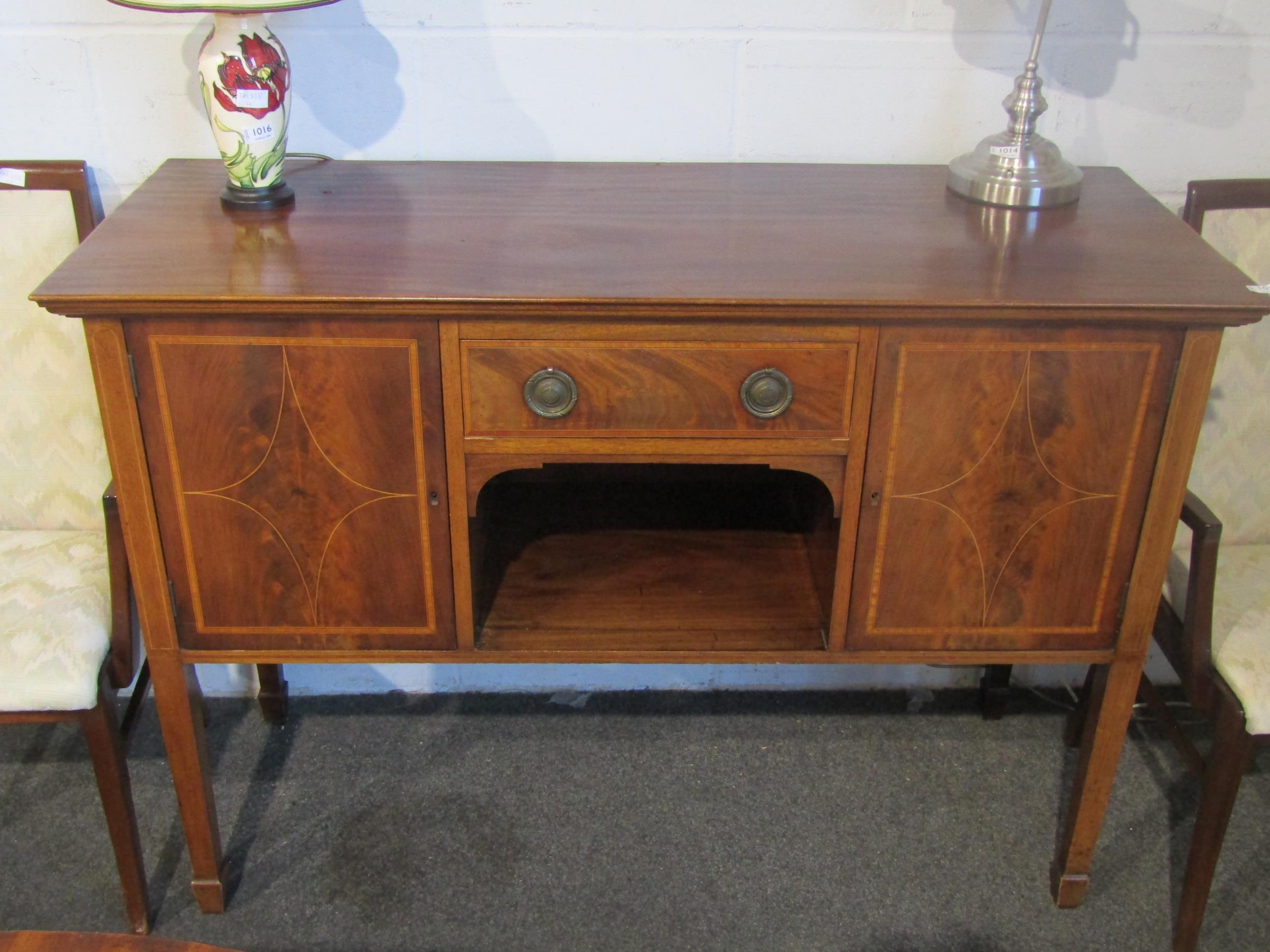 A Regency style flame mahogany dresser base, central drawer over an alcove, flanked by two cupboard doors, satinwood inlay, on square tapering legs to spade feet, 97cm tall x 138cm wide x 55cm deep