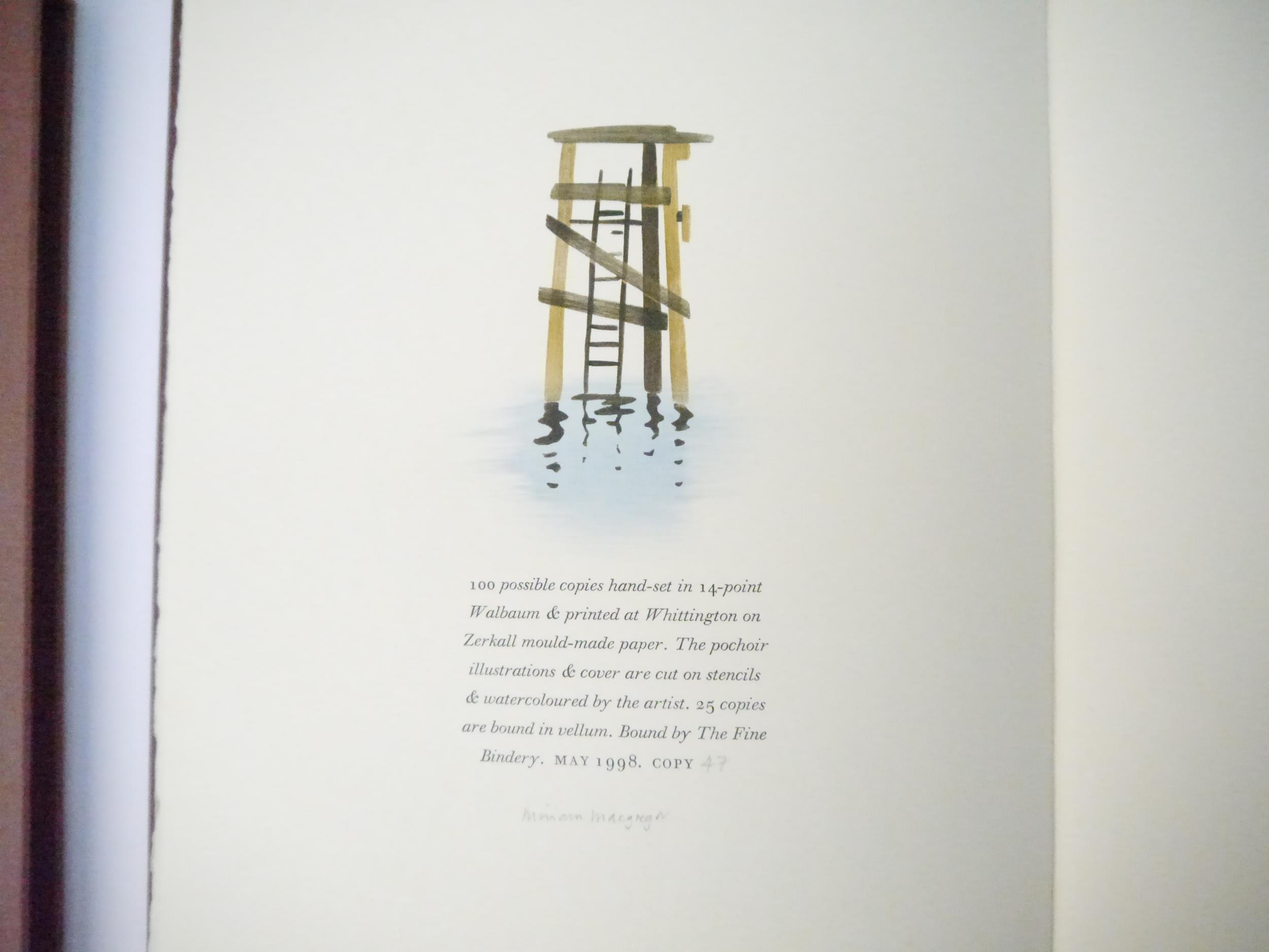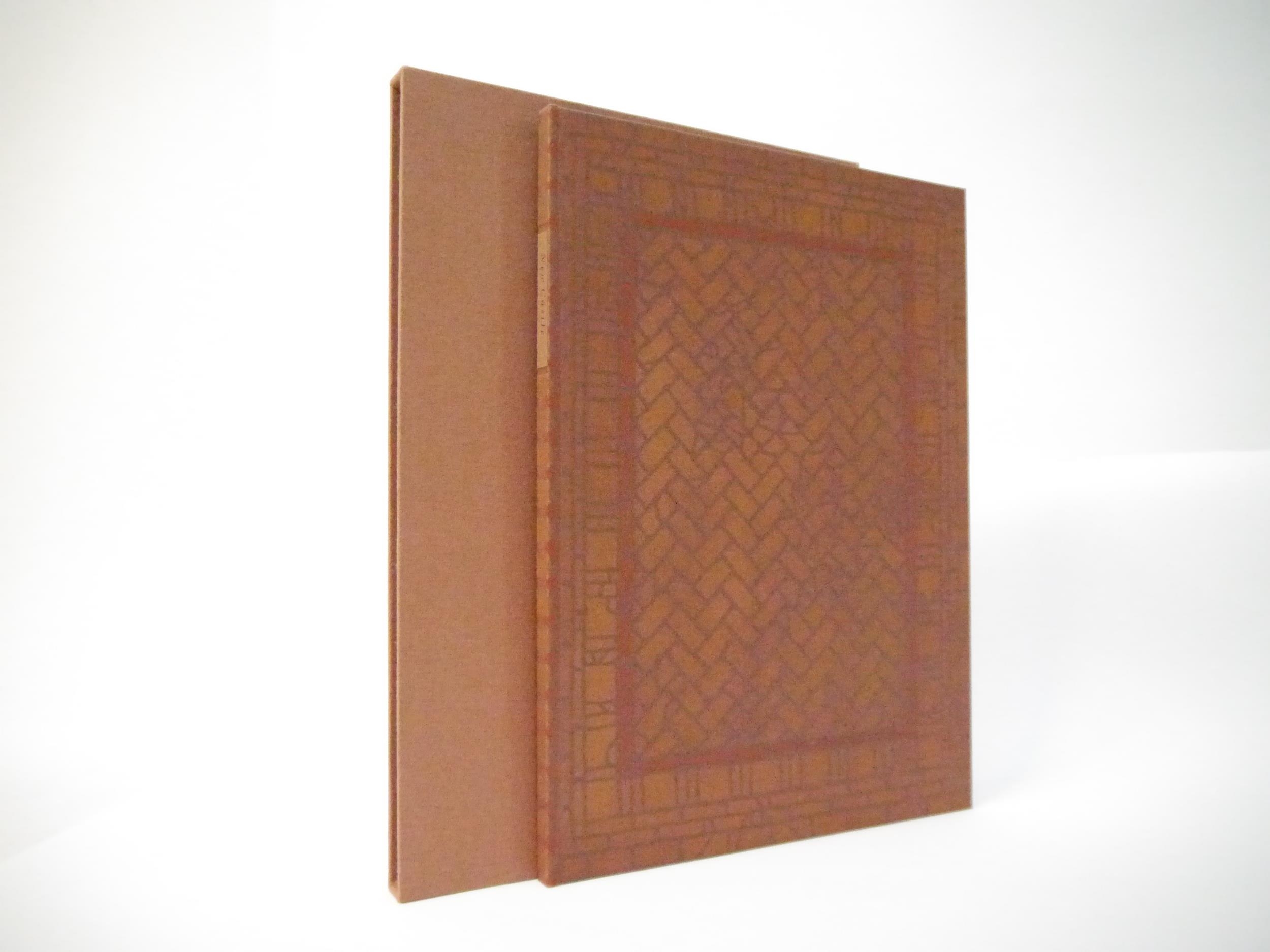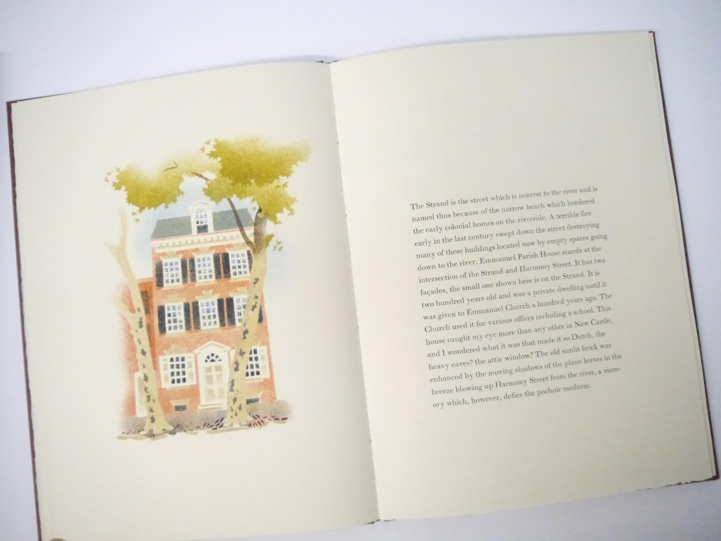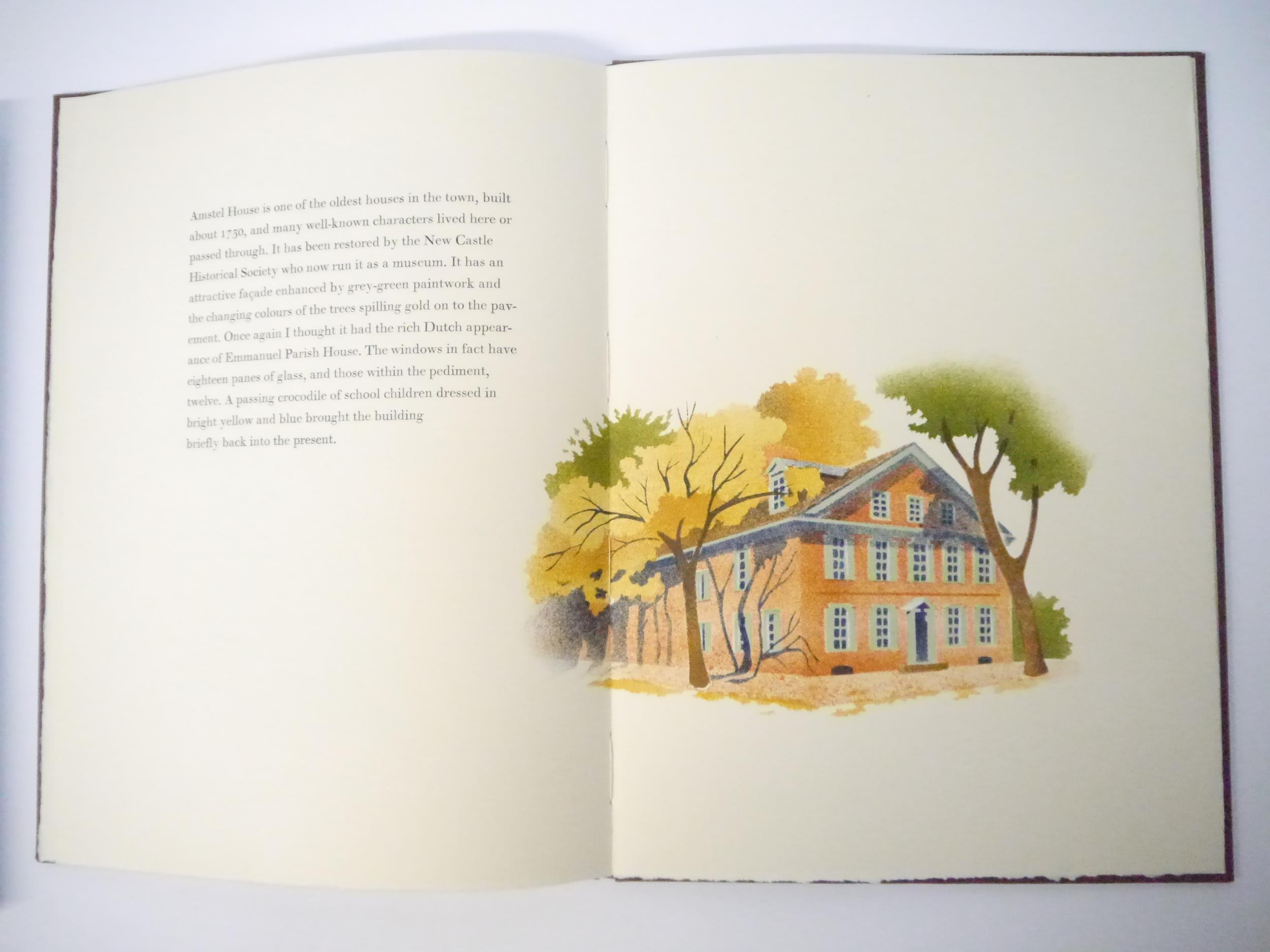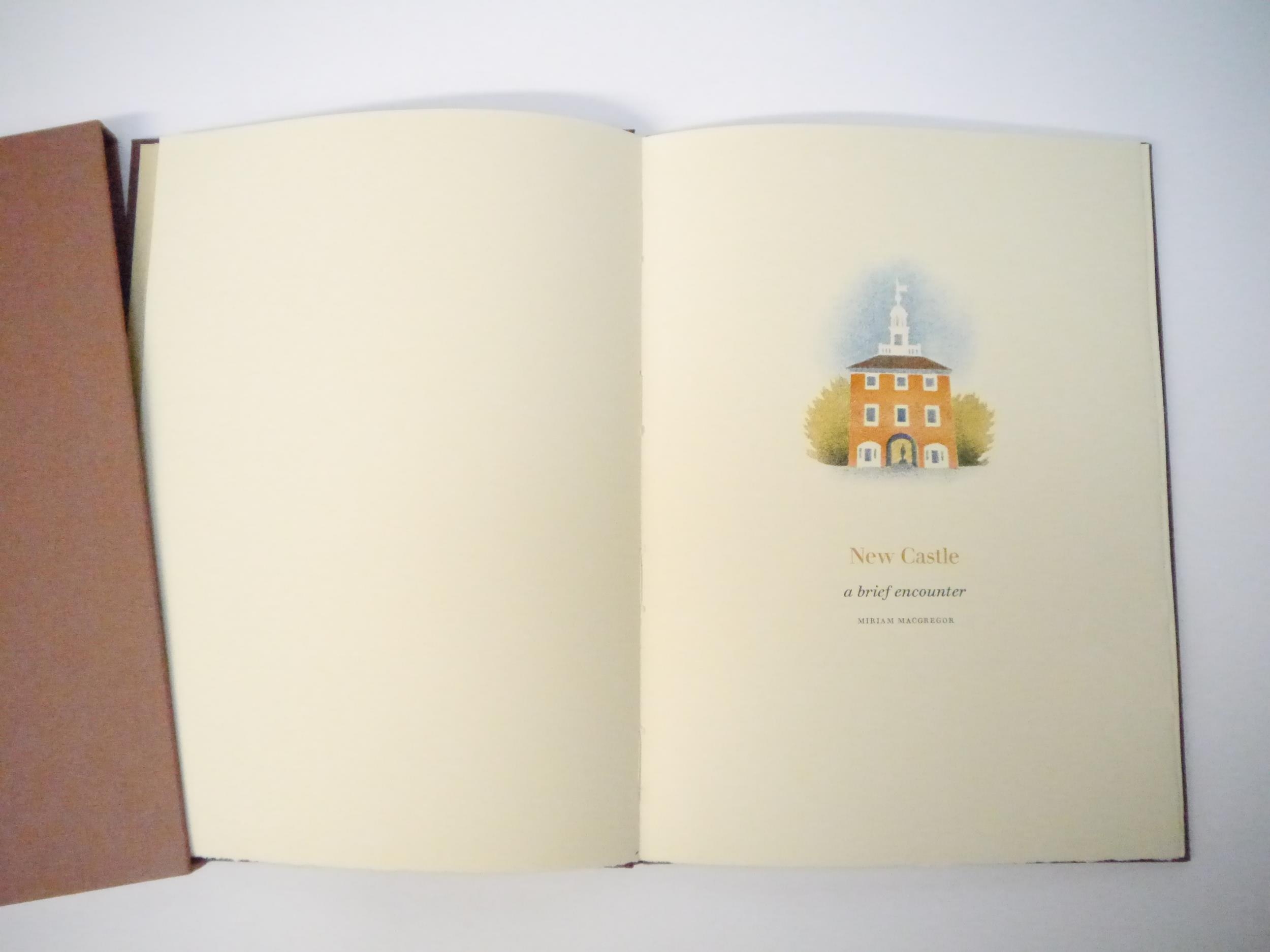 Whittington Press. Miriam Macgregor: 'New Castle: A Brief Encounter.', Risbury, Whittington Press, 1998, limited edition, an edition of “100 possible copies” of which this is one of 75, numbered (47) and signed by Miriam Macgregor, 12 original pochoir images coloured through stencils in water colour (printed without key lines) by Miriam Macgregor, 4to (29.5 x 21.5cm), bound by The Fine Bindery in original red decorated paper covered boards with a pattern cut in stencils by the artist, printed title label to spine, original slipcase. Macgregor's recollections from a day spent wandering around New Castle, the historic town in Delaware, during an Oak Knoll fine press fest, accompanied by her enchanting pochoir illustrations. One of the most desirable and uncommon of all Whittington books. Fine copy.