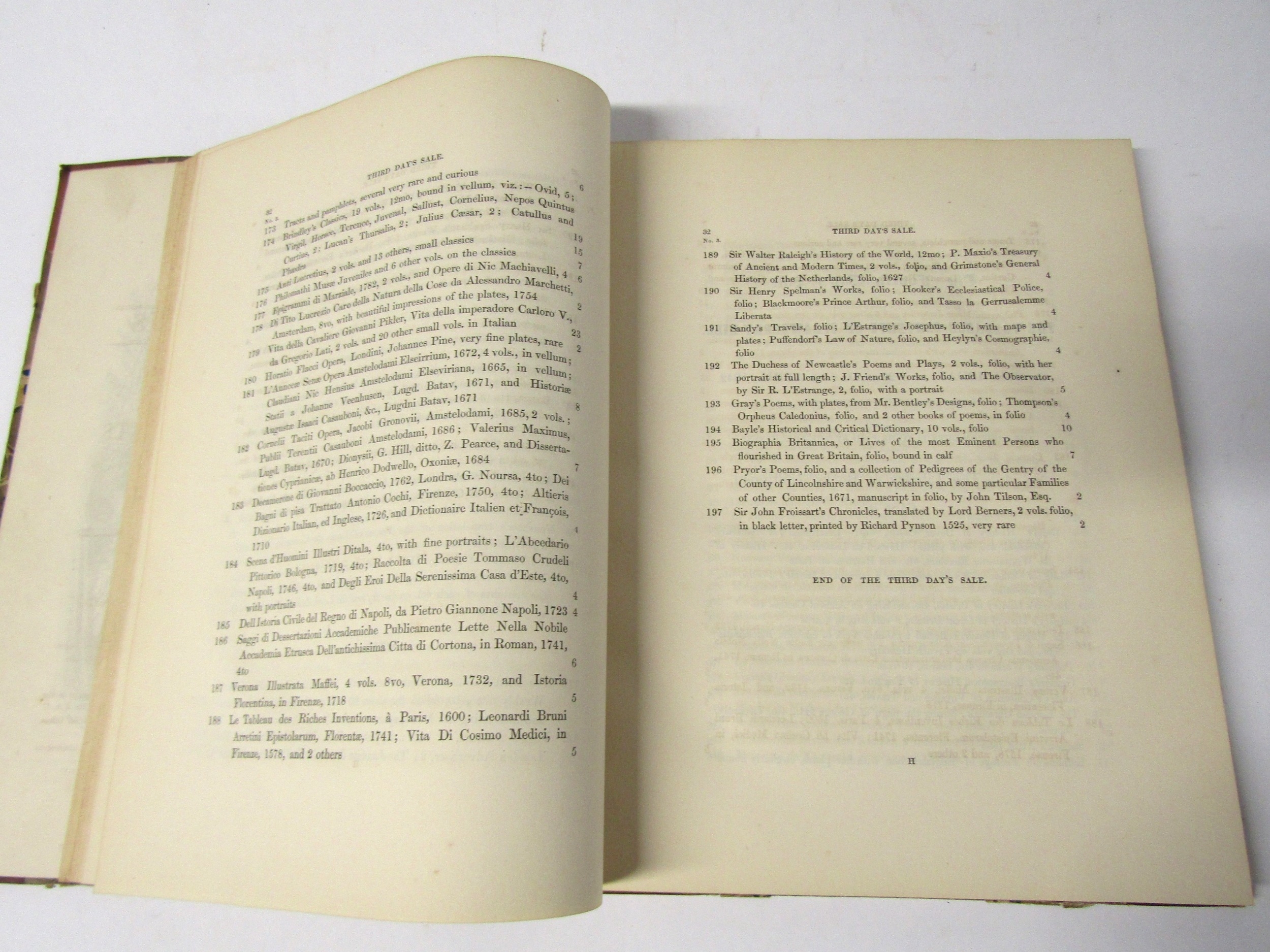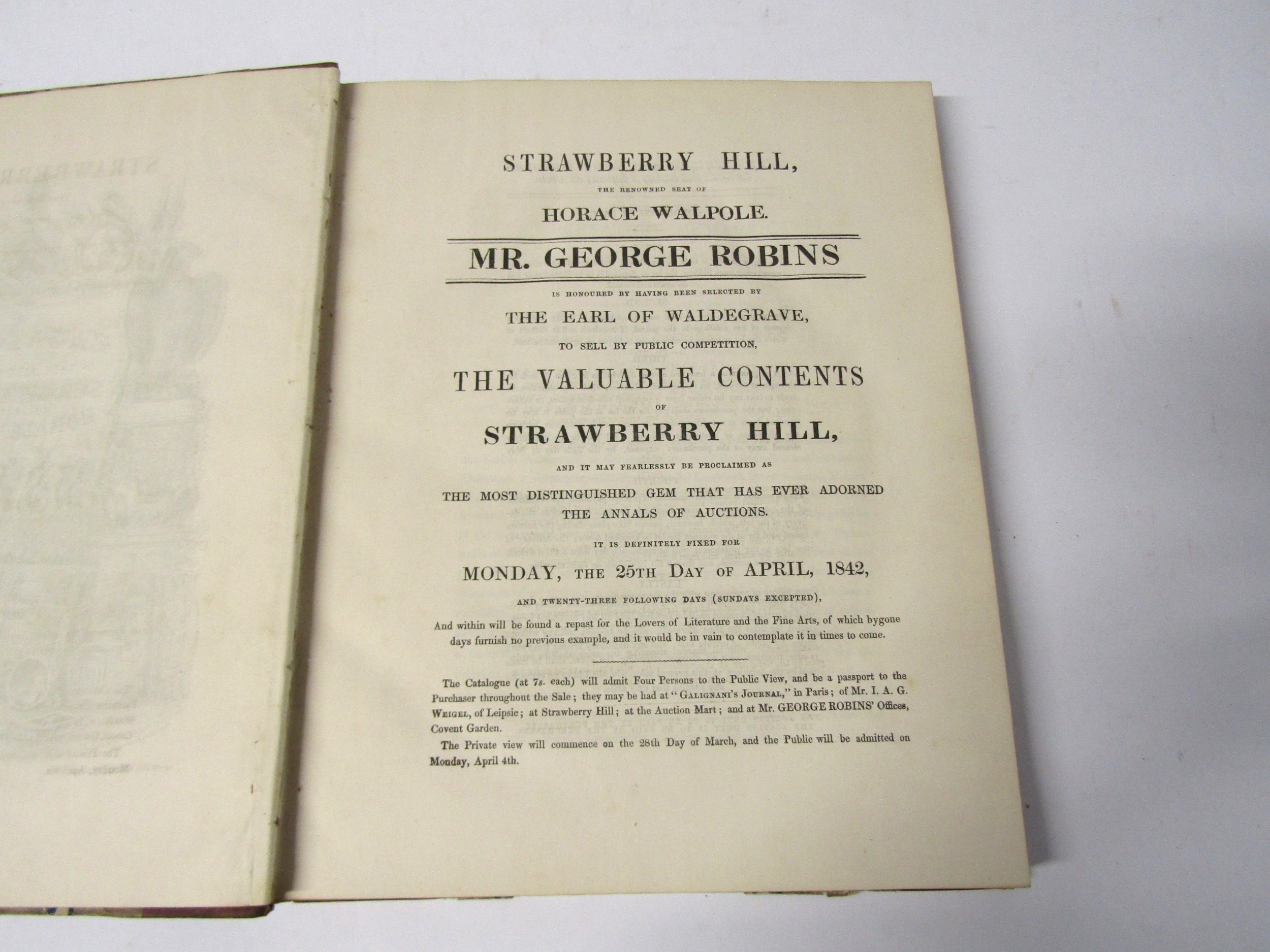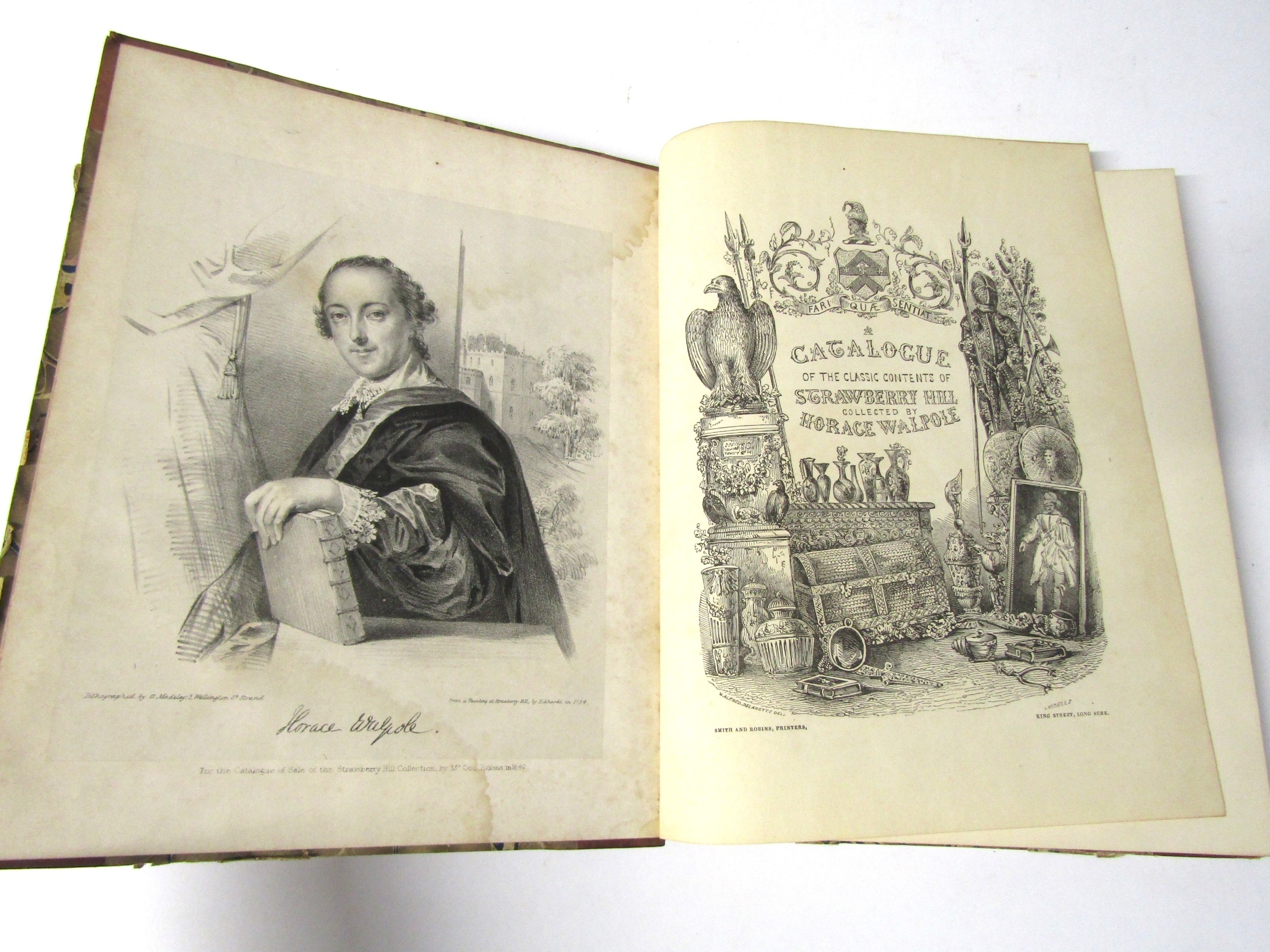 [Horace Walpole]: 'A catalogue of the classic contents of Strawberry Hill collected by Horace Walpole', London, Smith & Robins, [1842], lithograph portrait frontispiece, additional wood-engraved pictorial title page and 11 wood engraved illustrations in text, xxiv, 250pp, 4to, old half calf gilt, marbled paper covered boards. The auction included over 1,300 lots of books, 300 lots of coins and medals, and a wealth of other material, including bronzes, paintings, furniture and suits of armour.