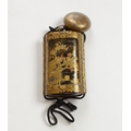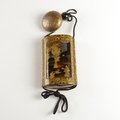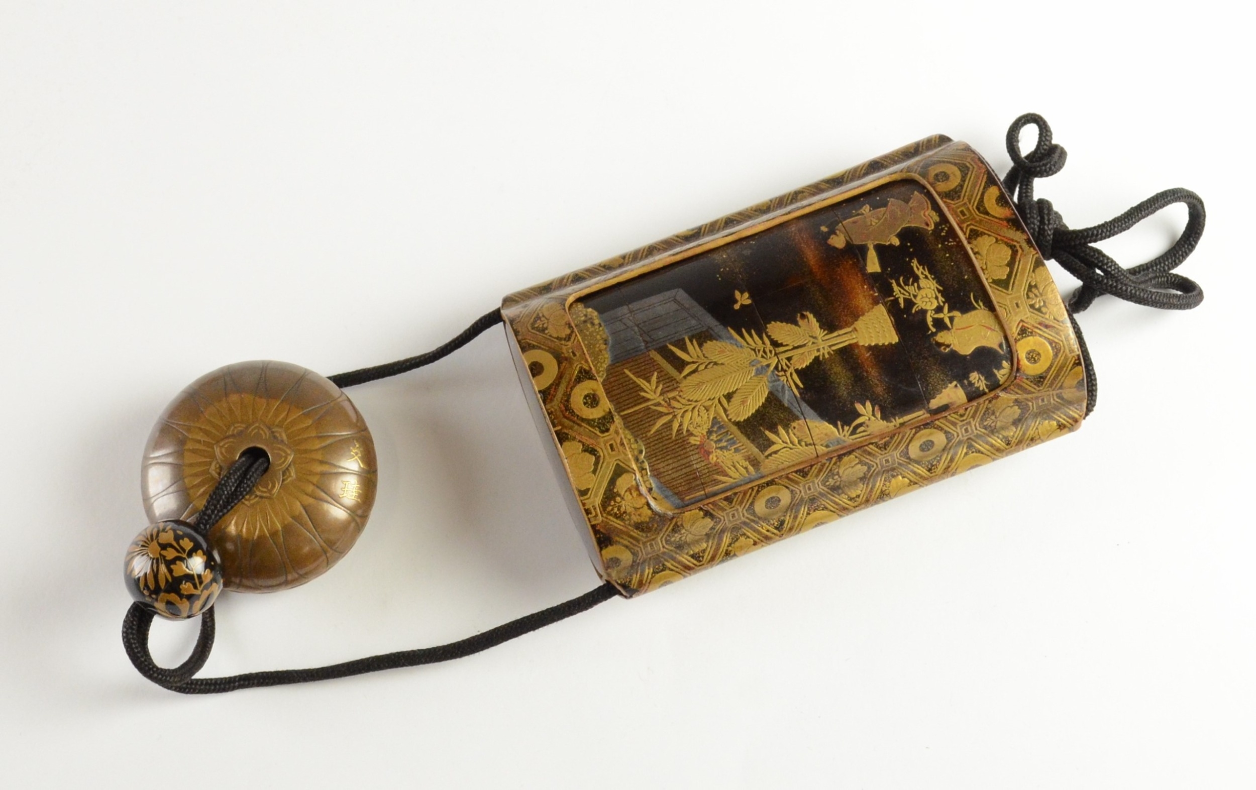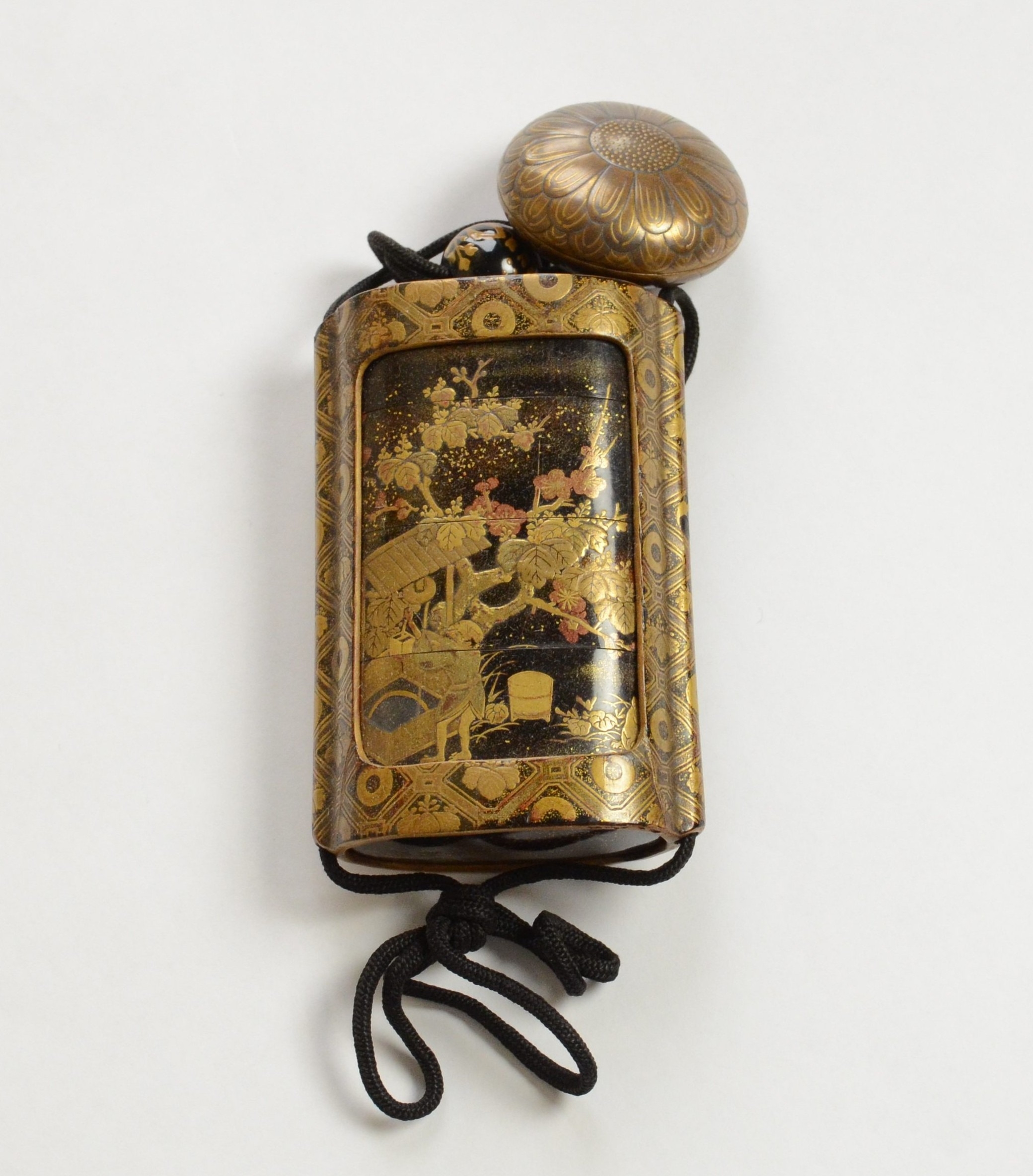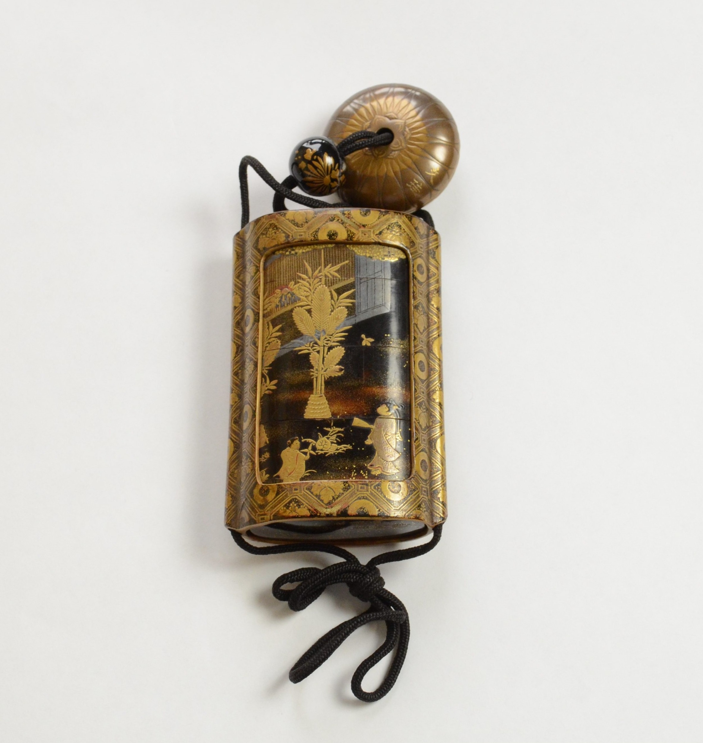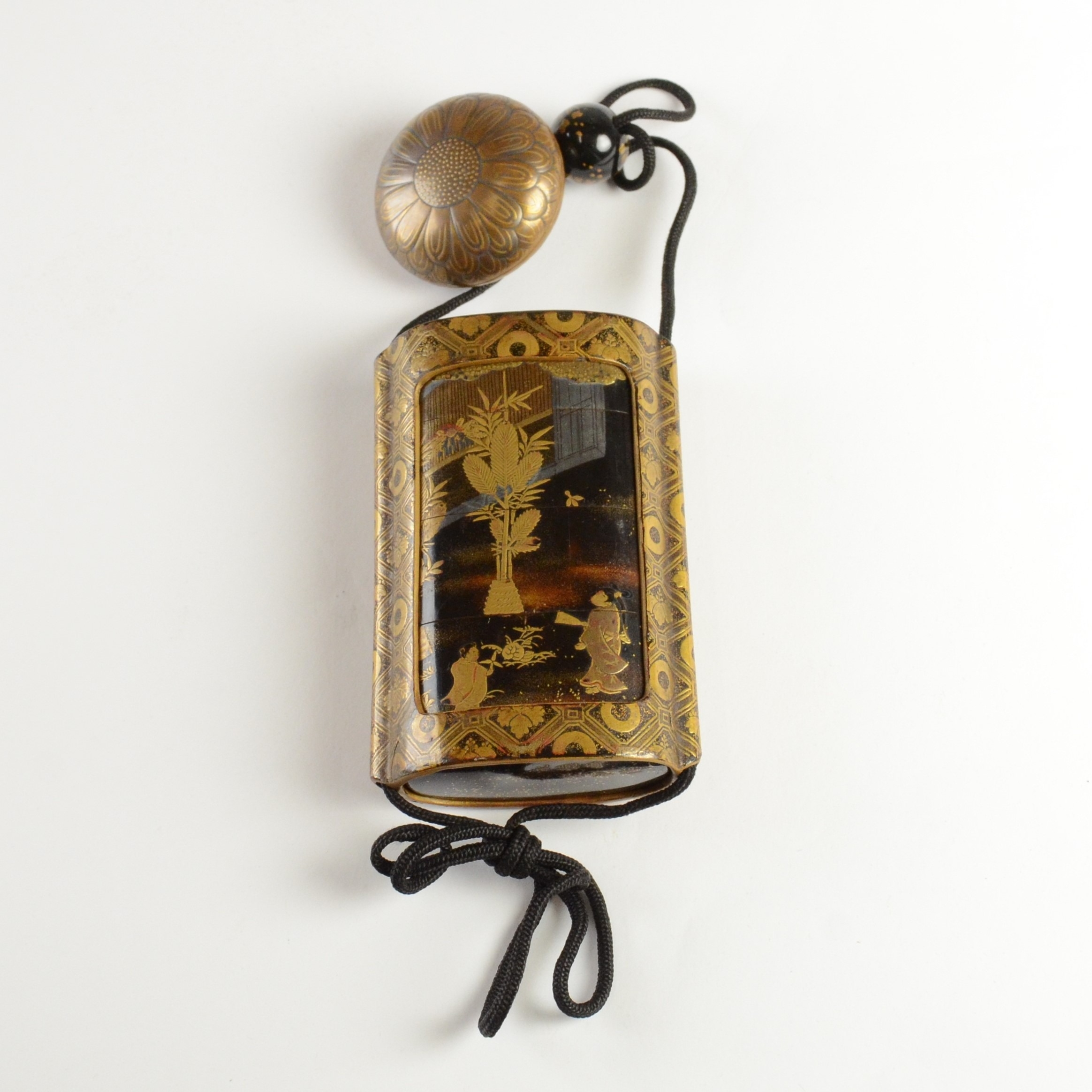 A black lacquer saya (sheath) three case inro decorated with figures in domestic activities, floral manju netsuke, signed to base
