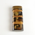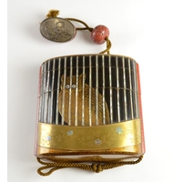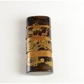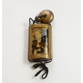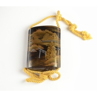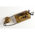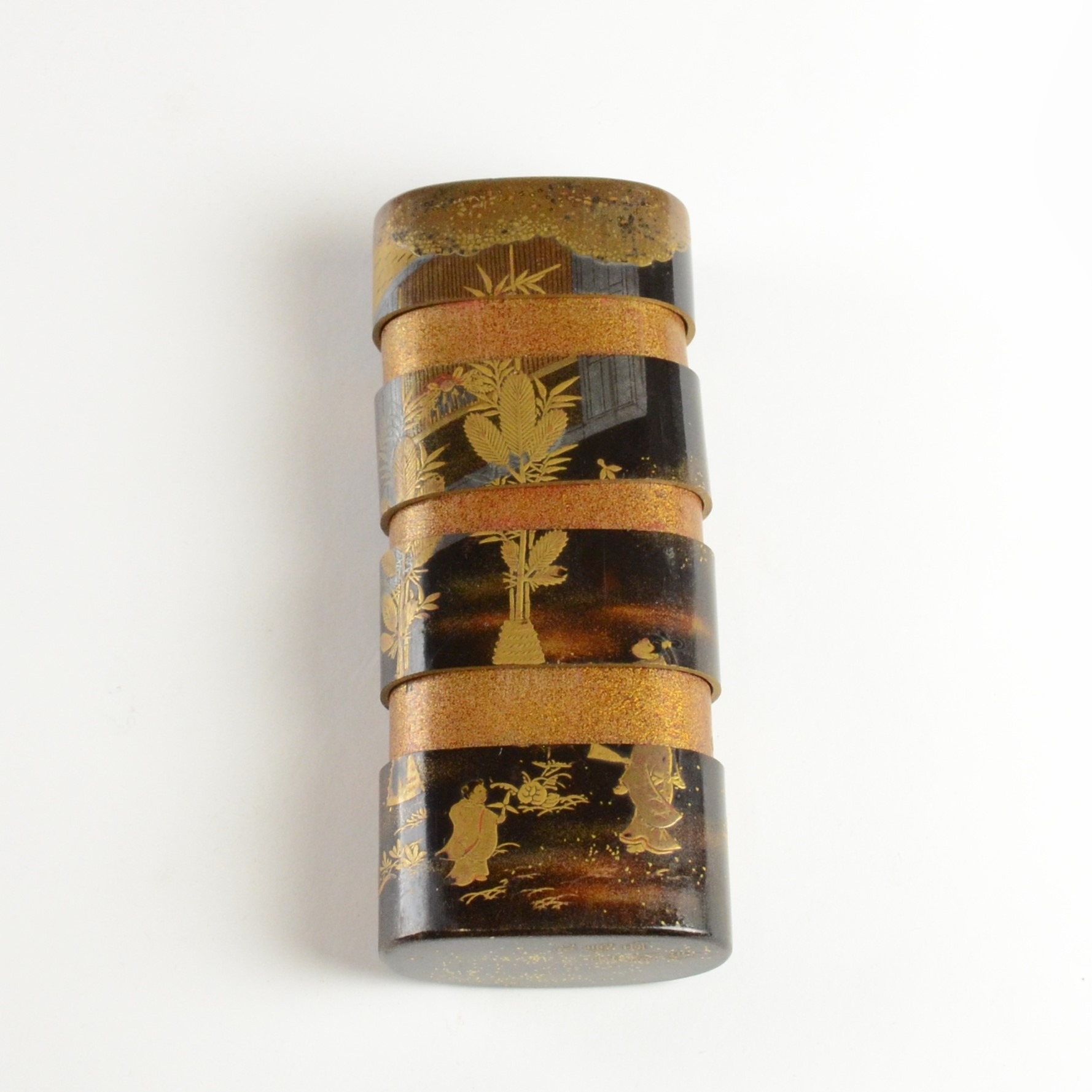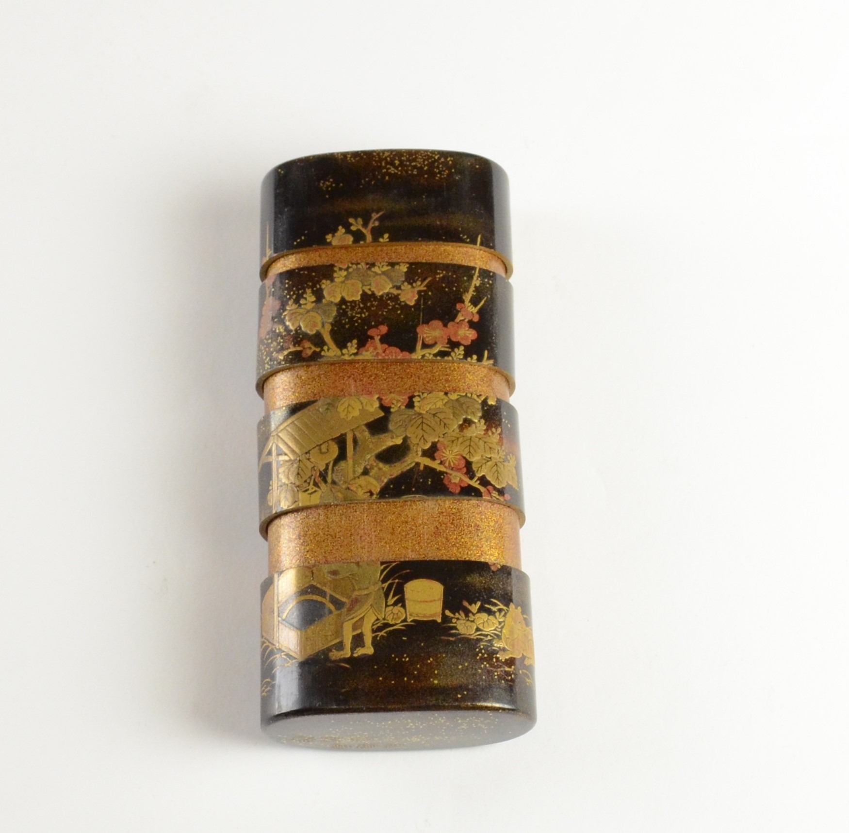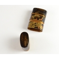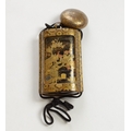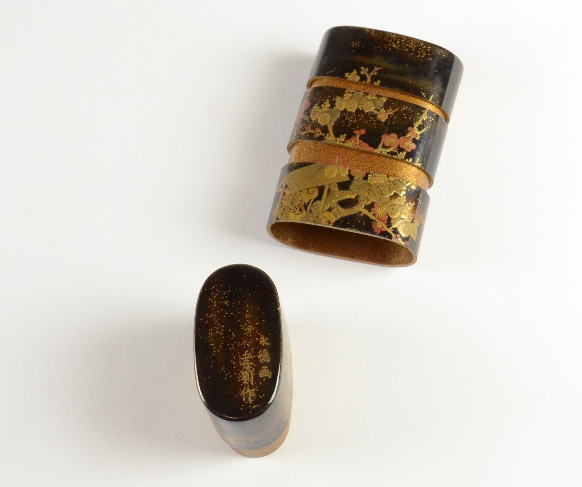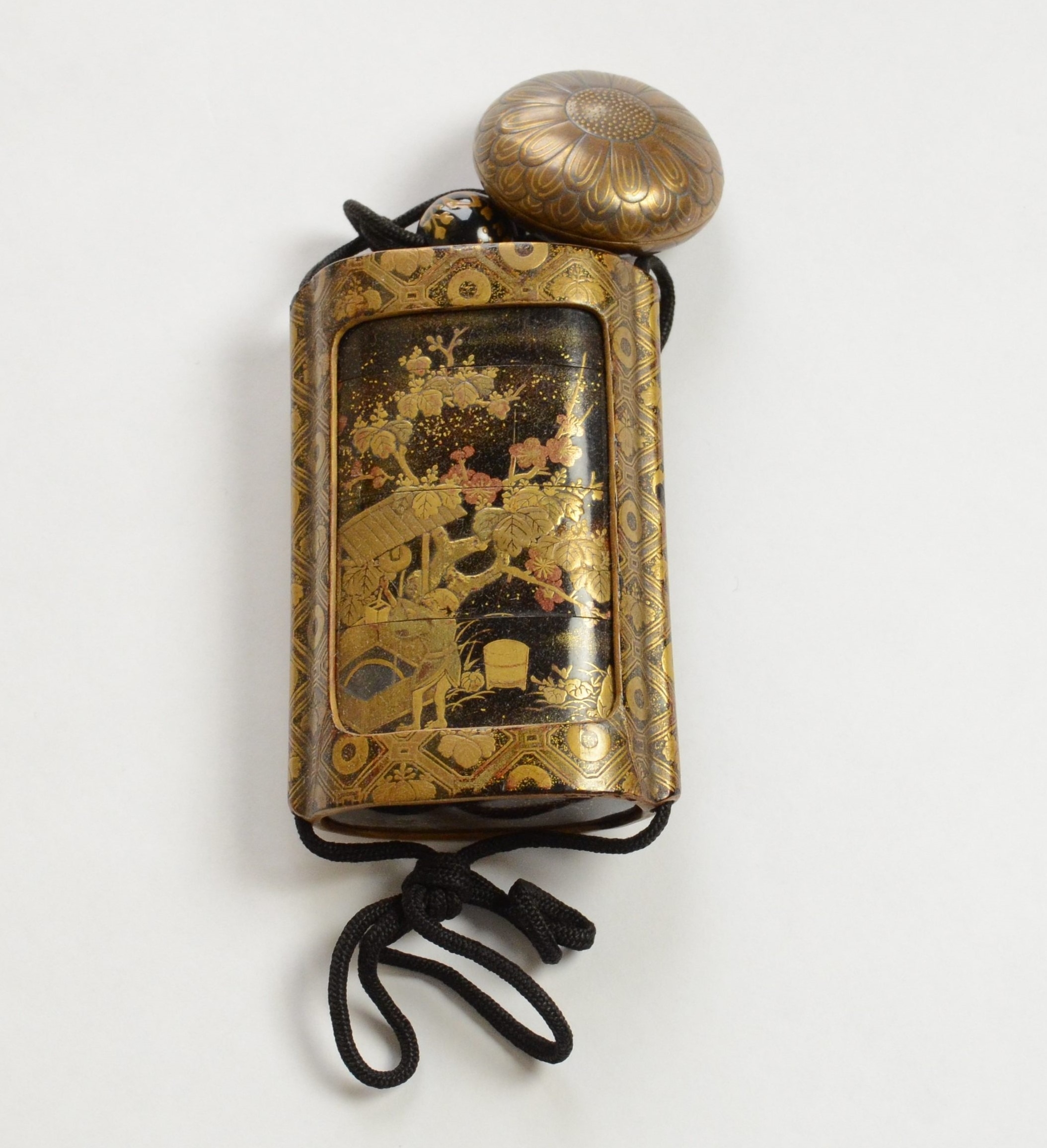 A black lacquer saya (sheath) three case inro decorated with figures in domestic activities, floral manju netsuke, signed to base