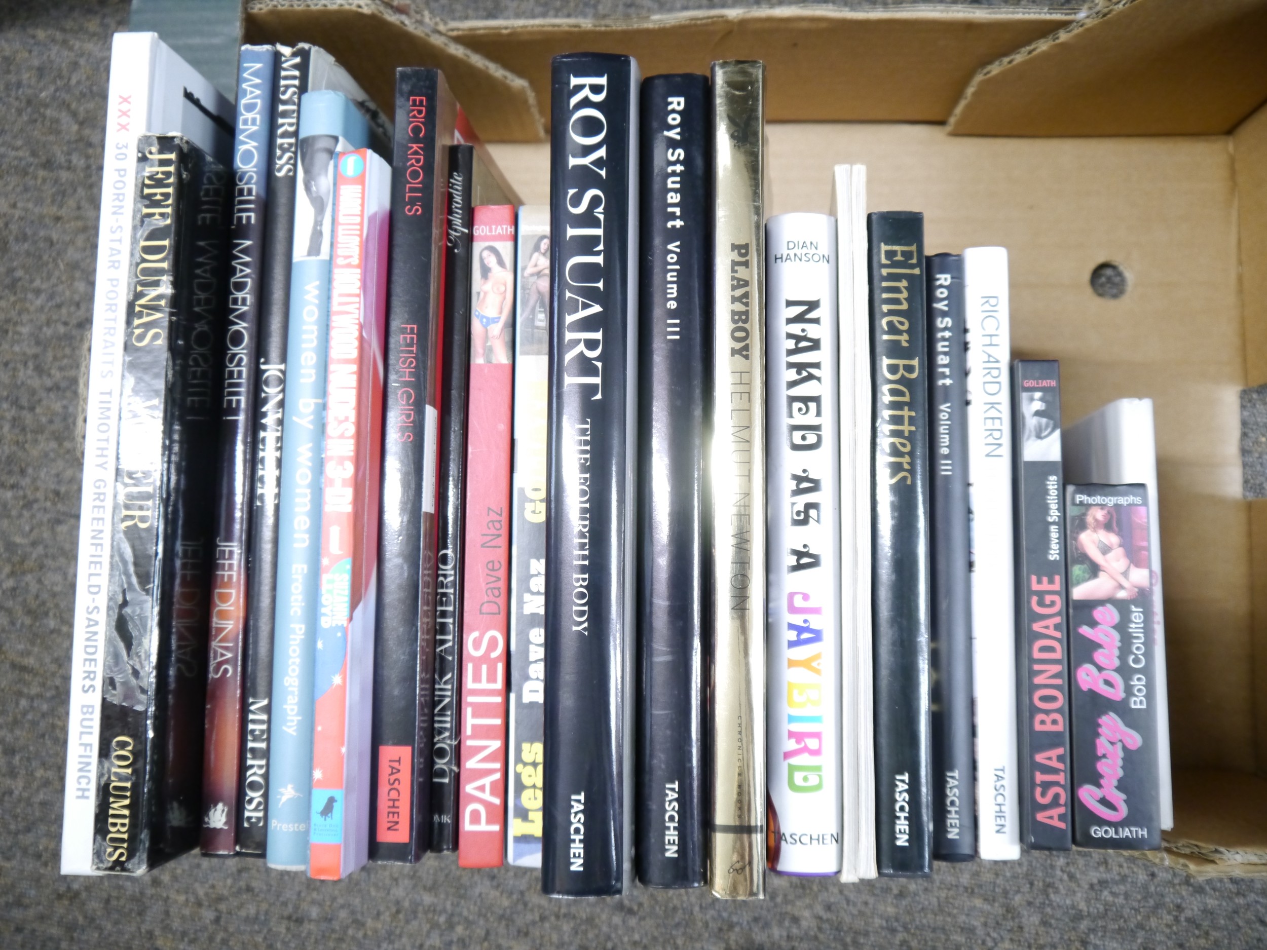 (Erotica.) A collection of 23 assorted erotic photography volumes, including Helmut Newton: 'Playboy', Chronicle Books, 2005, 1st edition, 1st impression, 175,[1]pp, colour and b/w photographic illustrations throughout, large 4to, original pictorial boards, dust wrapper; Dian Hanson: 'Naked as a Jaybird', Koln, Taschen, 2003, 1st edition, 264pp, illustrated from photographs throughout of 1960's Californian hippy nudism, 4to, original boards, dust wrapper, two sheets orig. stickers loosely inserted; Nick Tosches: 'Rear View; More Rear Views', Delilah Books, 1981-1984, 2 volumes, each illustrated from photographs throughout by Jeff Dunas, Bob Guccione, Harvey Wang, J. Trinquart etc etc, each oblong 4to, original pictorial wraps, scarce; Richard Kern: 'Model Release', Taschen, 2002, profusely illustrated from photographs throughout, original pictorial wraps; Bob Coulter: 'Crazy Babe', Goliath, 2003, 1st edition, 368pp, profusley illustrated from colour photographs throughout, oblong 8vo, orig. pictorial boards; 'Elmer Batters. From the tip of the toes to the top of the hose. Edited by Eric Kroll', Taschen, 1995, 1st edition, 211,[4]pp, profusely illustrated from photographs throughout, 4to, original boards, dust wrapper; 'Harold Lloyd's Hollywood Nudes in 3-D!', ed. Suzanne Lloyd, NY, Black Dog & Leventhal, 2004, 154pp, illustrated from photographs throughout, 4to, original pictorial boards, 3-D glasses housed in front pocket complete; plus 15 others, including Roy Stuart (3), Dave Naz (2), Jeff Dunas (2), Eric Krolls, Robert Mapplethorpe, Steven Speliotis, Sarah Tomczak, Timothy Greenfield-Sanders, etc (23)