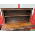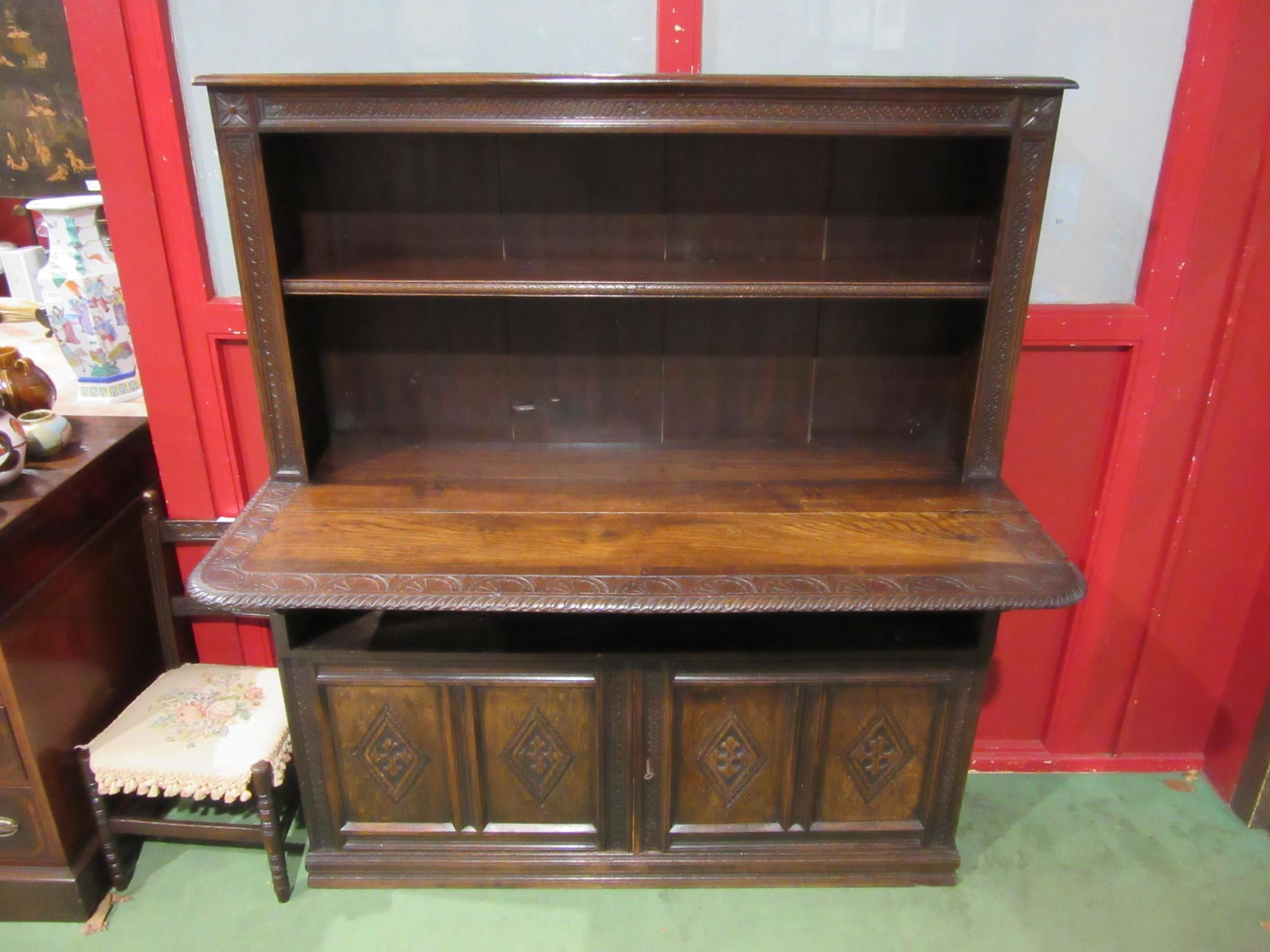 A Georgian "Bwyhyn" Welsh oak dresser of small proportions with carved decoration raised on open shelves over a rising table leaf and open shelf over a two door cupboard with key, 144cm tall x 126cm wide x 32cm deep (not including rising leaf)
