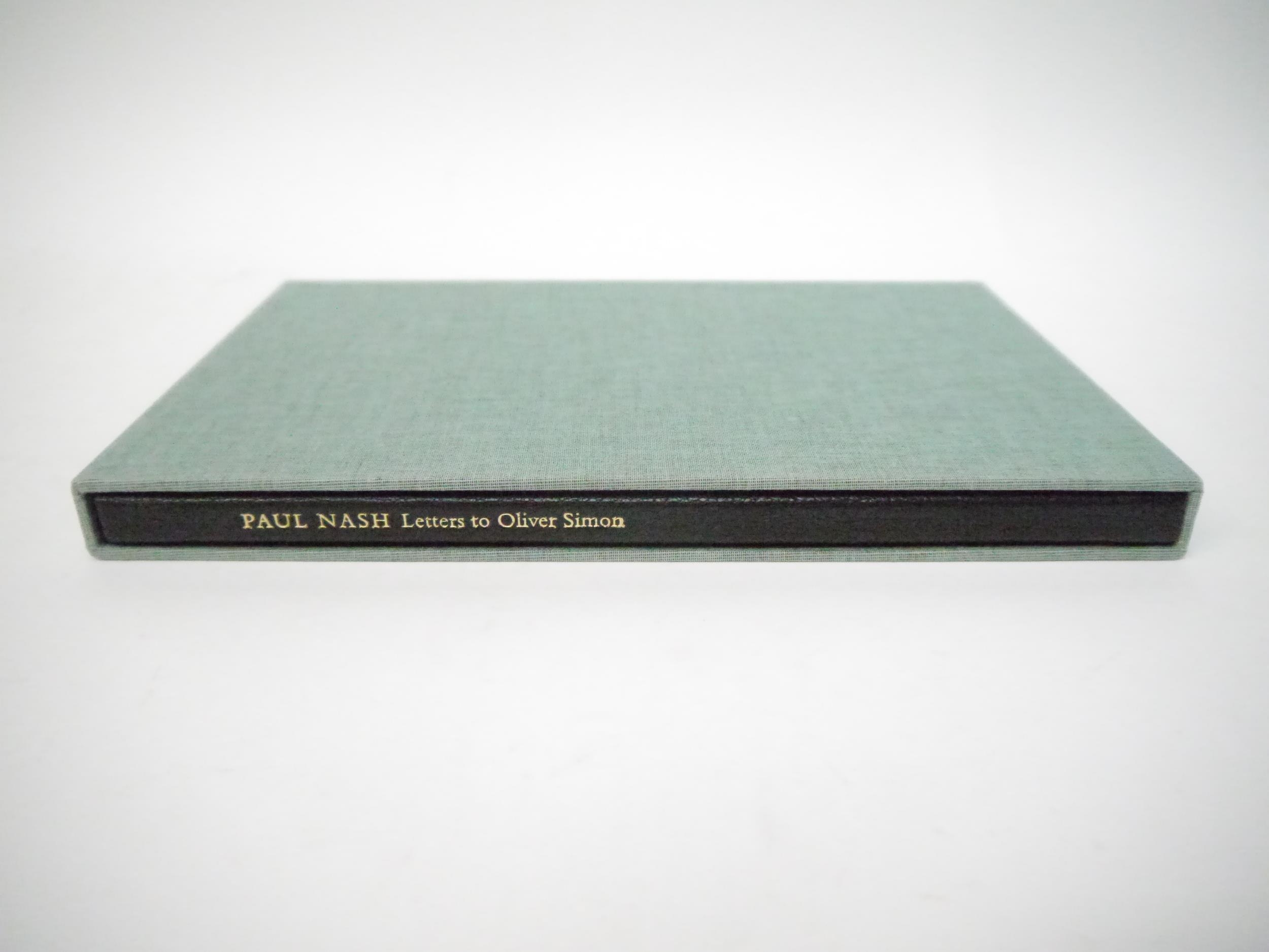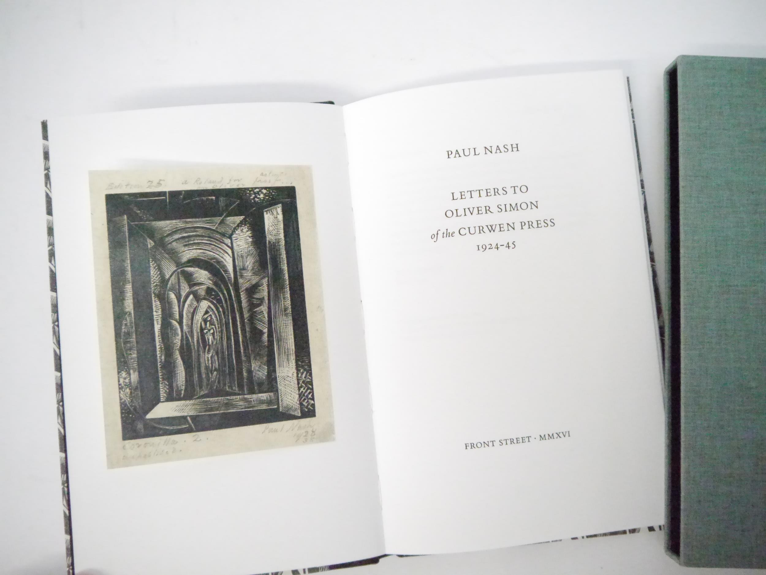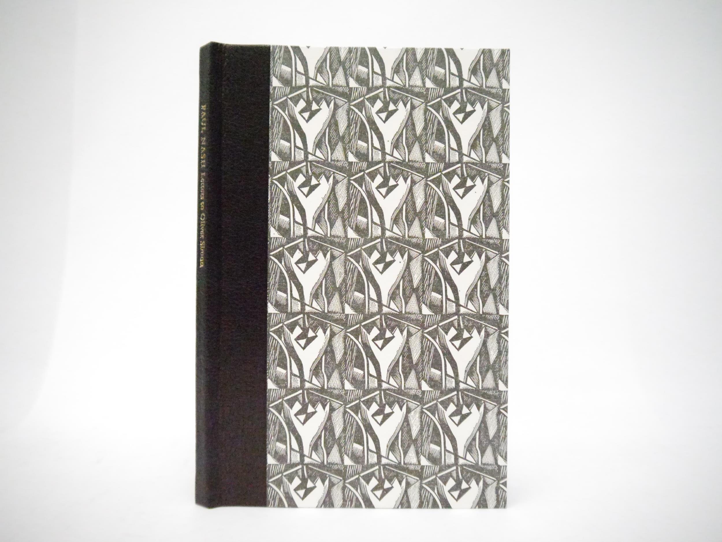 Paul Nash: 'Letters to Oliver Simon of the Curwen Press 1924-45', [Binham, Norfolk], Front Street Editions, 2016, limited edition, printed by Hand and Eye on mould-made paper in an edition of 125 copies, this number XXIV of only 25 specials bound in quarter black goatskin, tipped in frontispiece of Paul Nash's 'Cornilla 2' and a fold out facsimile page of the artists working directions for Nash's illustrated Curwen Press edition of 'Urne Buriall', 23 x 15cm, original quarter black goatskin, spine lettered in gilt, Nash patterned paper covered boards, original slipcase