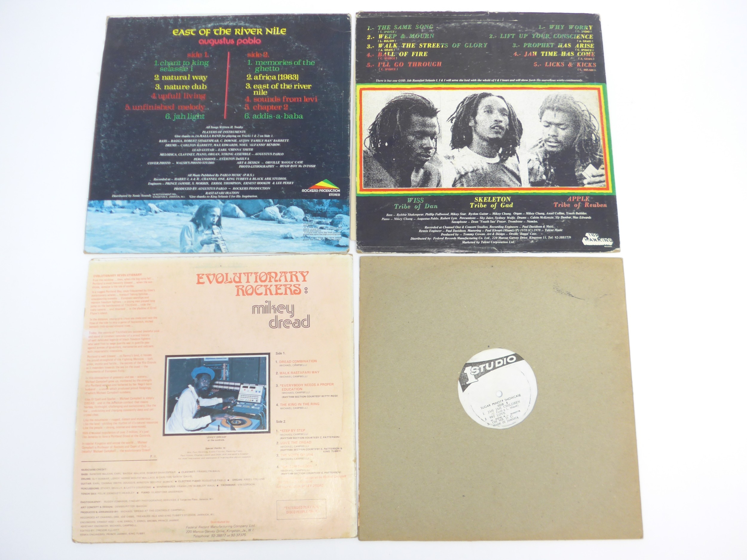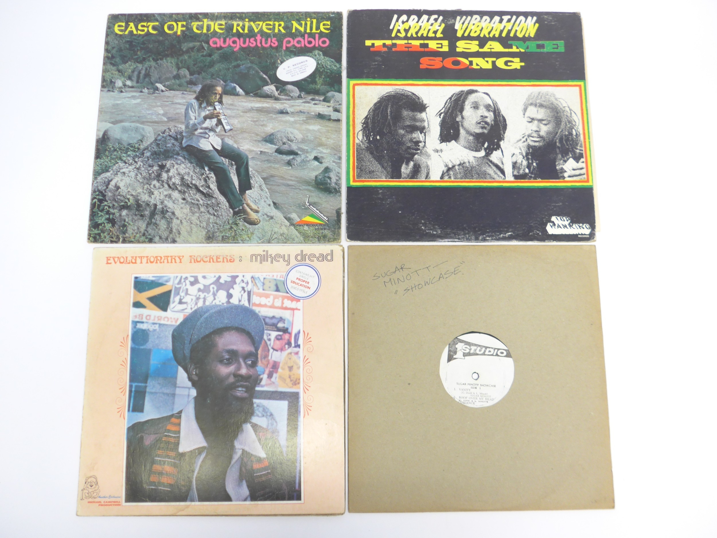 Reggae - Four original Jamaican pressing LPs to include AUGUSTUS PABLO: 'East Of The River Nile' on the Message label, misprint with side 1/side 2 incorrectly labelled (vinyl and sleeve VG), ISRAEL VIBRATION: 'The Same Song' (Top Ranking TC-084, vinyl a strong VG nearing VG+, sleeve VG-), SUGAR MINOTT: 'Showcase' (Studio One DSR 8916/8917, vinyl VG, no sleeve) and MIKEY DREAD: 'Evolutionary Rockers' (Dread At The Controls DSR 8219/8220, vinyl and sleeve VG) (4)