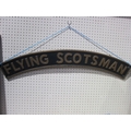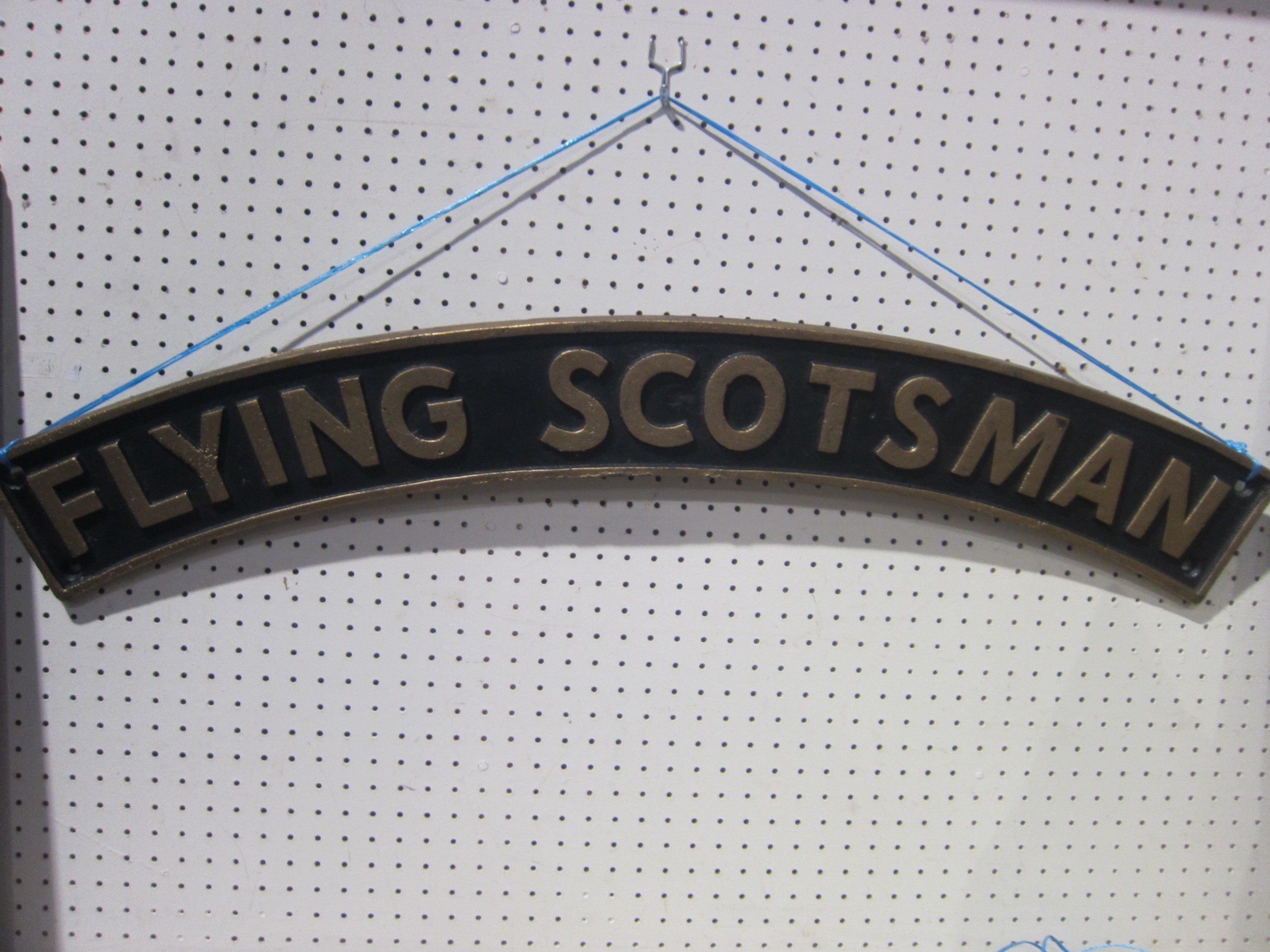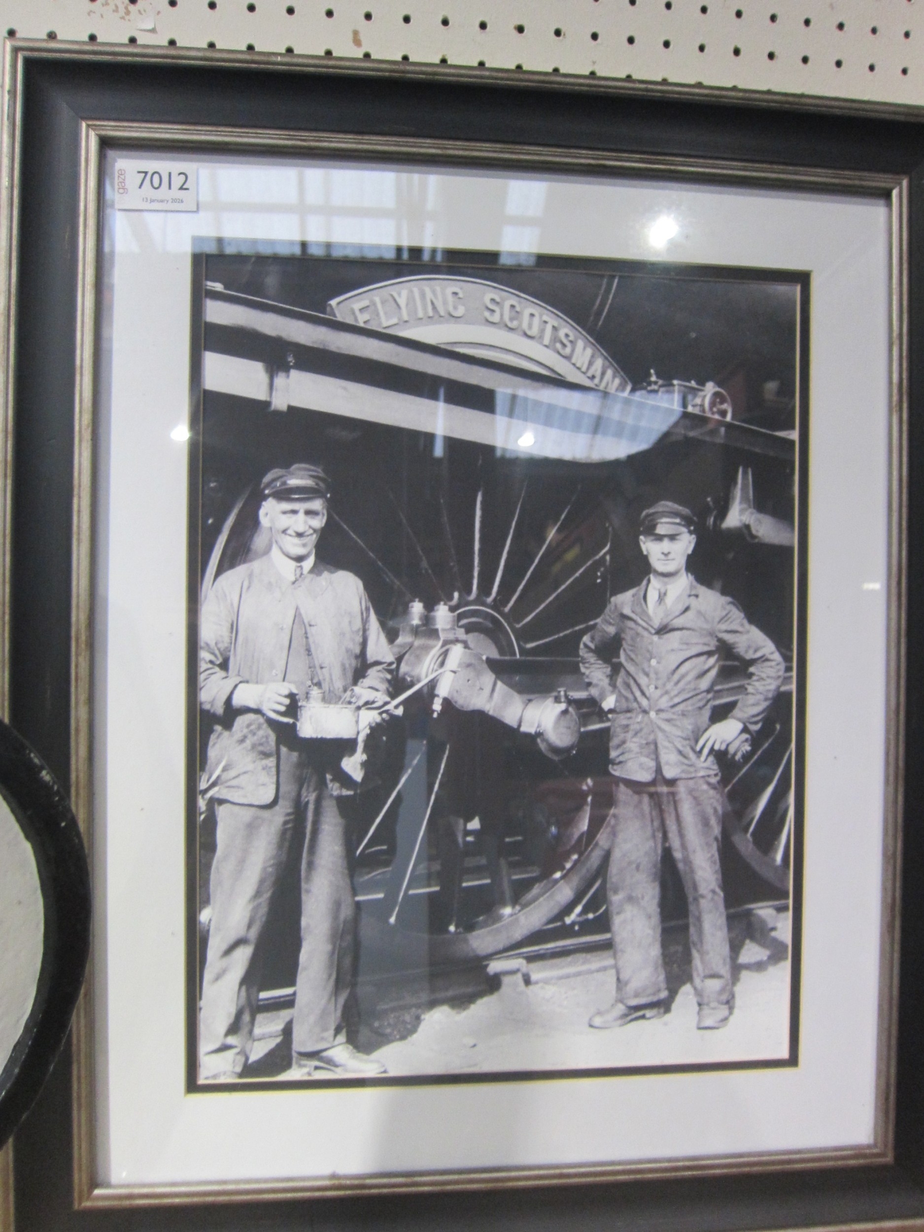 A reproduction cast 'Flying Scotsman' name plate and framed and glazed black and white photograph of driver Bill Sparshatt and fireman R. Webster (Bob Webster)