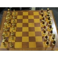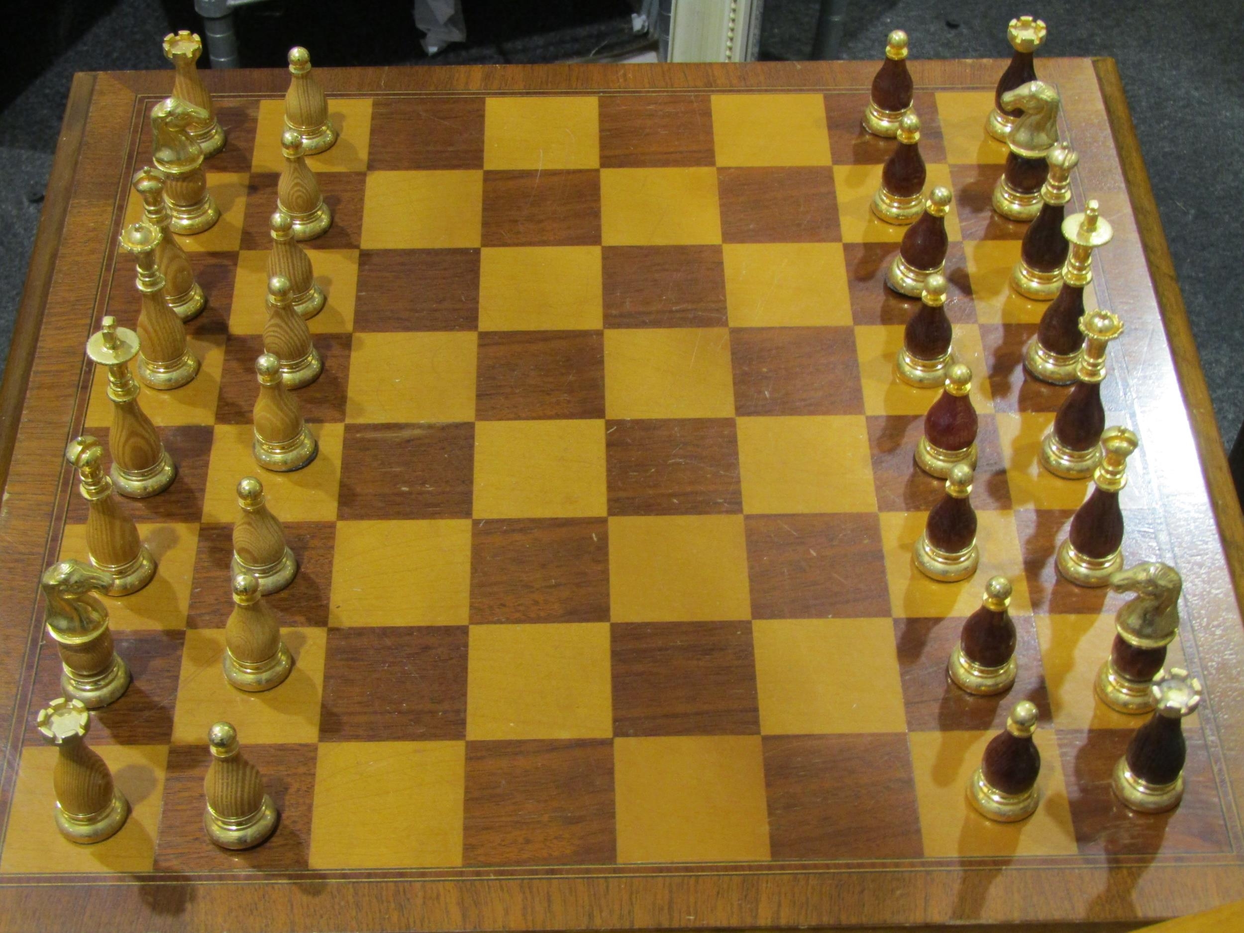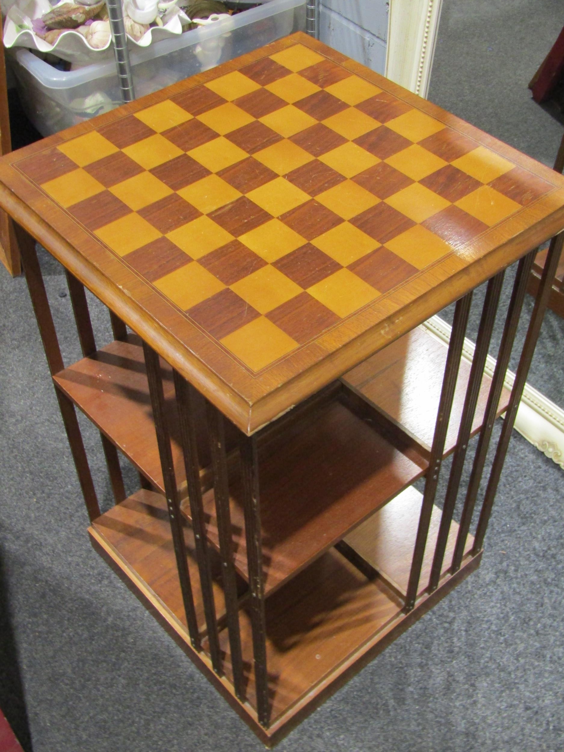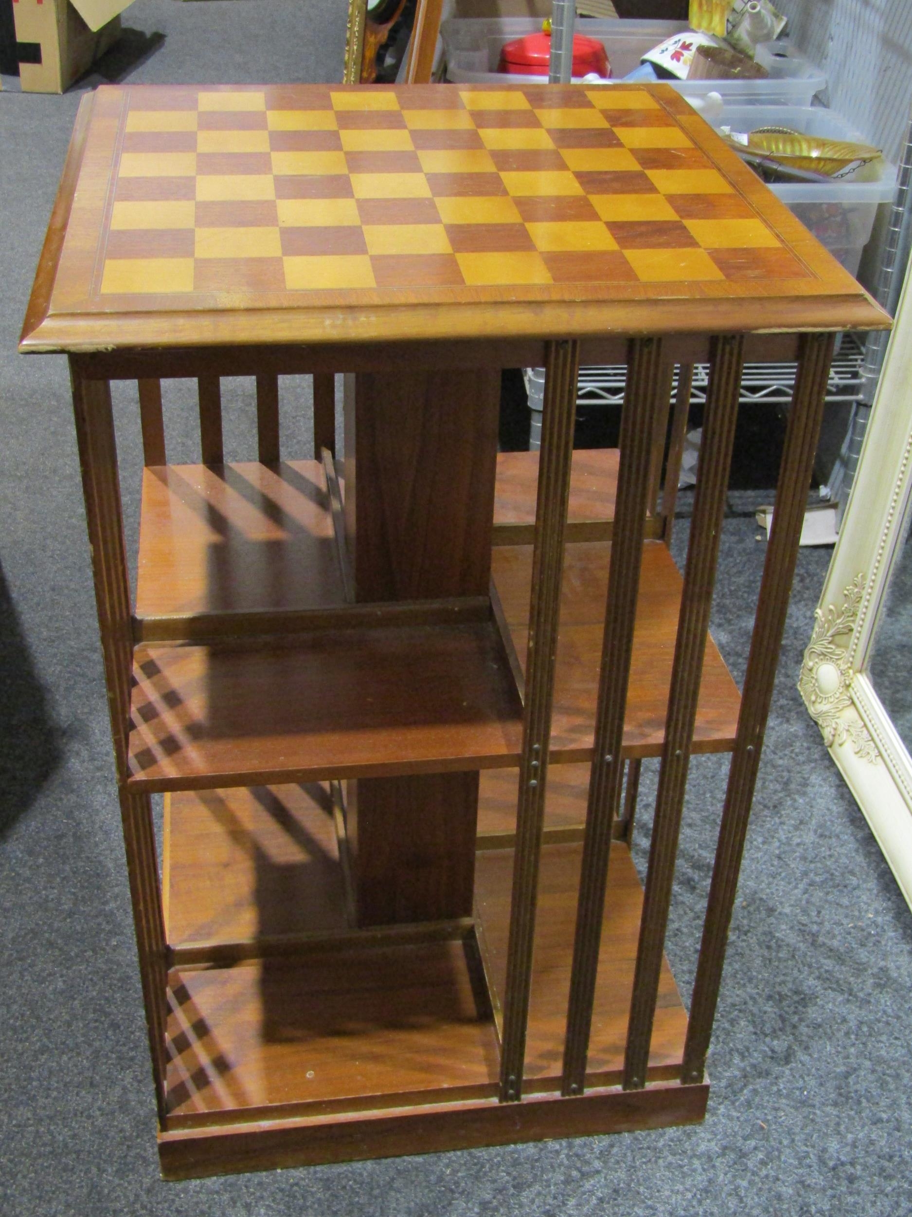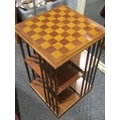 A reproduction revolving bookcase with chess board top and pieces