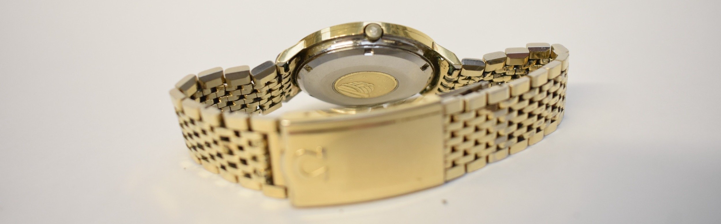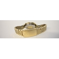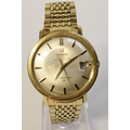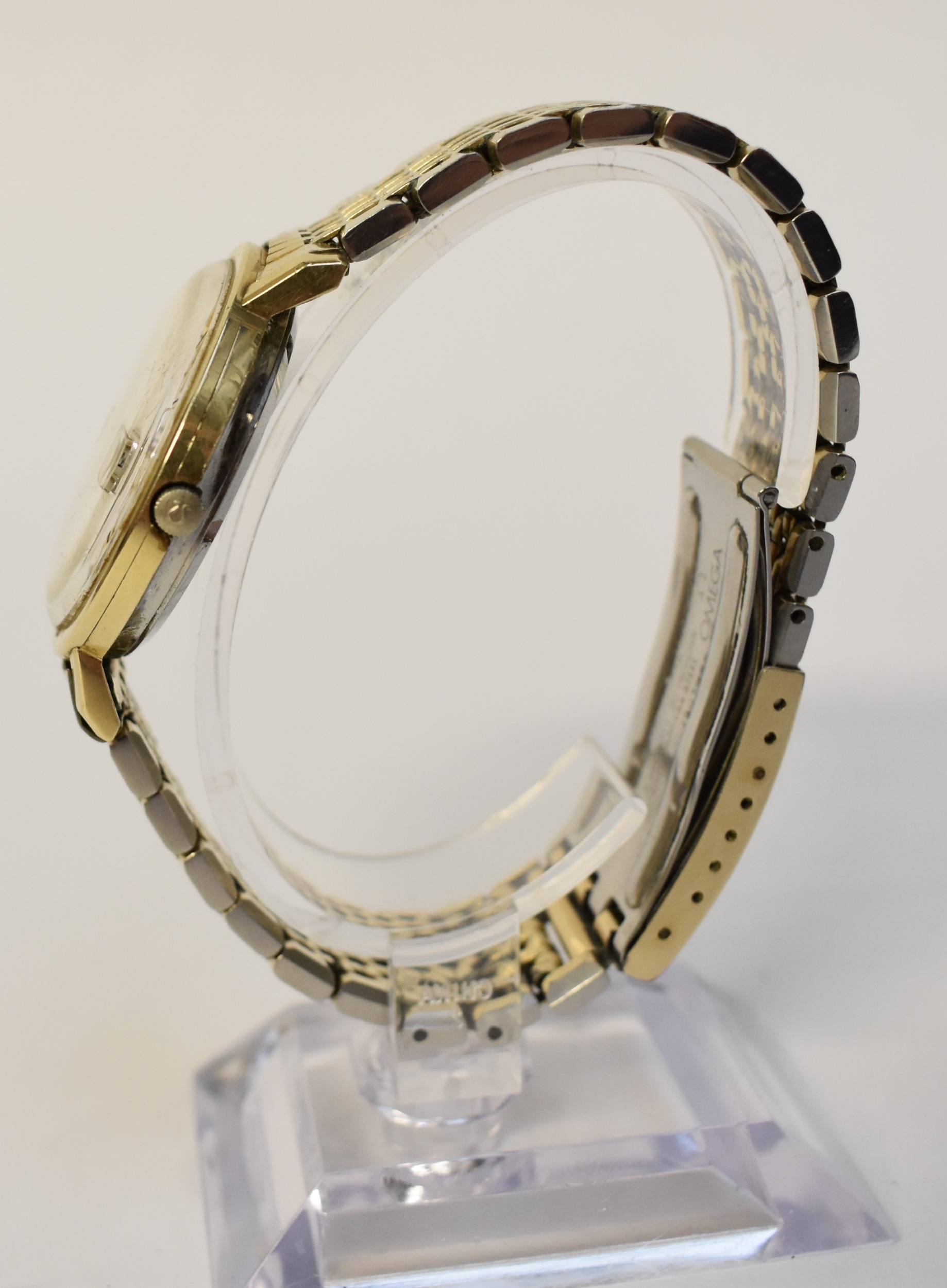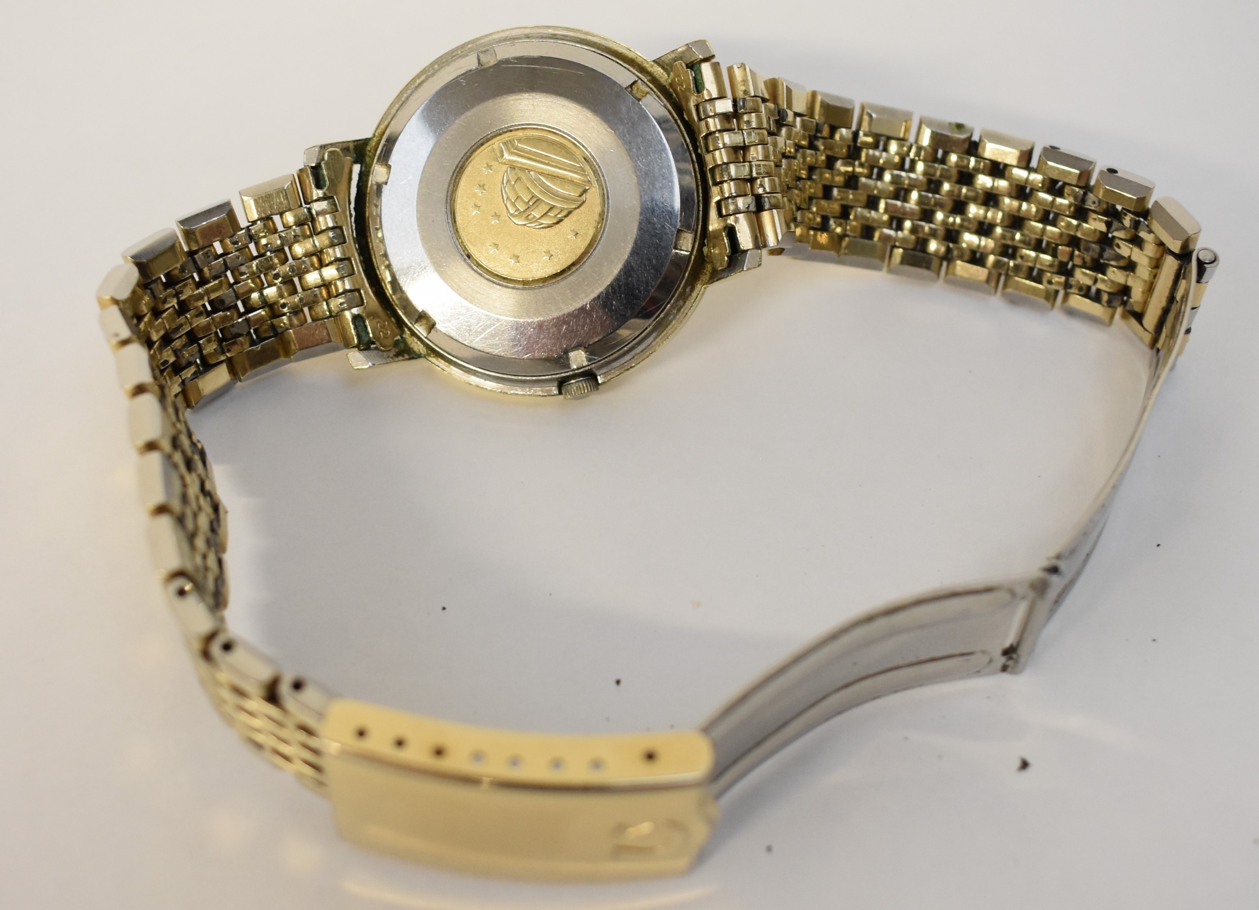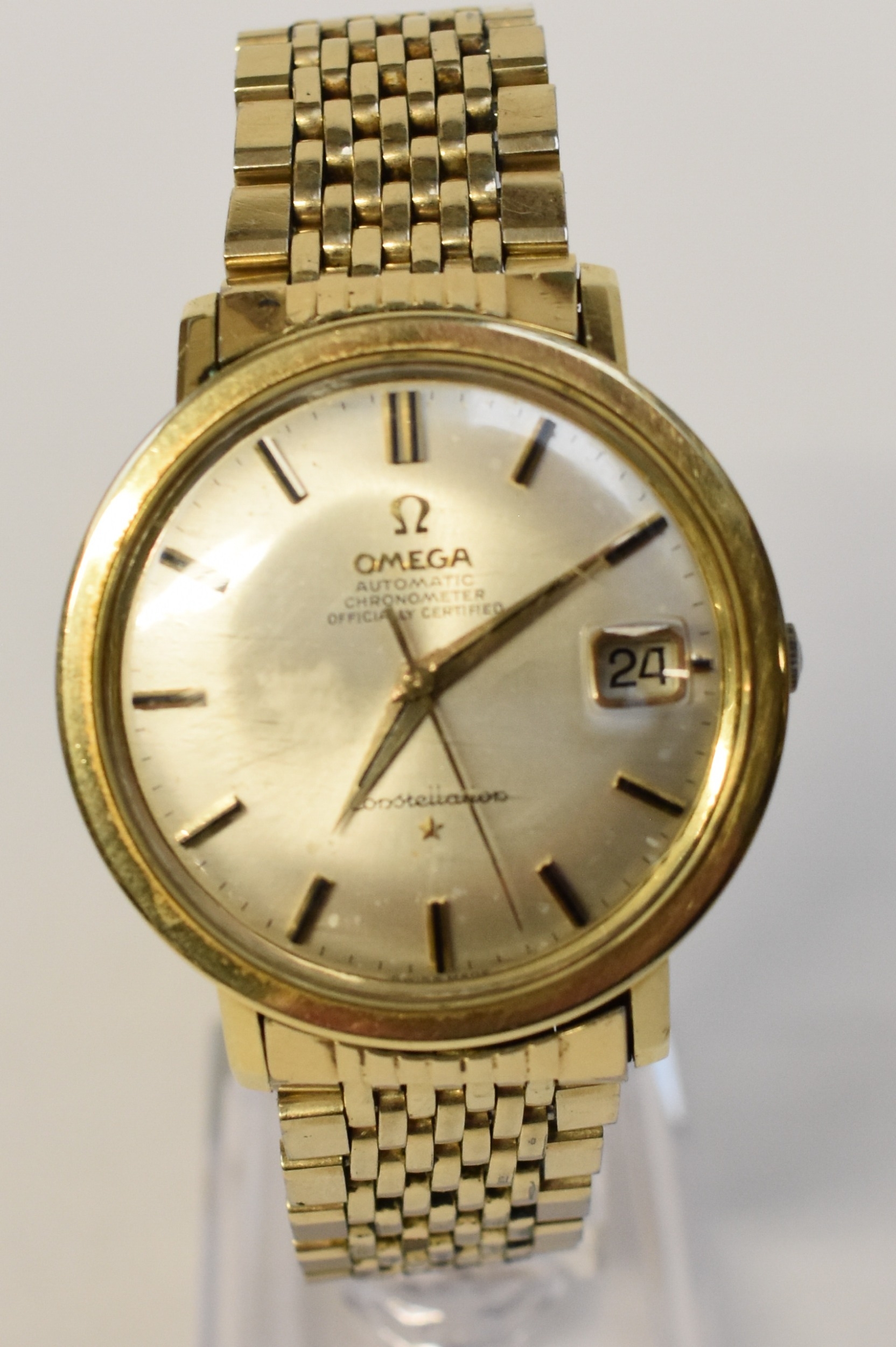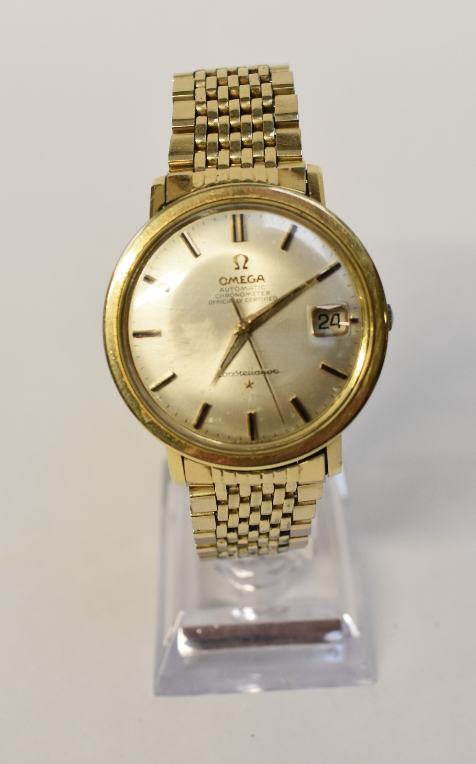 OMEGA: A gentleman's stainless steel gold plated case Omega Constellation automatic wristwatch, on plated bracelet strap, silvered dial having baton markers, centre seconds and magnified date aperture, scratching throughout with some loss of plating
