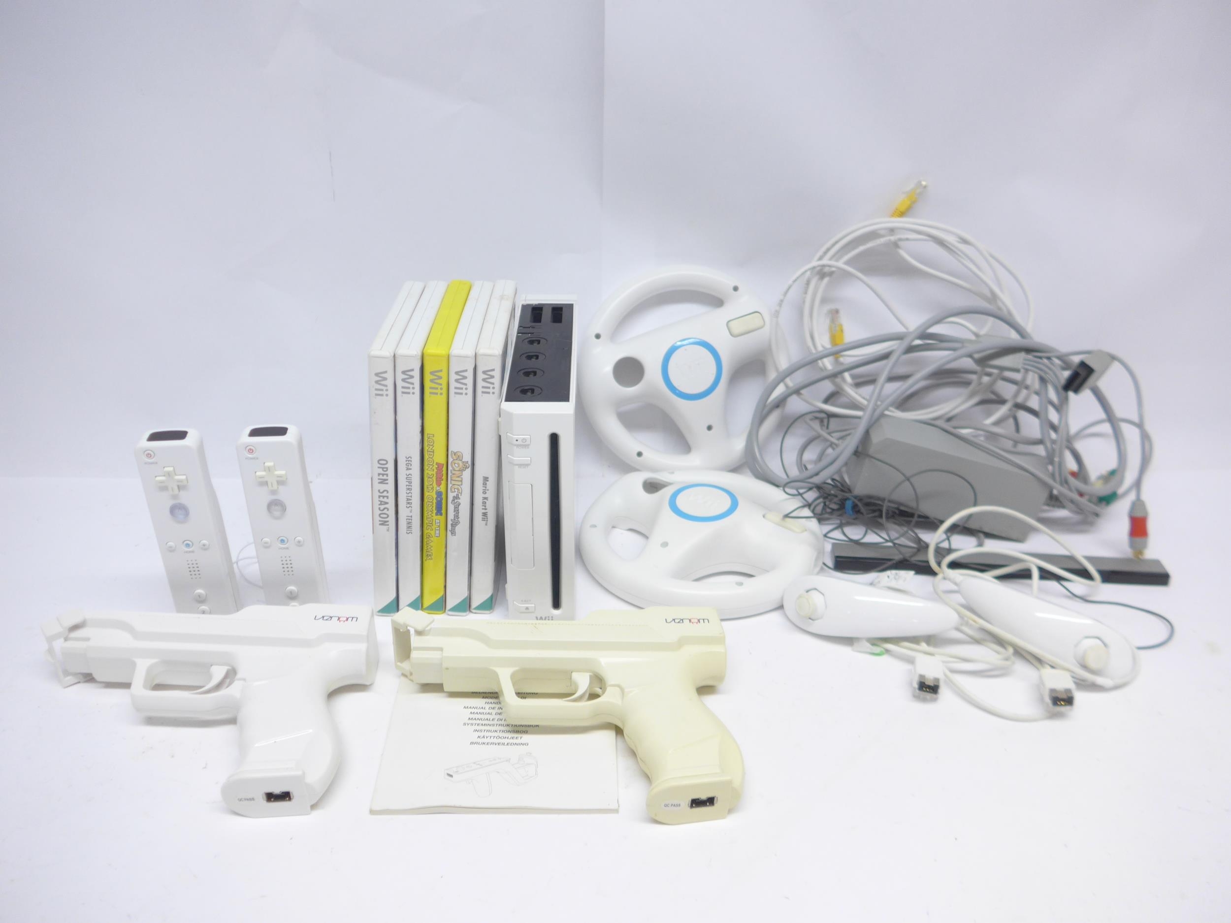 Retro Gaming - An unboxed Nintendo Wii computer games console with two controllers, two nunchucks, two steering wheels, two Venom Wiiguns, and five games to include Mario Kart Wii, Sonic And The Secret Rings, Mario & Sonic At The London 2012 Olympic Games, Sega Superstars Tennis, and Open Season
