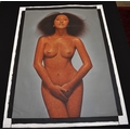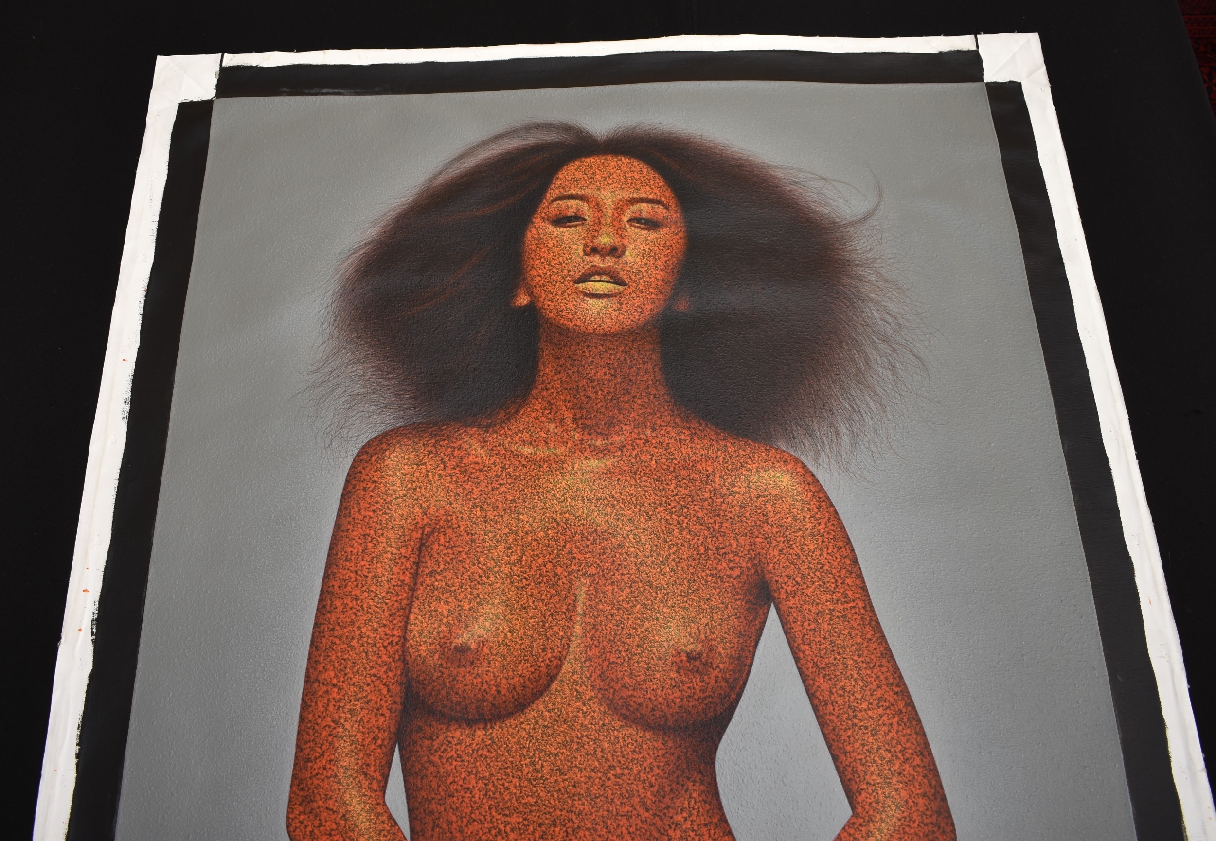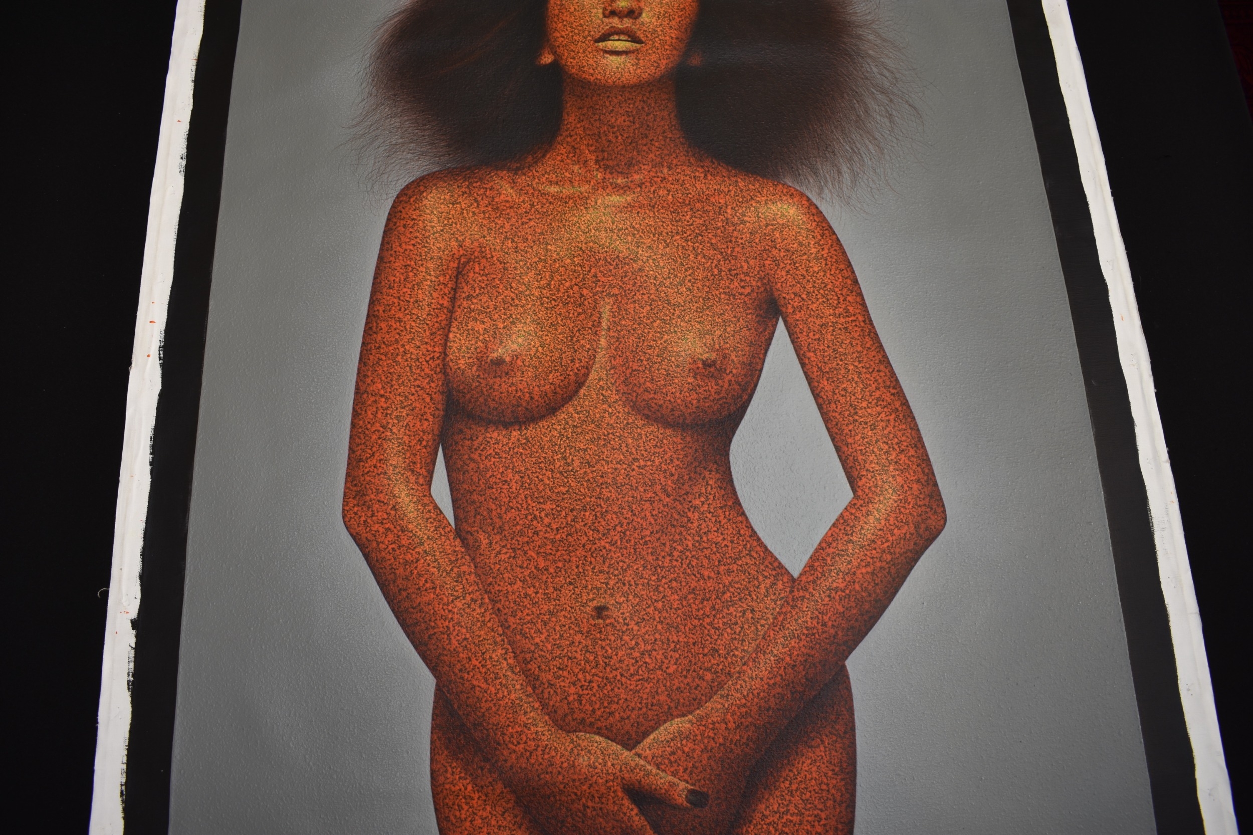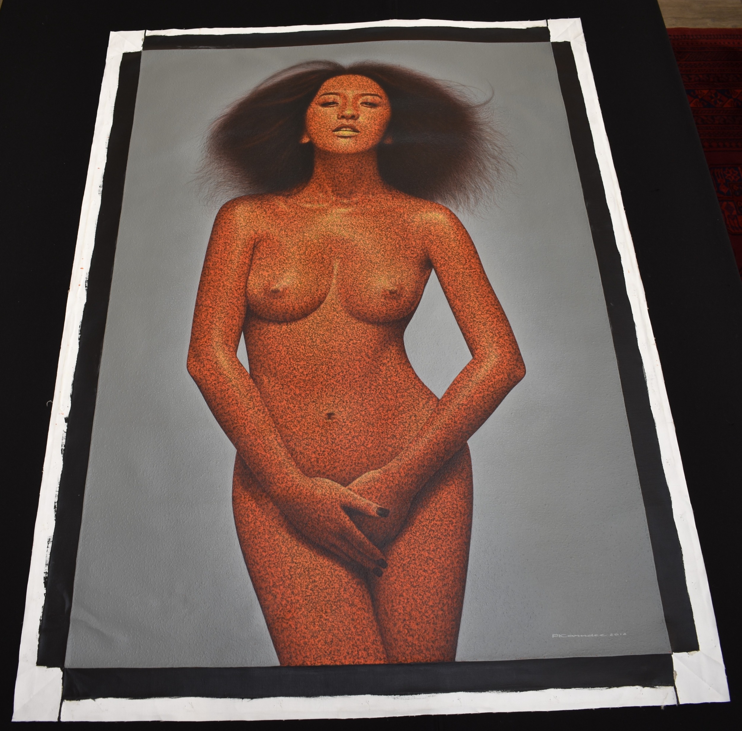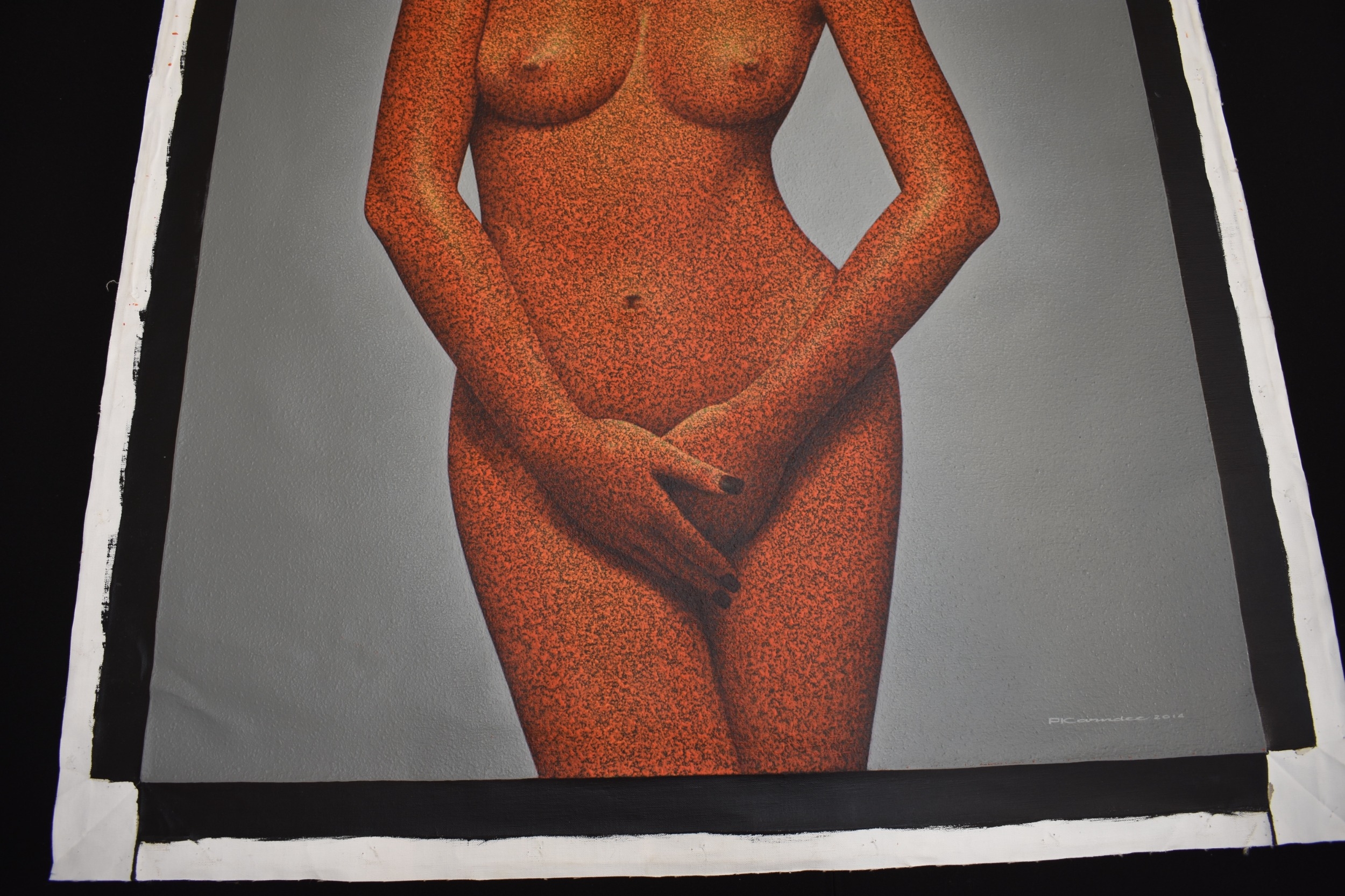 PAIROJ KARNDEE Thai Contemporary Artist: Female portrait, untitled 3/4 length nude study with hands clasped in front, orange tonal skin, acrylic on canvas. The artist has been influenced by the mysterious Apsaras - the celestial maidens of ancient Asian culture depicted in the galleries of Cambodia's Angkor Wat. His techniques painstakingly recreate the stone textures of those images with a time-consuming rendering of acrylic on linen canvas. His figures show a notable range of emotions. Signed and dated, 2014, image size 129.5cm x 90cm