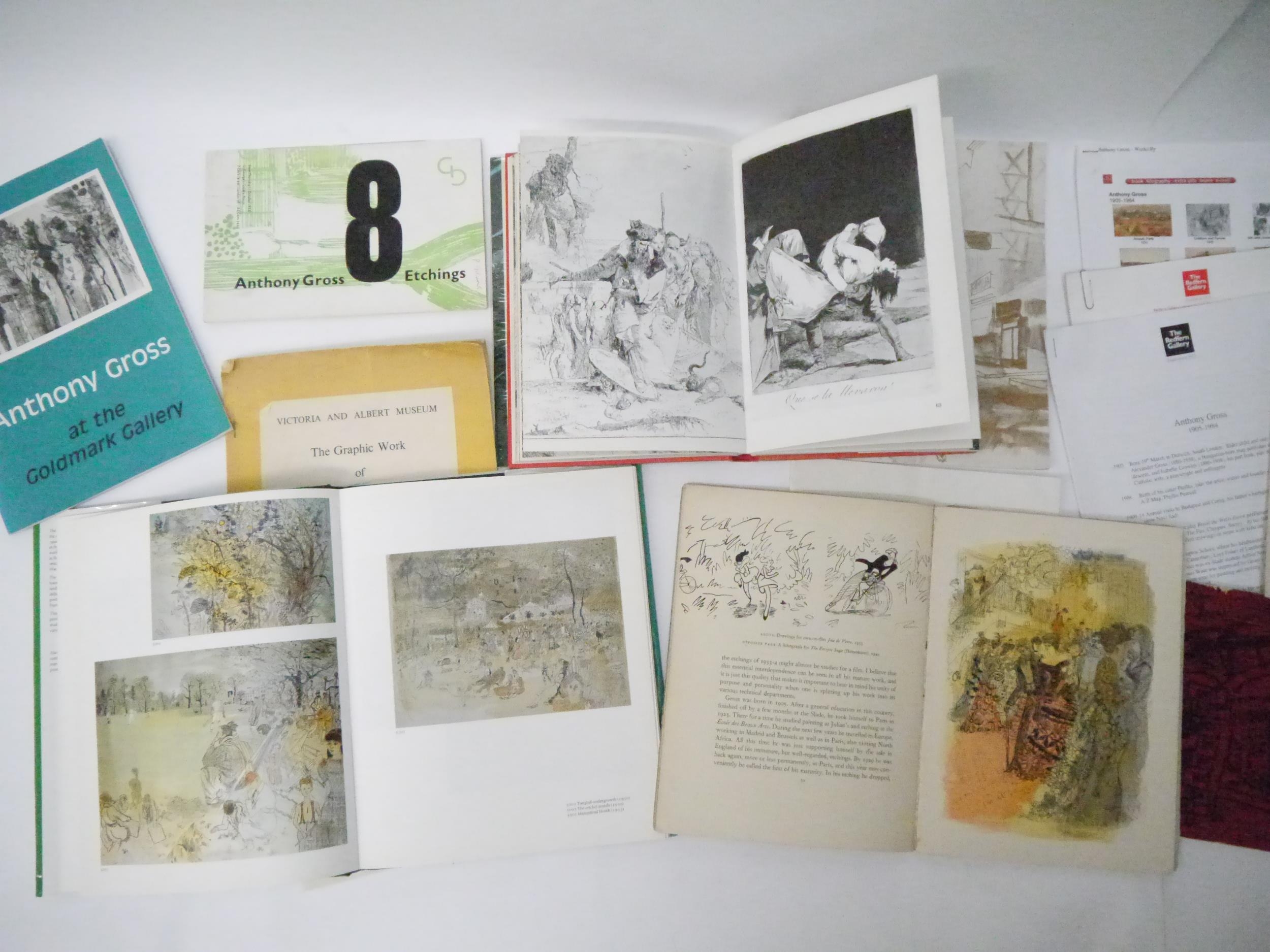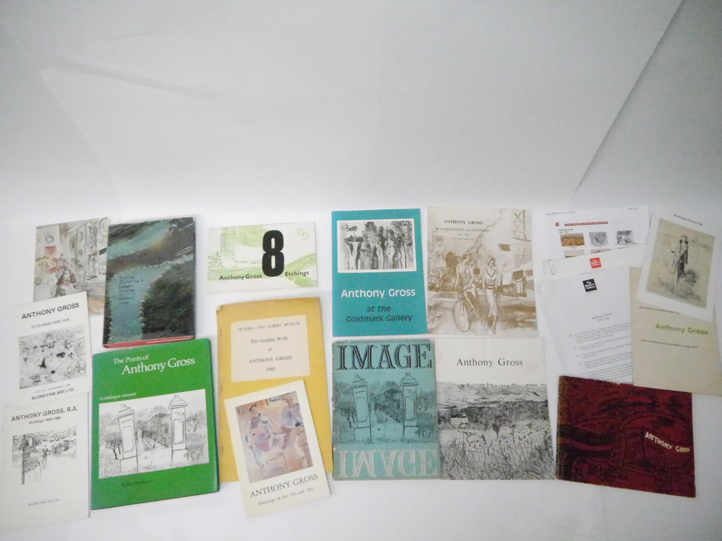 ‘The Prints of ANTHONY GROSS A Catalogue Raisonné’, by Robin Herdman. Published in 1991 by Scolar Press, London. Hardback - green cloth covered boards with gold lettering. Dustwrapper. 126 pages. Listing prints dated from 1920 up to 1983 with index of titles at rear. Profusely illustrated with titles, descriptions, dates, sizes and edition size etc., some in colour. In near fine condition. 27 x 22 cm; together with a 1970 First Edition of ‘Etching, Engraving & Intaglio Printing’, by ANTHONY GROSS - Hardback with dustwrapper; plus A COLLECTION OF ANTHONY GROSS CATALOGUES (some quite scarce) and other related items, including 'Image: A Quarterly of the Visual Arts', Spring 1950, No. 4, includes J. Mayne 'The Graphic Works of Anthony Gross', pp.31-48, full page colour and b/w plates, ills. in text etc, plus other content John Buckland-Wright wood engravings etc, 4to, original pictorial wraps, Anthony Gross catalogues ranging from 1956 to 1990's. (approx. 20 items in total)