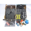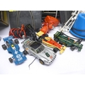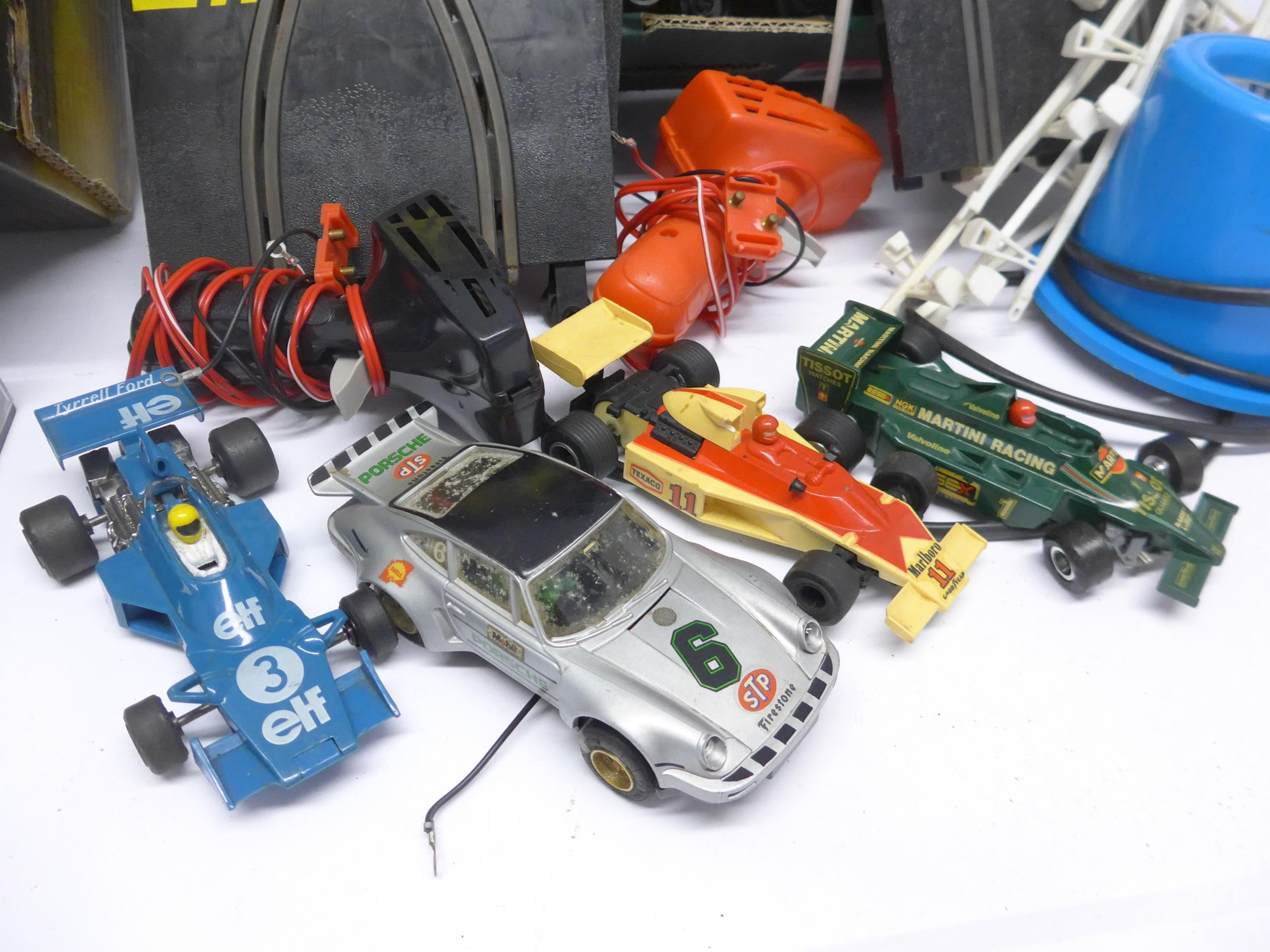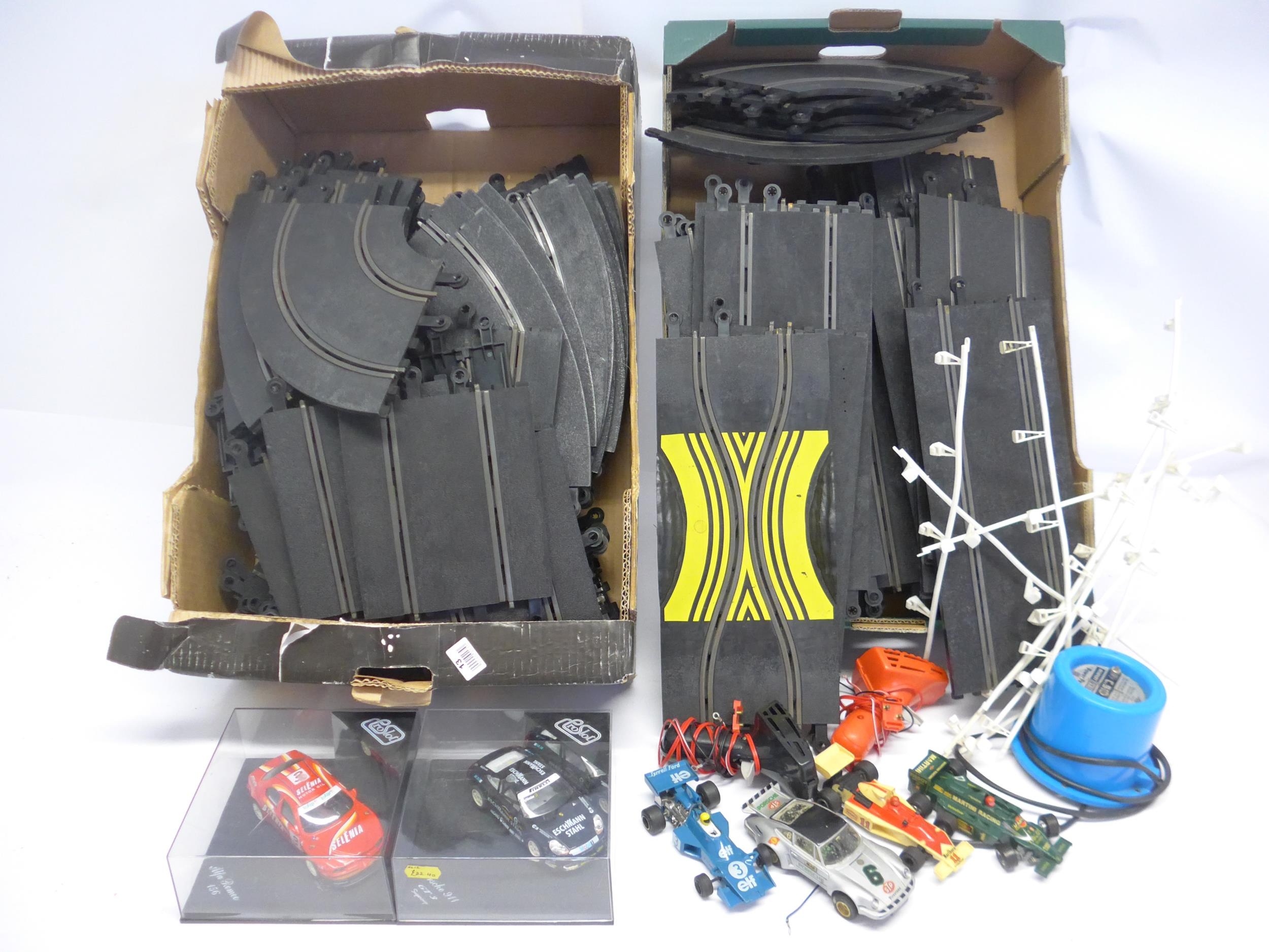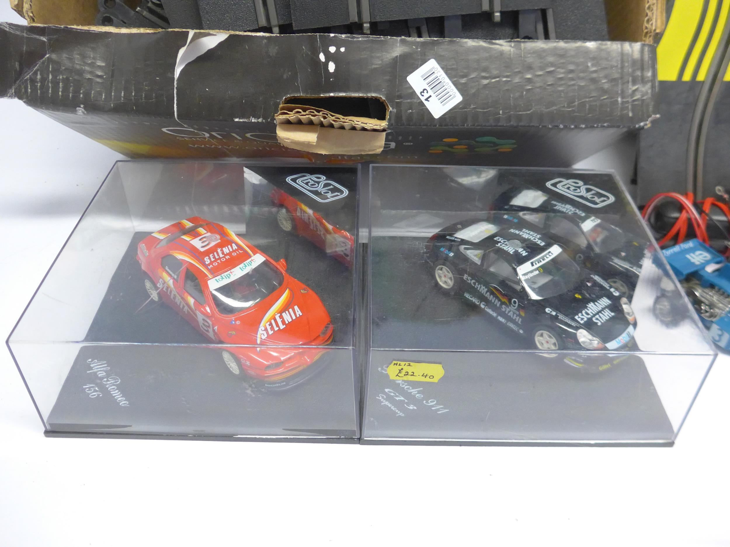 Two Proslot slot racing cars in perspex cases to include Porsche 911 GT3 Supercup (loose in case) and Alfa Romeo 156. Together with four unboxed Scalextric cars, track, power pack, etc.