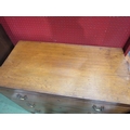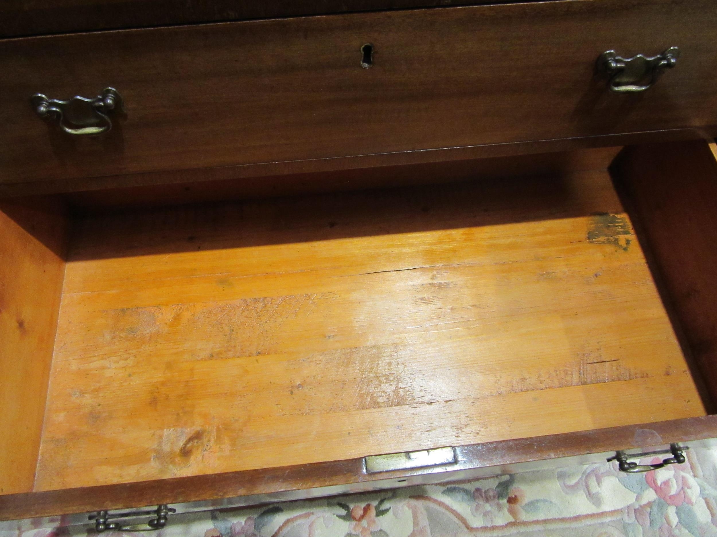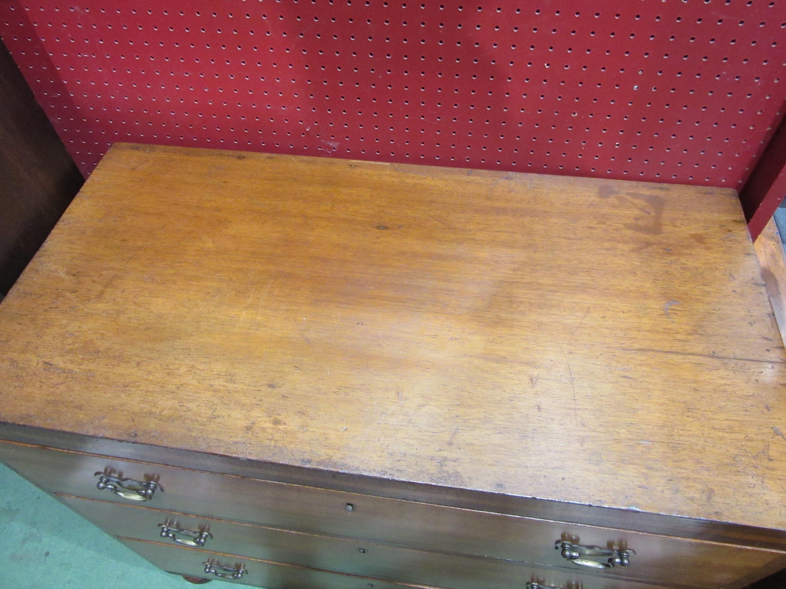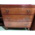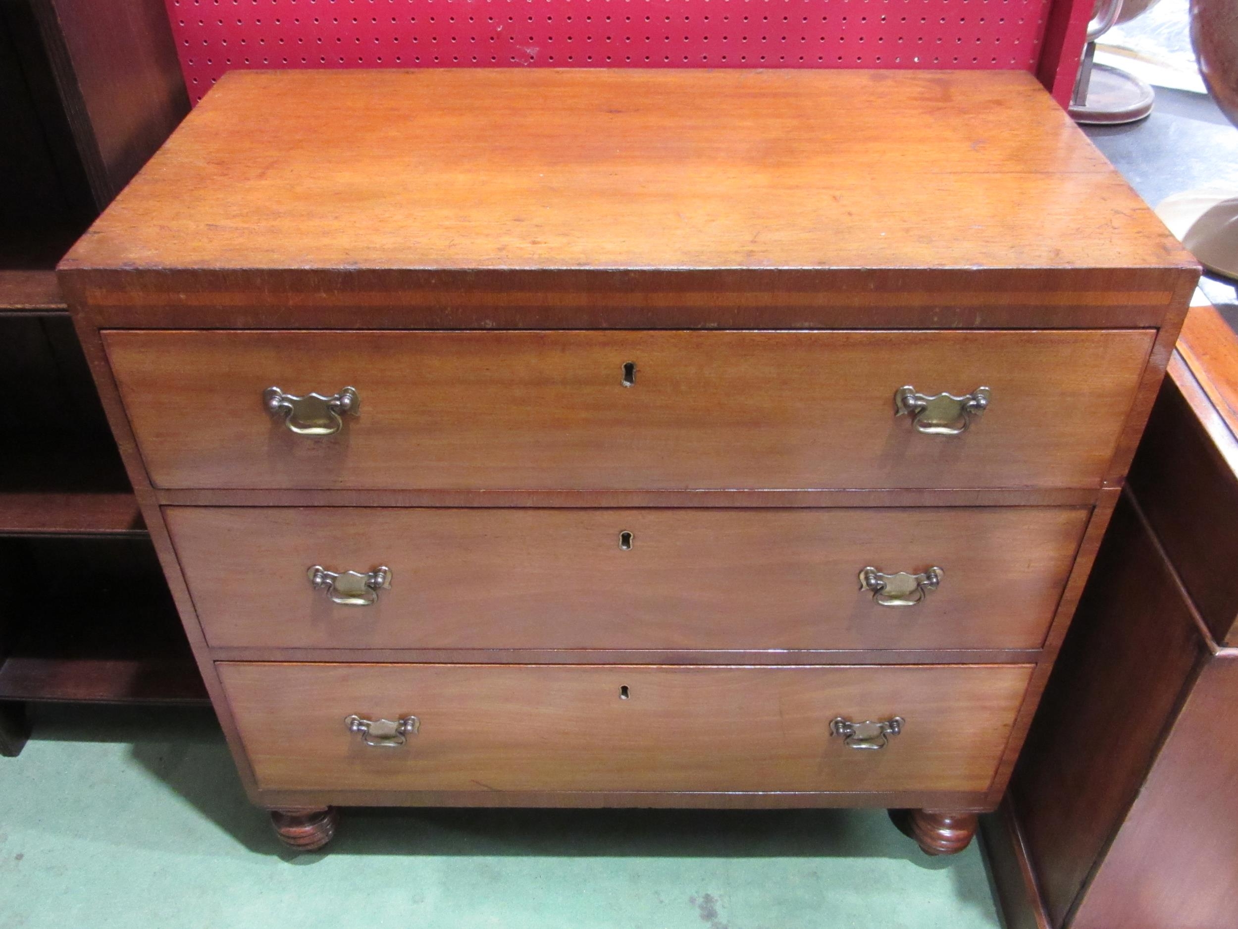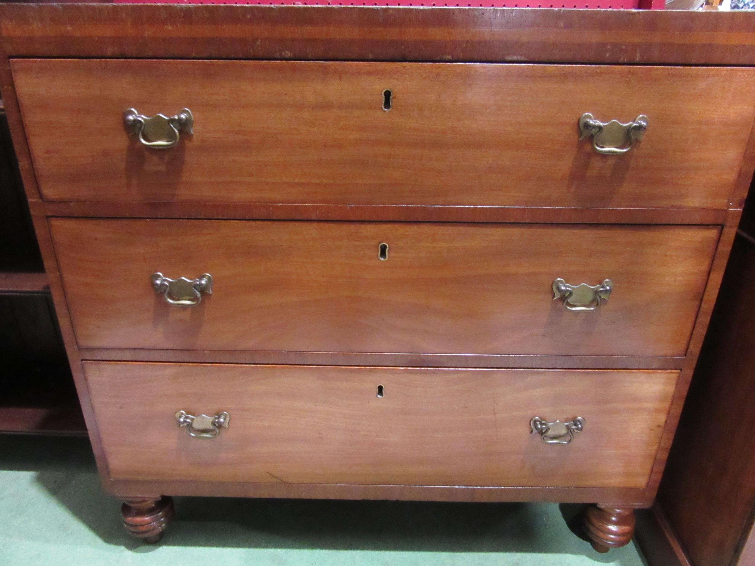 A 19th Century caddy top flame mahogany chest of three graduating long drawers on turned fore feet, 79cm tall x 81cm wide x 40cm deep