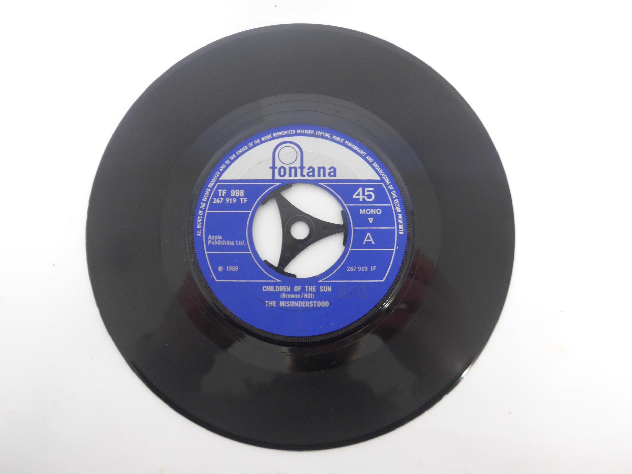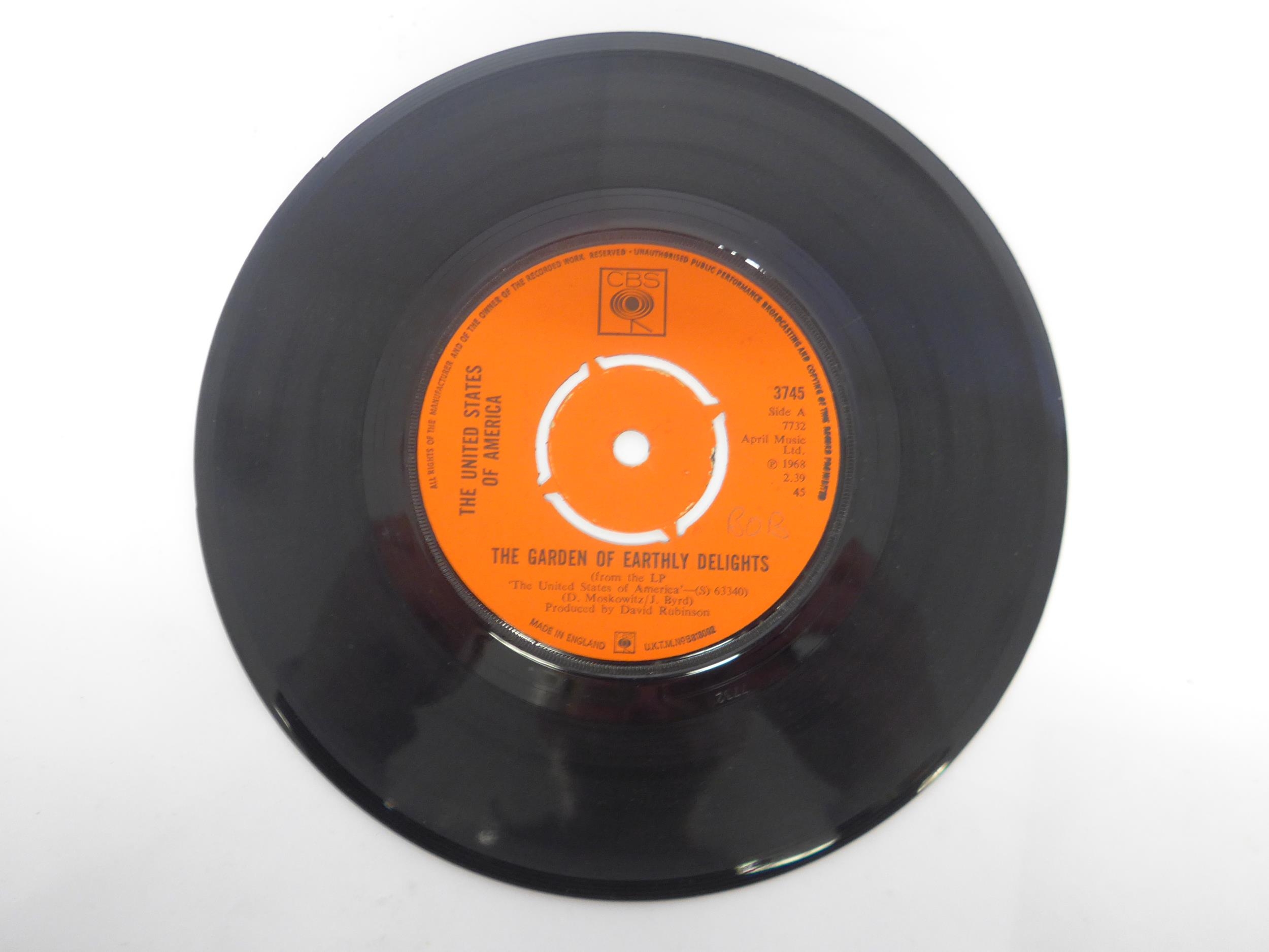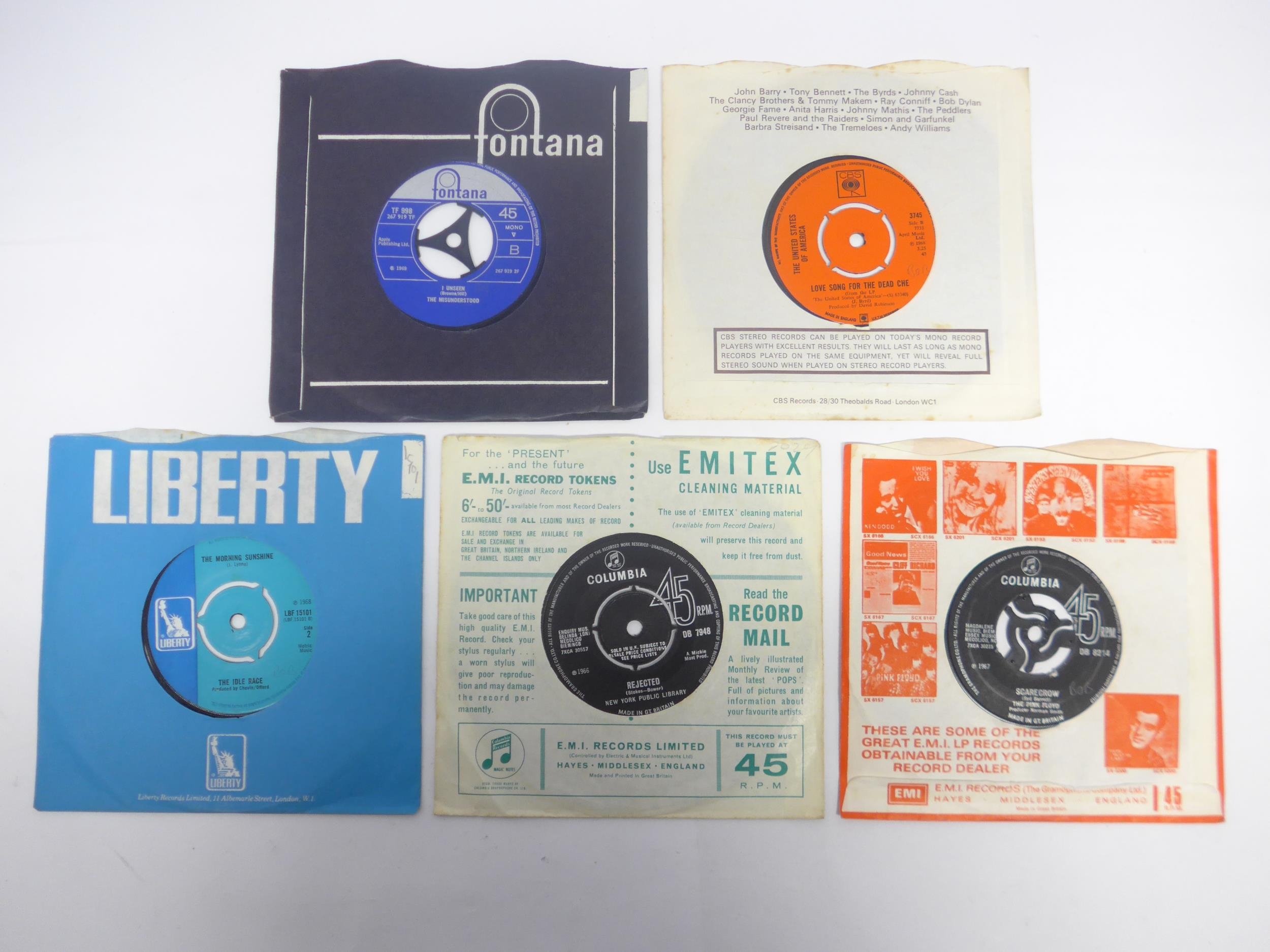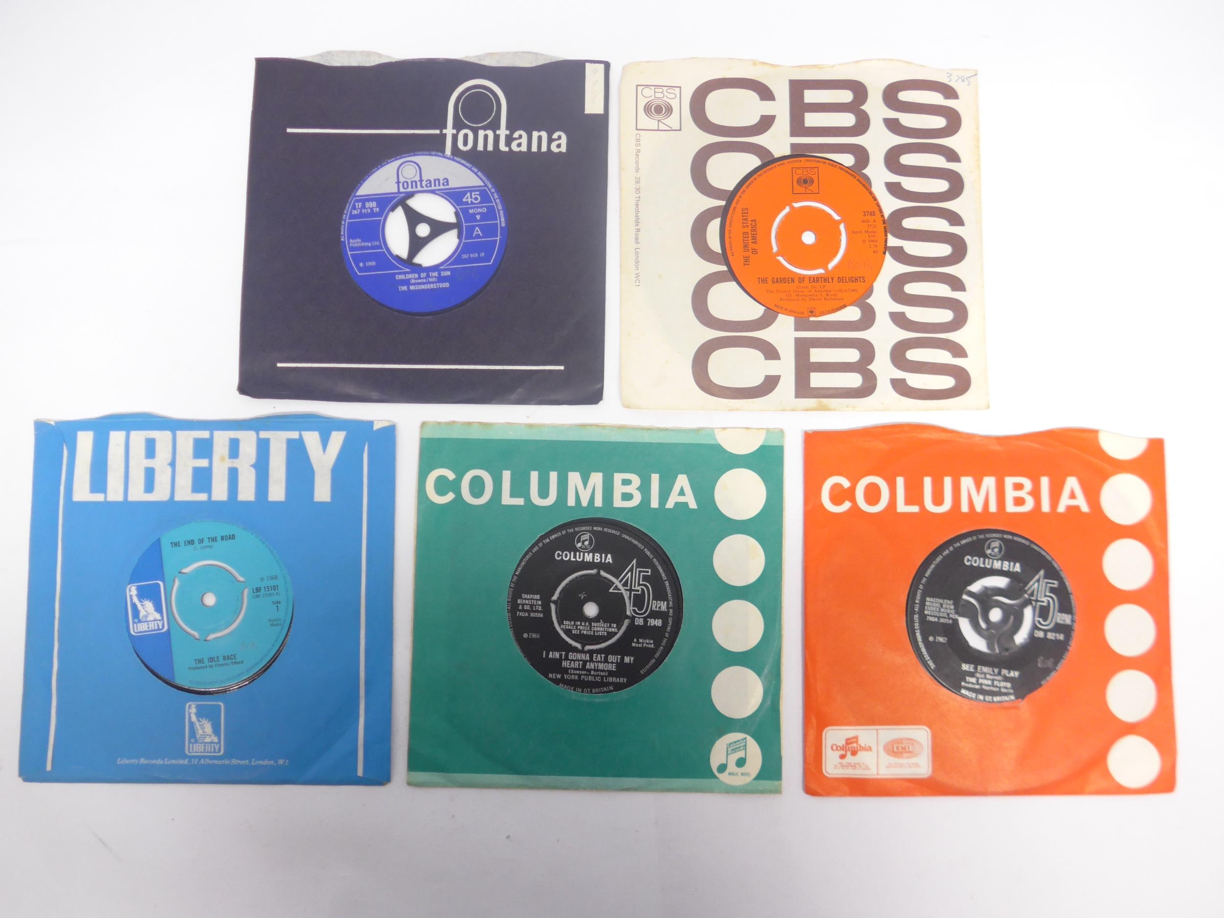 Psych - Five original 1960s UK pressing 7" singles, housed in company sleeves, to include THE MISUNDERSTOOD: -Children Of The Sun / I Unseen' (Fontana TF 998), THE IDLE RACE: 'The End Of The Road / The Morning Sunshine' (Liberty LBF 15101), THE PINK FLOYD: 'See Emily Play / Scarecrow' (Columbia DB 8214), NEW YORK PUBLIC LIBRARY: 'I Ain't Gonna Eat Out My Heart Anymore / Rejected' (Columbia DB 7948) and THE UNITED STATES OF AMERICA: 'The Garden Of Earthly Delights / Love Song For The Dead Che' (CBS 3745) (5, vinyl generally VG+ or slightly under, name written in pencil to some labels)