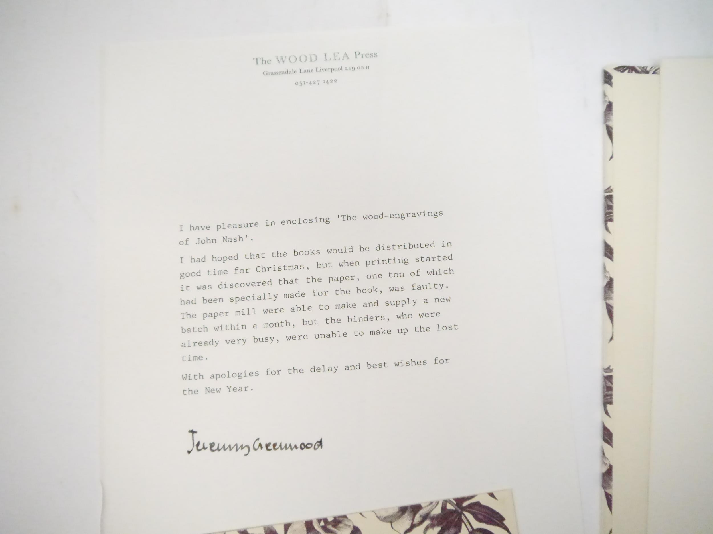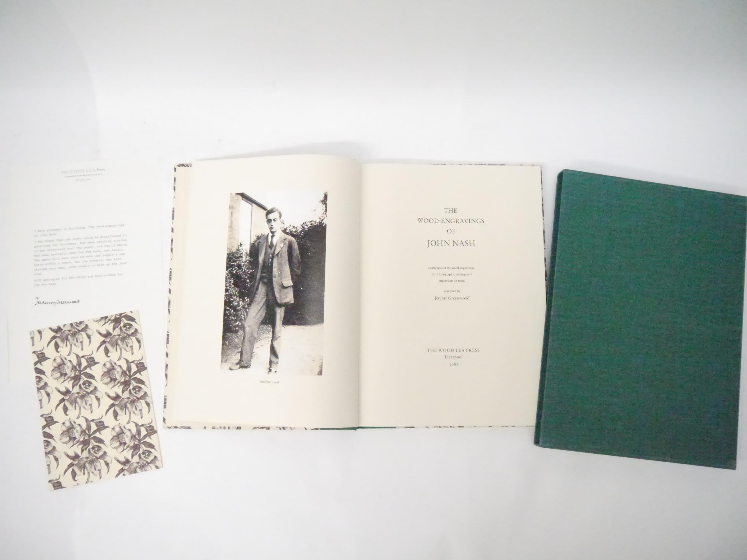 John Nash. Jeremy Greenwood: 'The Wood-Engravings of John Nash. A Catalogue of the wood-engravings, early lithographs, etchings and engravings on metal', Liverpool, The Wood Lea Press, 1987, limited edition, one of 750 copies, mounted portrait frontis plus numerous illustrations throughout, including some mounted, 148,[3]pp, folio (35 x 25cm), original quarter green cloth, gilt lettered to spine, patterned pictorial paper covered boards, matching original green cloth slipcase. With the original prospectus and a publication note loosely inserted. Essential and definitive.