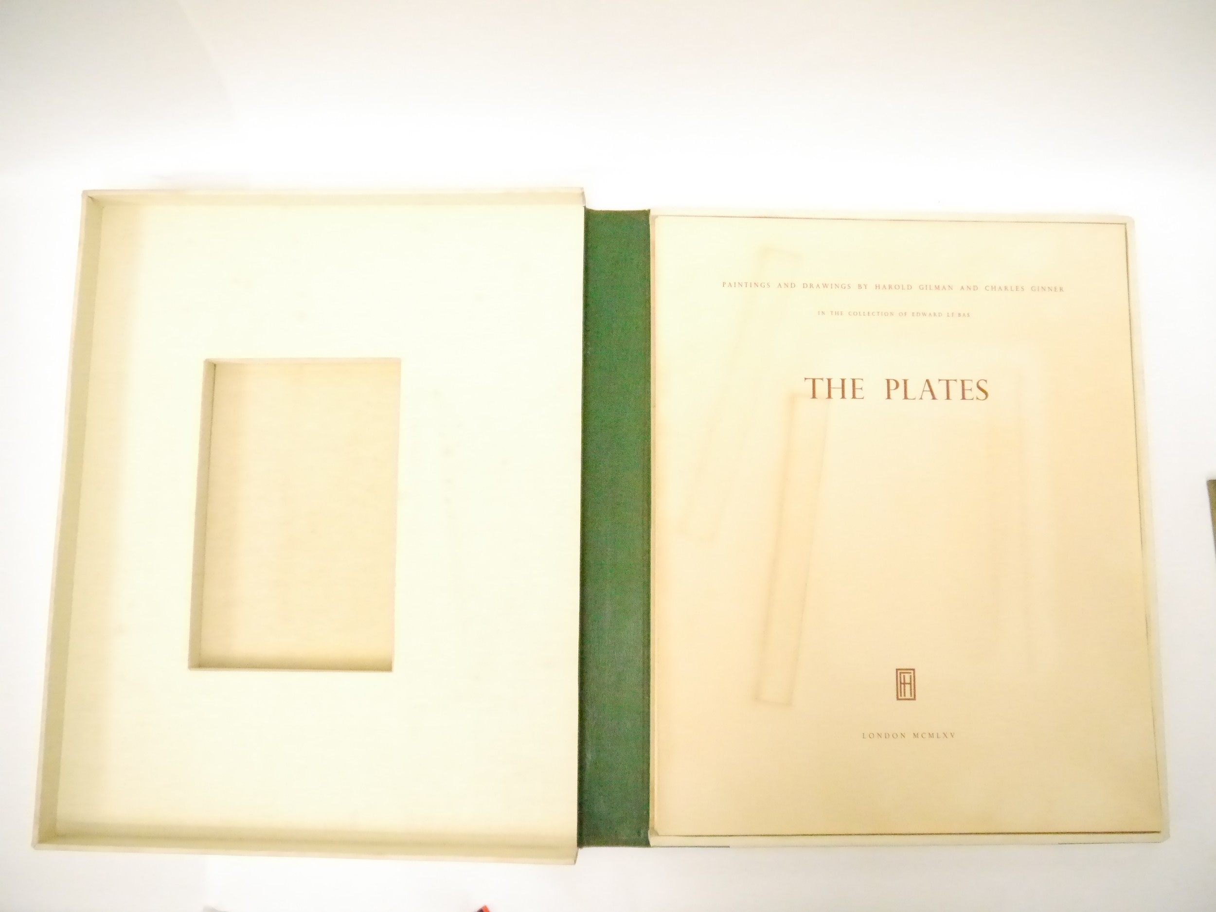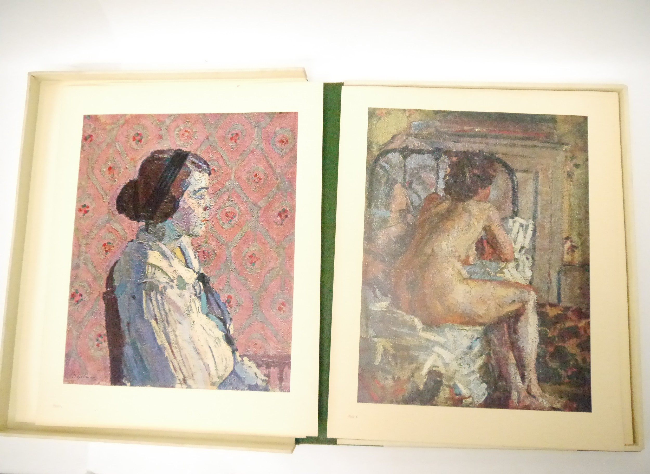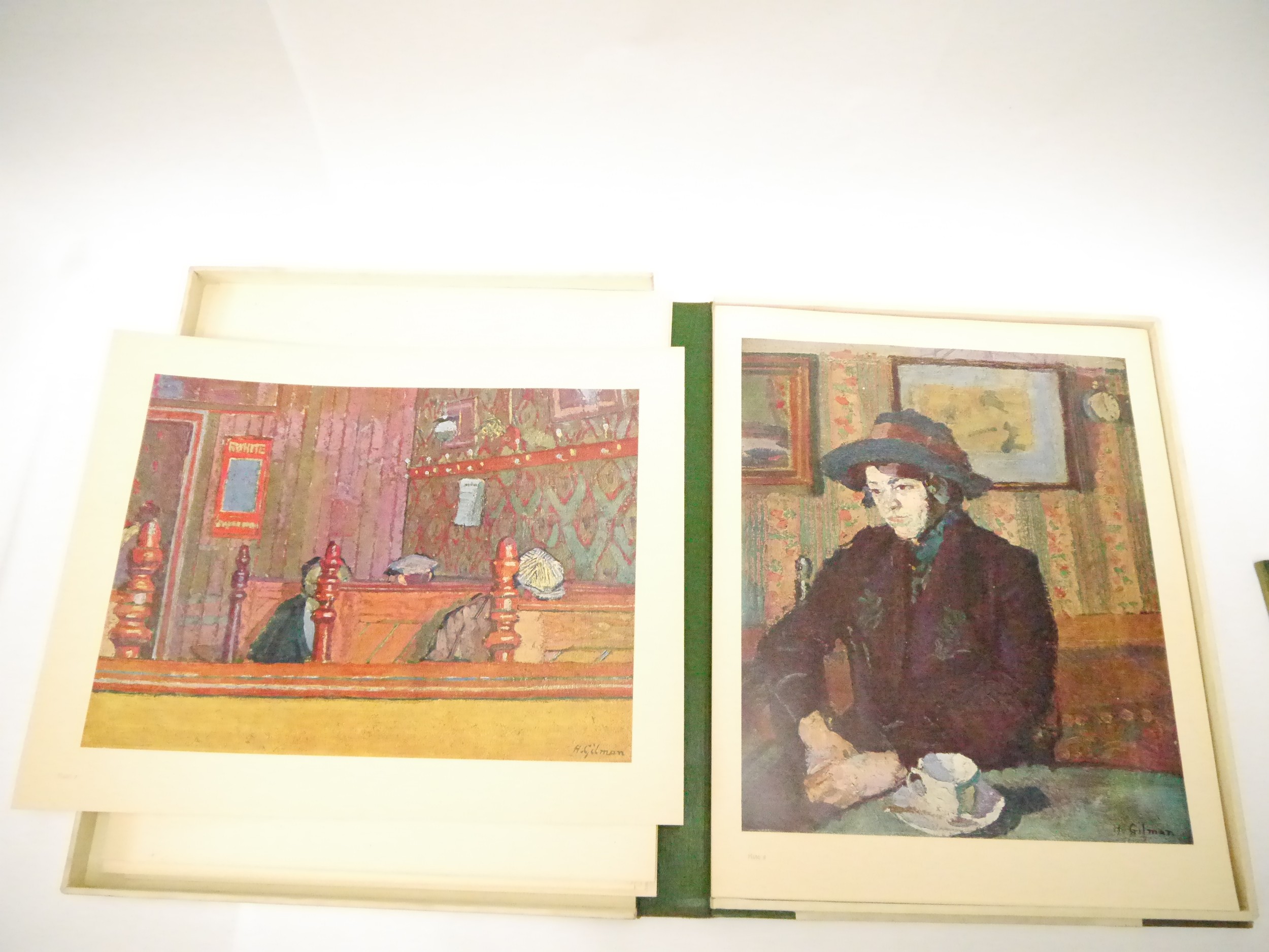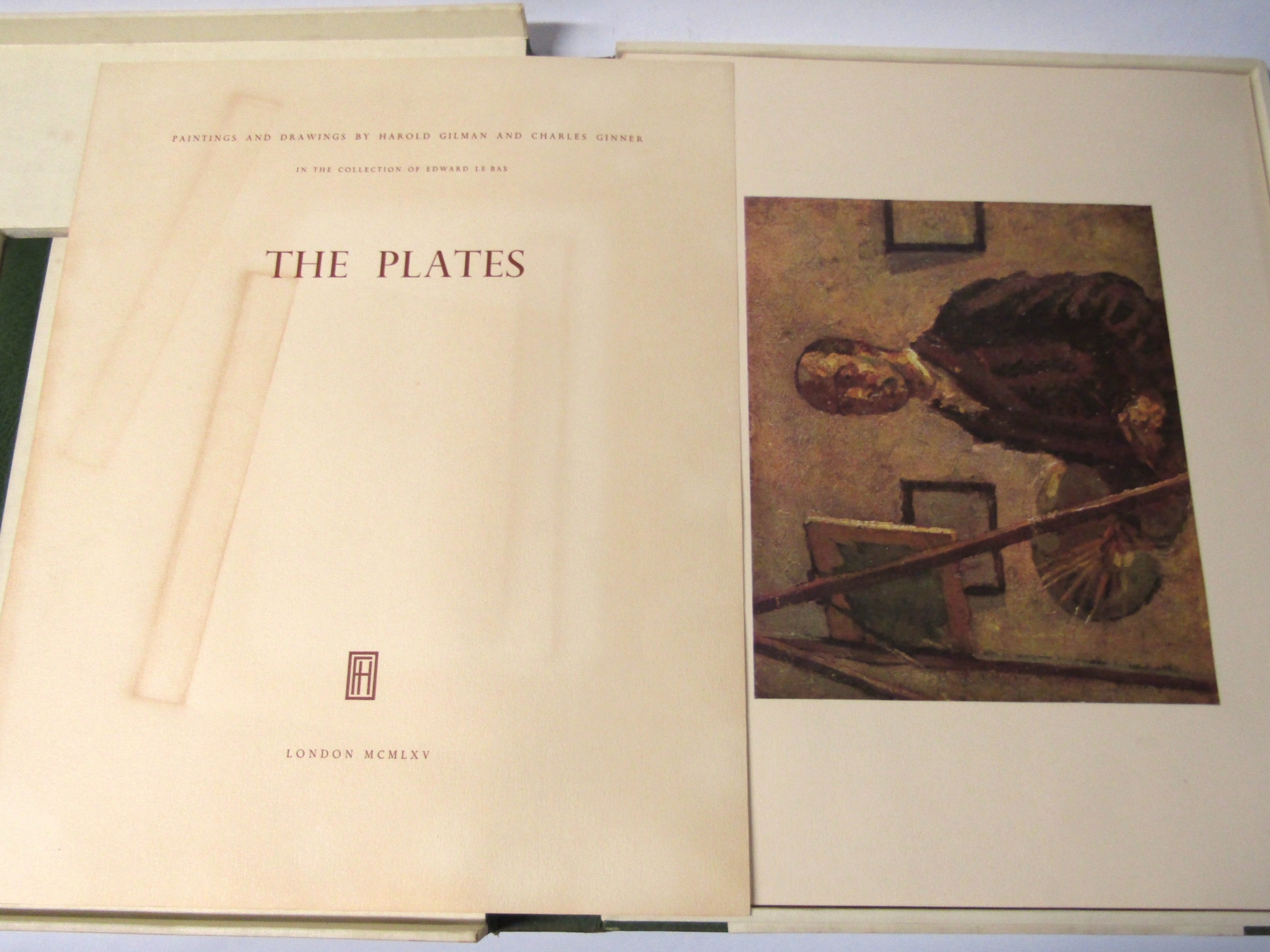 (Camden Town Group.) Harold Gilman (British 1876-1919) and Charles Ginner A.R.A. (British 1878-1952): 'Paintings and Drawings by Harold Gilman and Charles Ginner in the Collection of Edward Le Bas', London, Fairfax Hall, 1965, first edition, number 8 of 105 numbered copies only, 36 mounted colour plates after paintings by Gilman or Ginner, printed on a special making of Cowan paper, leaves approx. 51 x 41cm, with uniform title page leaf, limitation/copyright statement verso (title page with toning, leaves of plates with some very minor toning, else generally plates very clean/VGC), text volume 49,[1]pp, foreword by the publisher, essays on each of the artists, another on the Camden Town Group by Ginner, and descriptions of the plates, hand printed by the publisher on Hodgkinson hand made paper, 25 x 19cm, original quarter green morocco gilt over cream buckram, top edge gilt, all housed together in original green quarter morocco gilt portfolio, 54 x 44cm. Formerly from the collection of Denys Sutton (1917-1991), art critic and historian